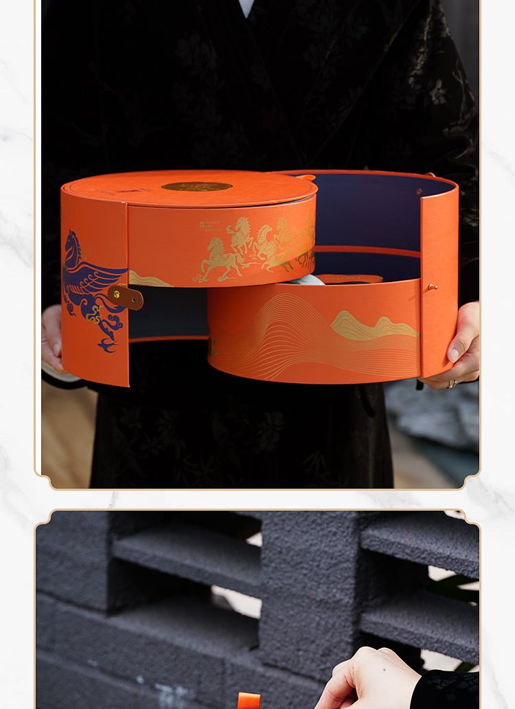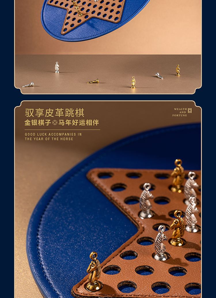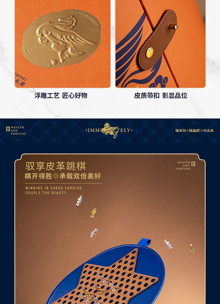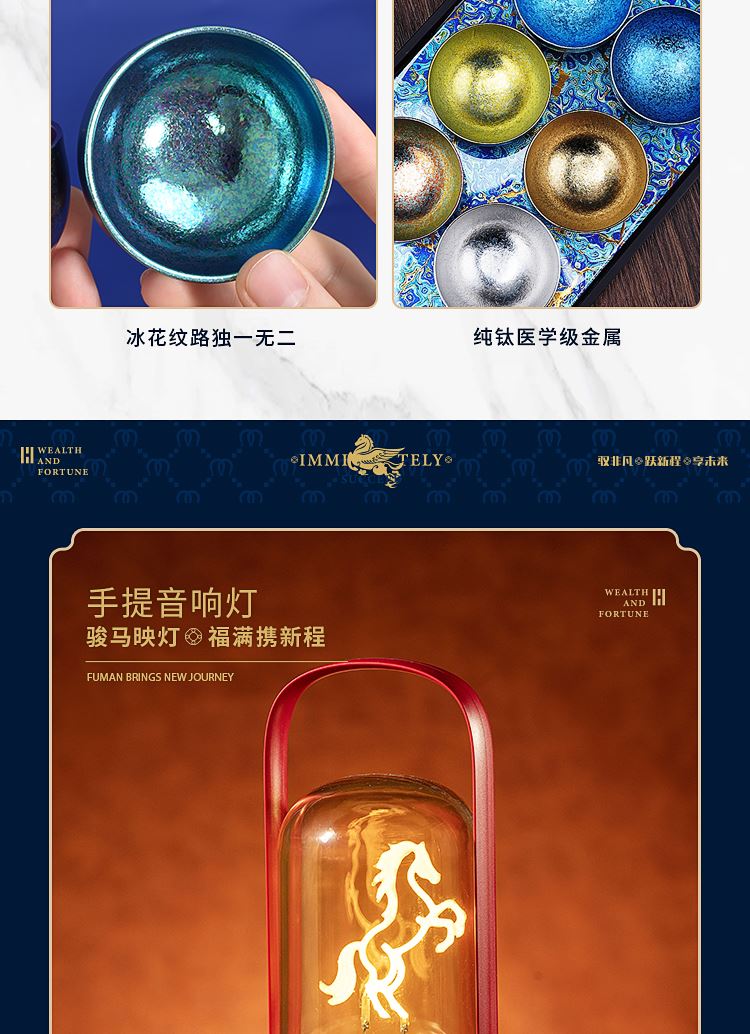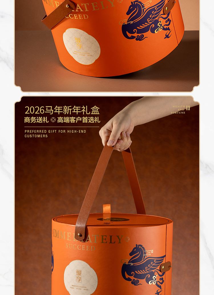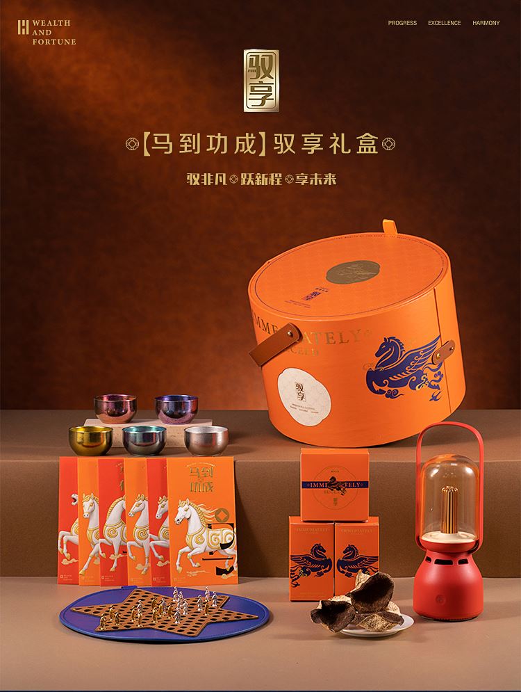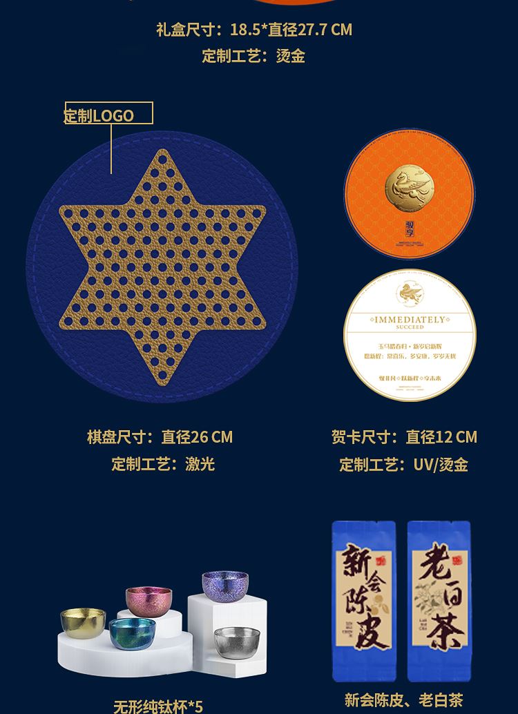 礼品配置清单: 双层主题礼盒、团圆皮革棋盘、马头棋子、五行钛杯、复古灯加蓝牙音响、新会陈皮1盒、老白茶1盒、新年红包、礼盒