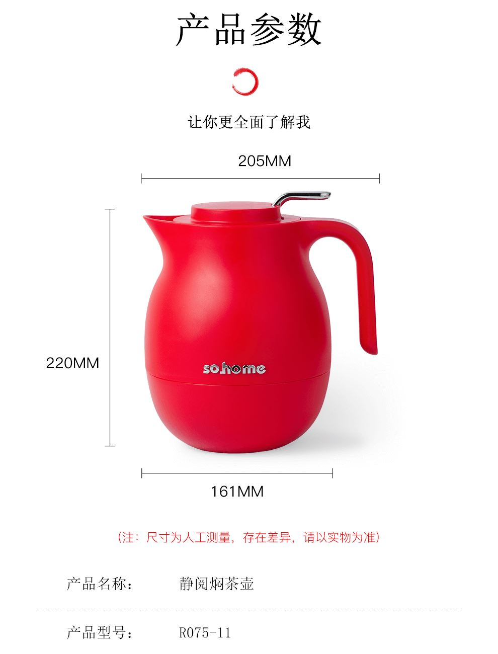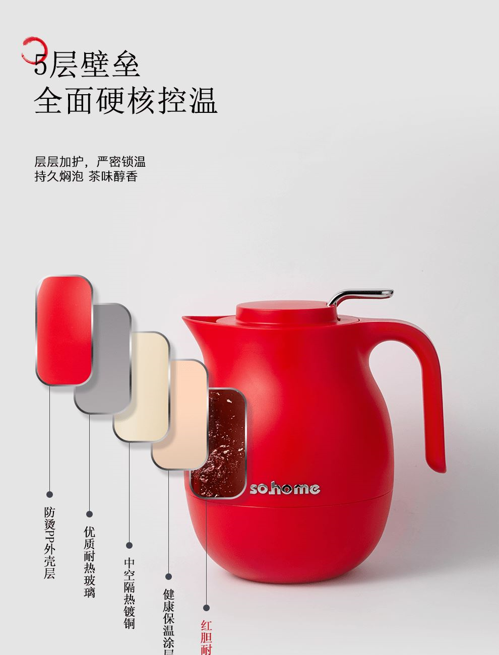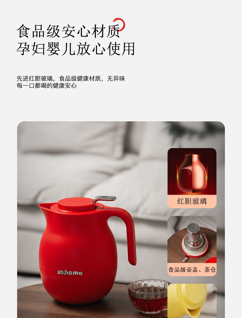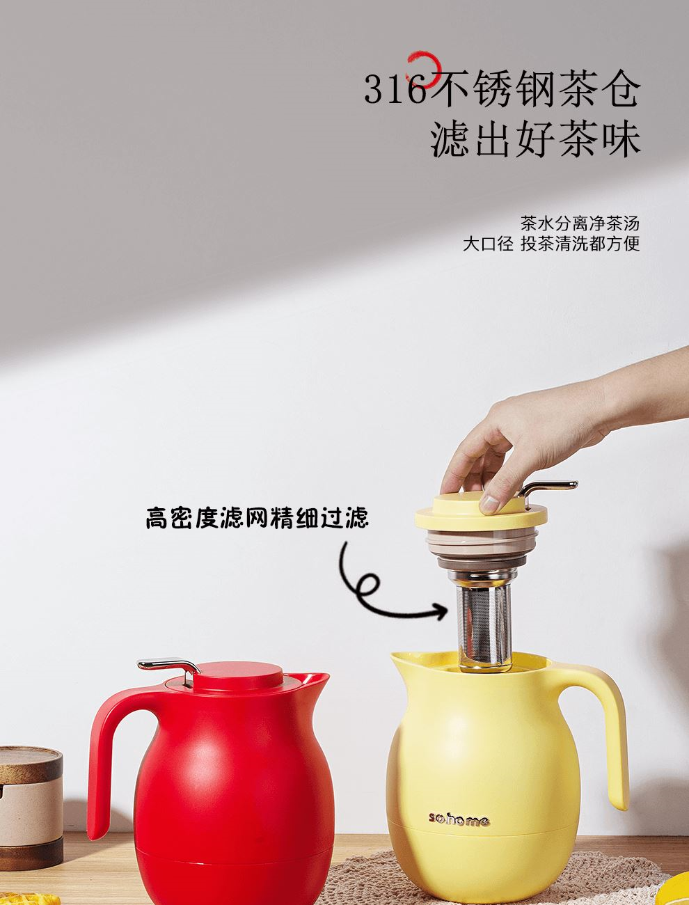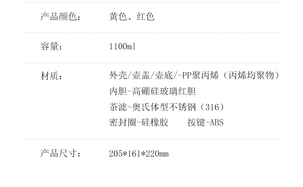 产品容量:1100ML 产品材质:外壳/壶盖/壶底/-PP聚丙烯(丙烯均聚物)、 内胆-高硼硅玻璃红胆 茶滤-奥氏体型不锈钢(316) 密封圈-硅橡胶 按键-ABS 产品颜色:红色、黄色 1、大容量316不锈钢茶仓,茶水分离,省心省力; 2、一键按压式出水,单手操作很轻松,把手握持舒适; 3、密封防漏,倾倒不漏水; 4、一键按压出水,倒茶水流顺畅,不挂壁; 5、红胆玻璃内胆,48小时保温,底部更耐压,材质更稳定。