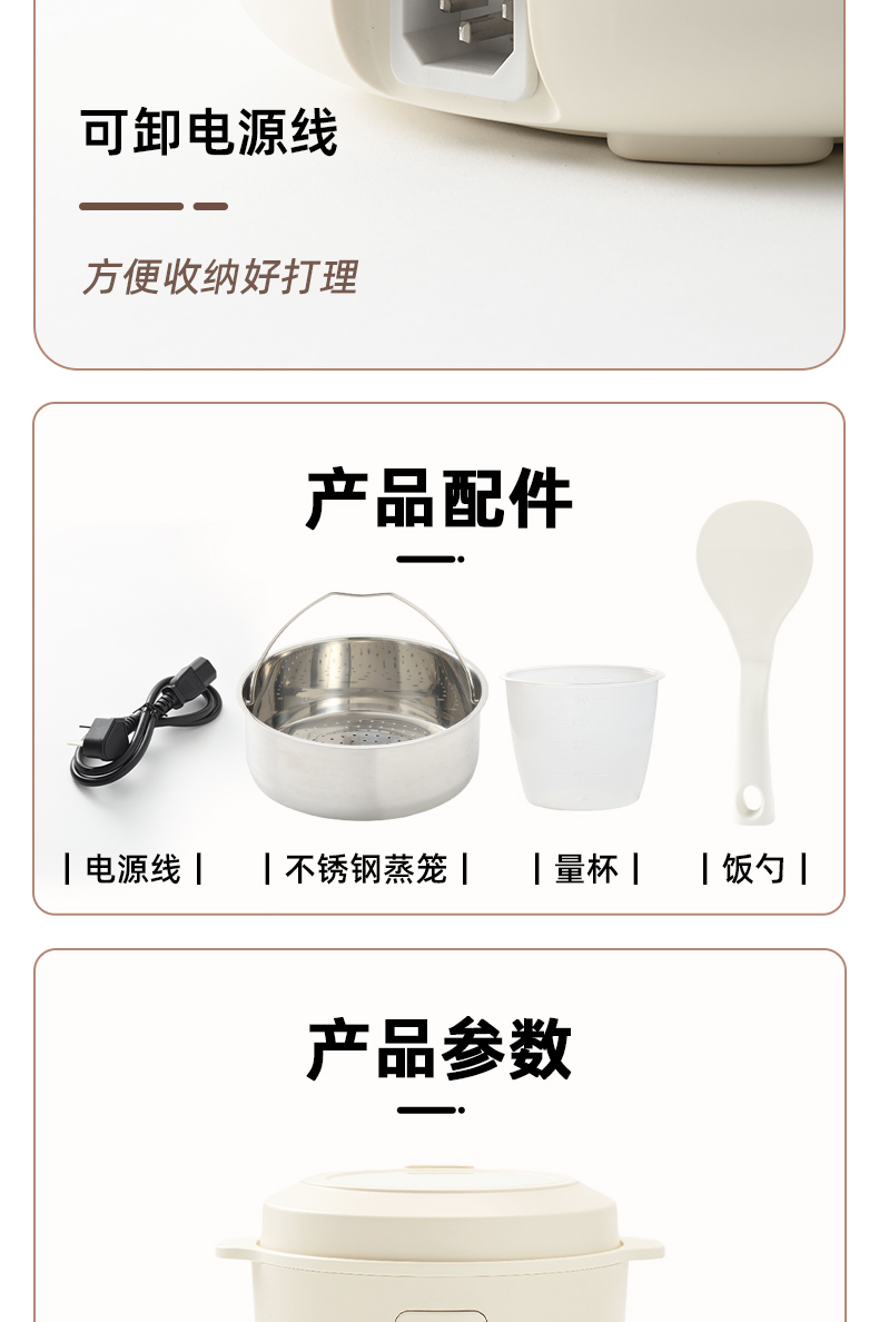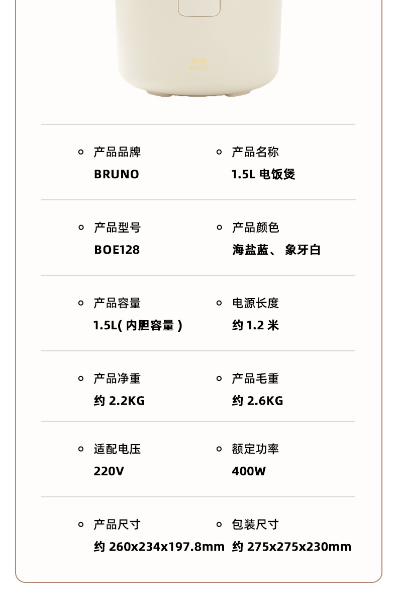 产品型号:BOE128 产品颜色:海盐蓝,象牙白 产品容量:1.5L(内胆容量) 额定功率:400W 产品净重:约2.2KG 产品毛重:约2.6KG 产品尺寸:约260*234*197.8mm 包装尺寸:约275*275*230mm