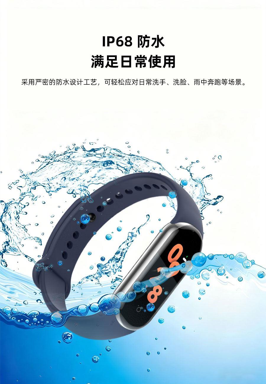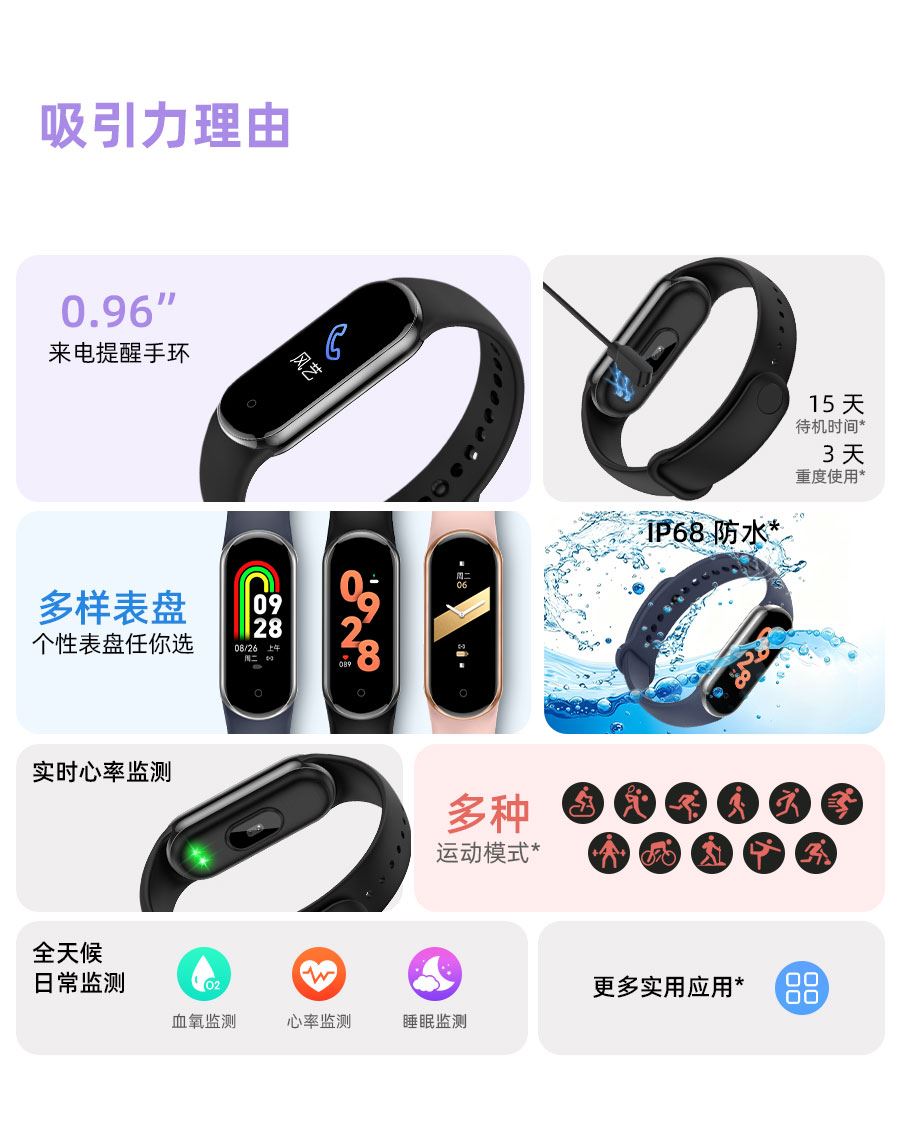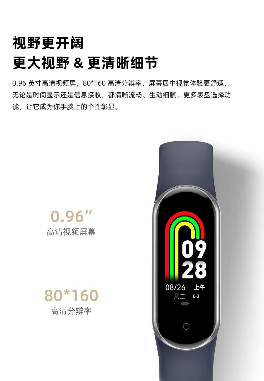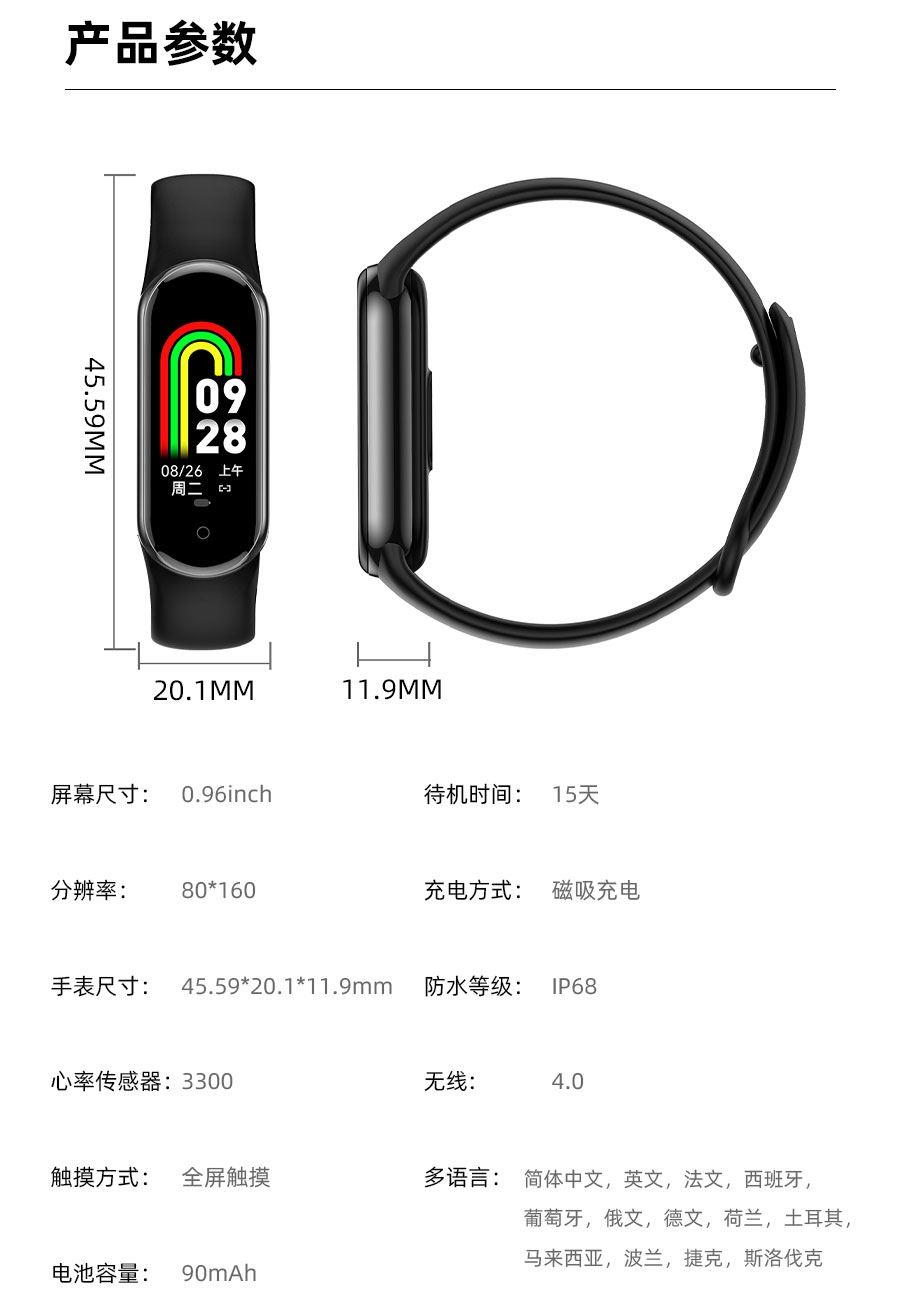 0.95inch高清大屏、80*160分辨率、心率、血压,睡眠监测、多种运动模式、计步器、闹铃、信息提醒、来电提醒、IP68防水、支持多种语言、磁吸充电