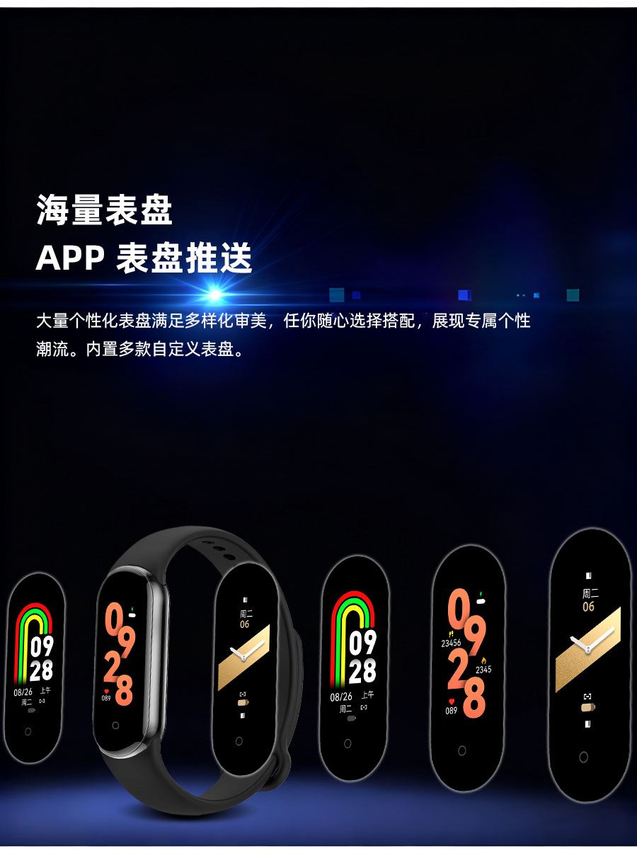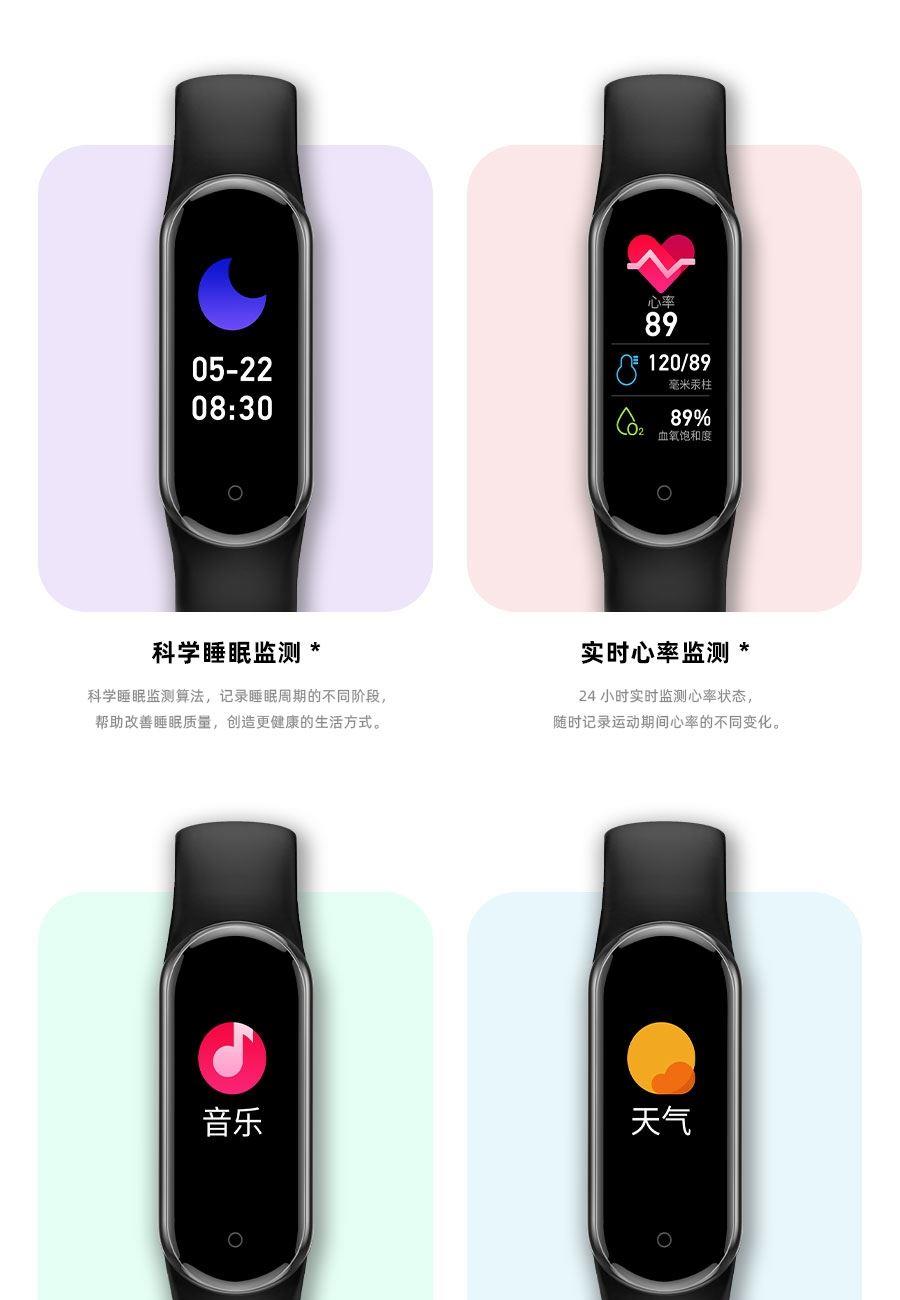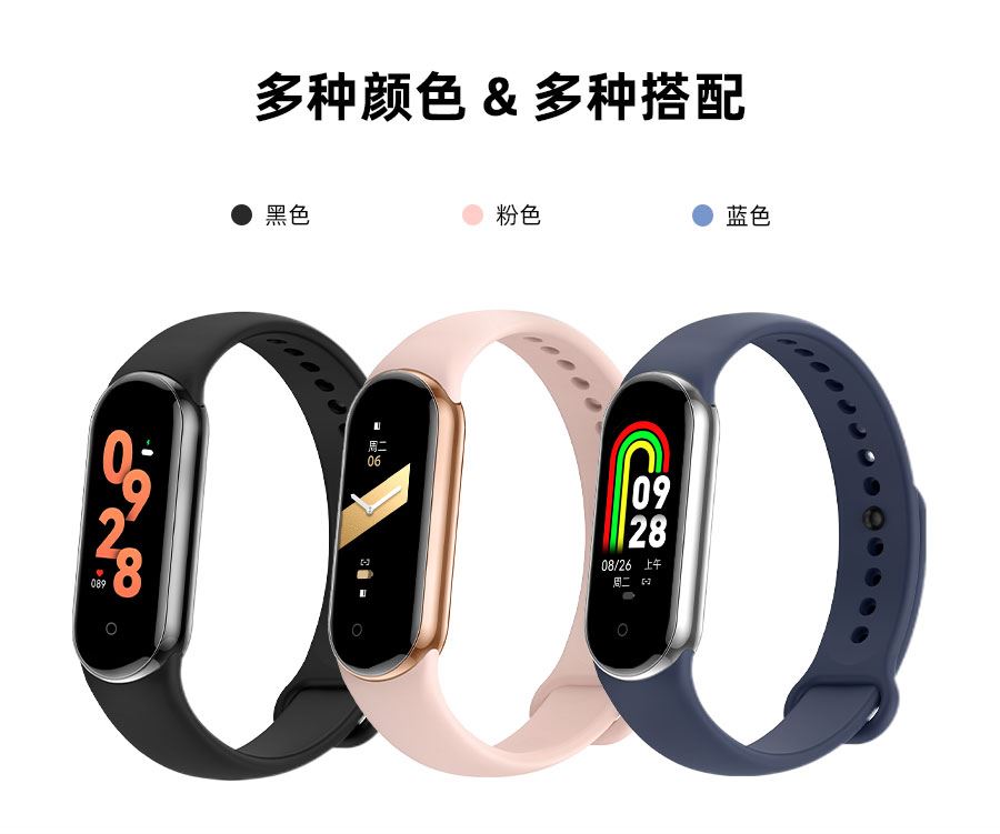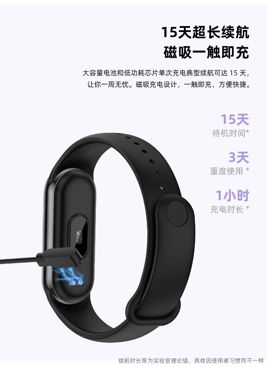 0.95inch高清大屏、80*160分辨率、心率、血压,睡眠监测、多种运动模式、计步器、闹铃、信息提醒、来电提醒、IP68防水、支持多种语言、磁吸充电