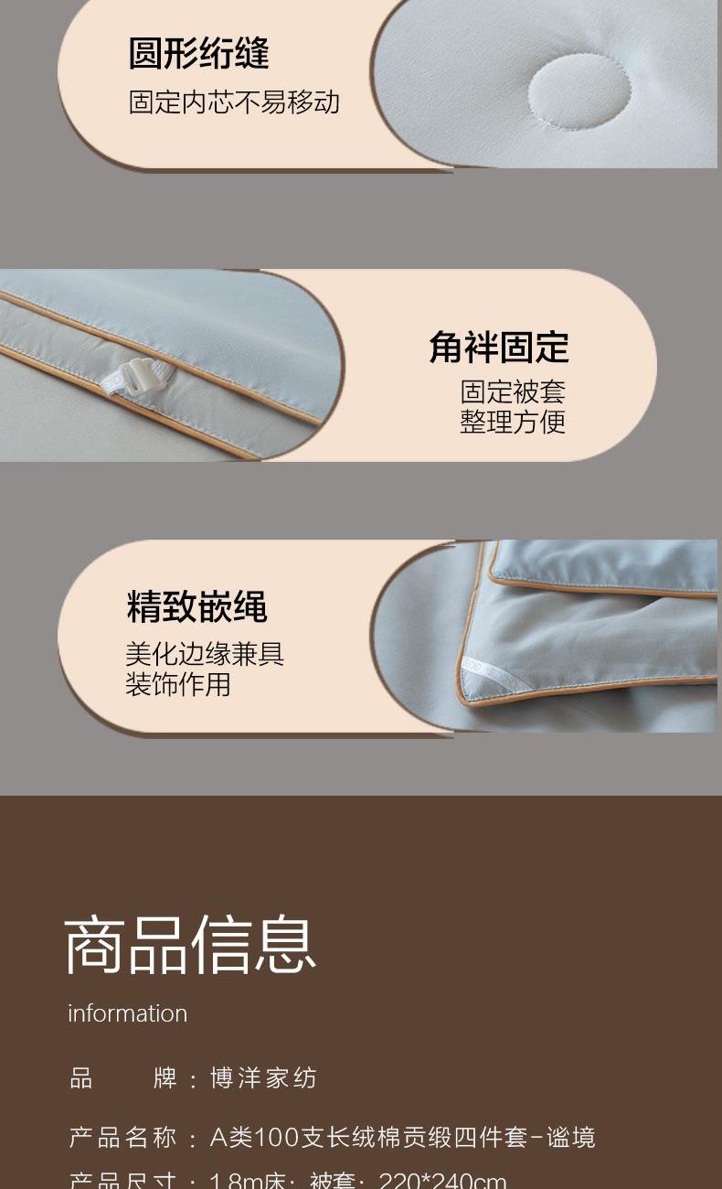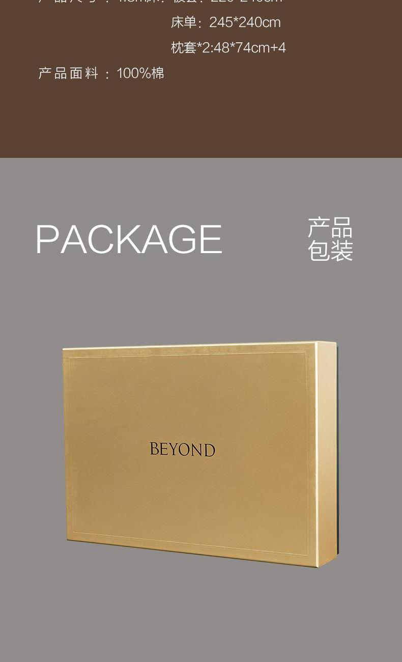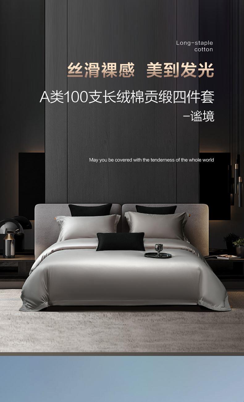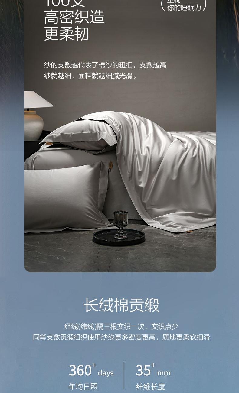 产品规格:1.8m(6英尺)床: 被套:220*240cm 床单:245*240cm 枕套*2:48*74cm 产品材质:棉 1、甄选优质100S长绒棉,棉纤维细腻柔长洁白无杂质,织造的棉纱柔长有泽。 2、100S高精密 ,贡缎织造工艺,触感柔软色牢度高,细腻有光泽,如丝如缎,面料厚实细腻,亲肤顺滑。 3、包边严密,立体感强,床品垂感十足,美观大方易打理。
