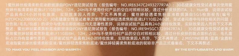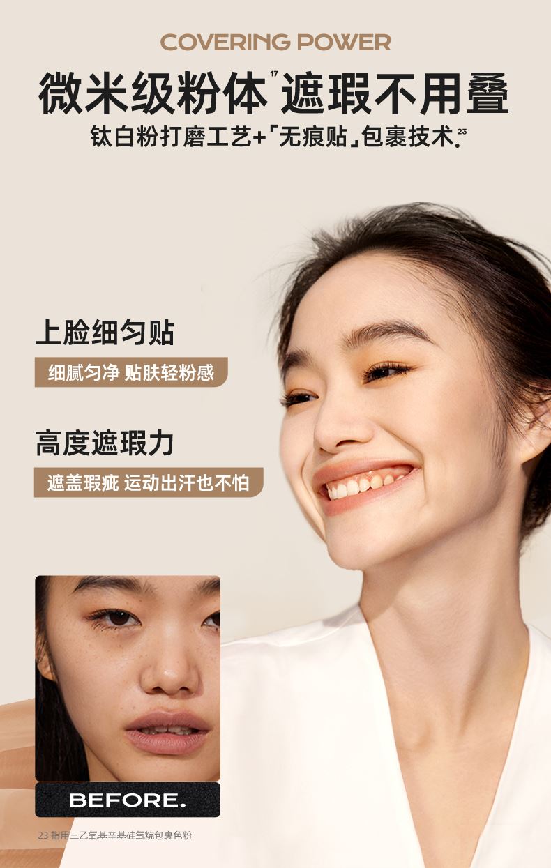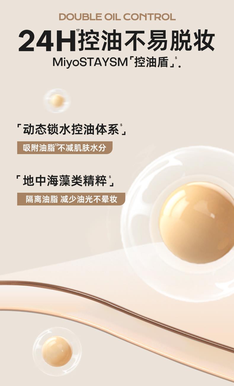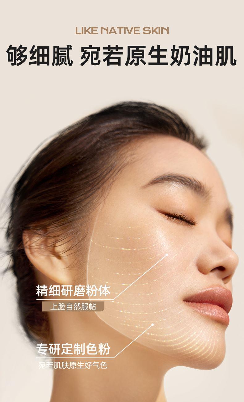 1、 奶霜质地 半透妆感 奶霜质地,绵密易铺展。定制色粉,修饰每寸肌肤,色粉表面干法处理工艺,更稳定和均匀,高倍柔焦肌肤。 2、 微米粉体 更加贴服 0.2—0.3微米级气流研磨球形粉末,亲油疏水粉体。防汗持妆,保持肌肤清爽细腻。 3、 高折光率油脂取代传统单一云母提亮 双重提亮,减少堵塞毛孔的同时,柔亮肌肤。 4、多重养护添加 风格守护美肌 依克多因搭配泛醇,修复肌肤屏障,舒敏。 虾青素搭配麦角硫因,高倍抗氧,对抗肌肤暗沉。 福瑞达玻尿酸搭配燕麦提取物,深度补充肌肤水分
