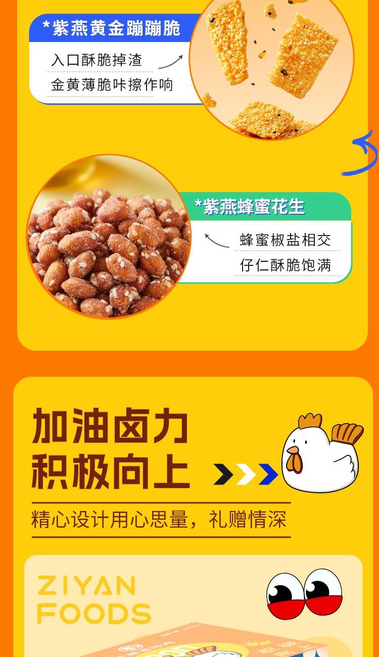 紫燕甜辣鸭脖60g*1 紫燕虎皮凤爪(卤香味)(单只)30g*1 紫燕虎皮凤爪(卤香味)(单只)30g*1 紫燕去骨凤爪(柠檬味)(单只)24g*1 紫燕红油竹耳丝60g*1 紫燕脆滑厚海带片(红油海带片)60g*1 紫燕金樽素鲍(红油素鲍鱼)60g*1 紫燕黄金蹦蹦脆(玉米锅巴牛肉味)135g*1 紫燕藤椒鸡风味青豆脆(川香青豆)60g*1 紫燕蜂蜜花生(椒盐味)25g*1 紫燕蜂蜜花生(椒盐味)25g*1 礼盒+组装+外盒