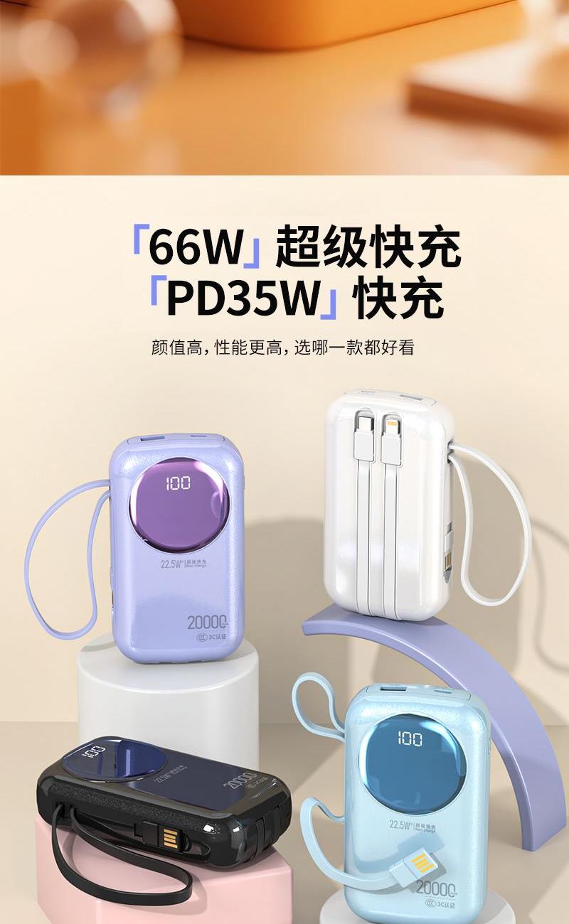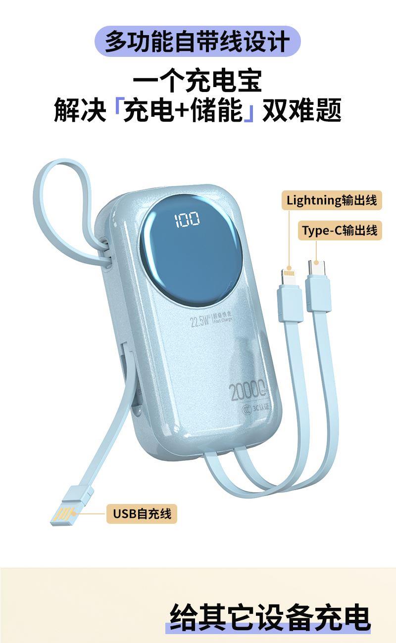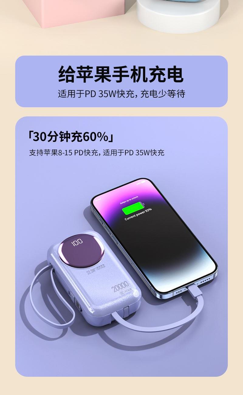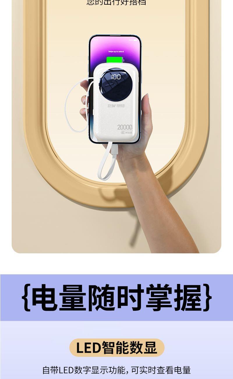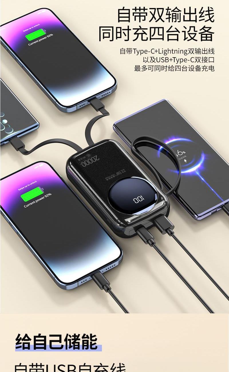 1. 30分钟充60%支持苹果8-15 PD快充,适用于PD 35W快充; 2. 出门无需自带线,1个充电宝解决「充电+储能」双难题; 3. 自带Type-C+Lightning双输出线以及USB+Type-C双接口可同时给四台设备充电; 4. 一线两用 方便携带,既是自充线也是手提绳; 5. 可携带登机,符合航空运输标准,您的出行好搭档; 6.LED智能数显,自带LED数字显示功能,可实时查看电量;