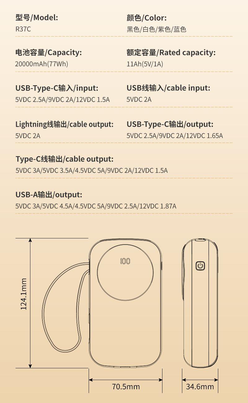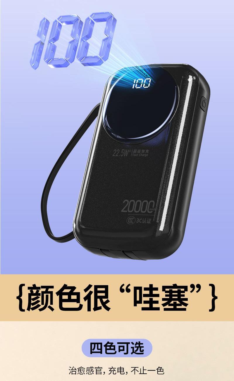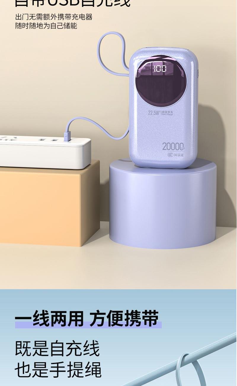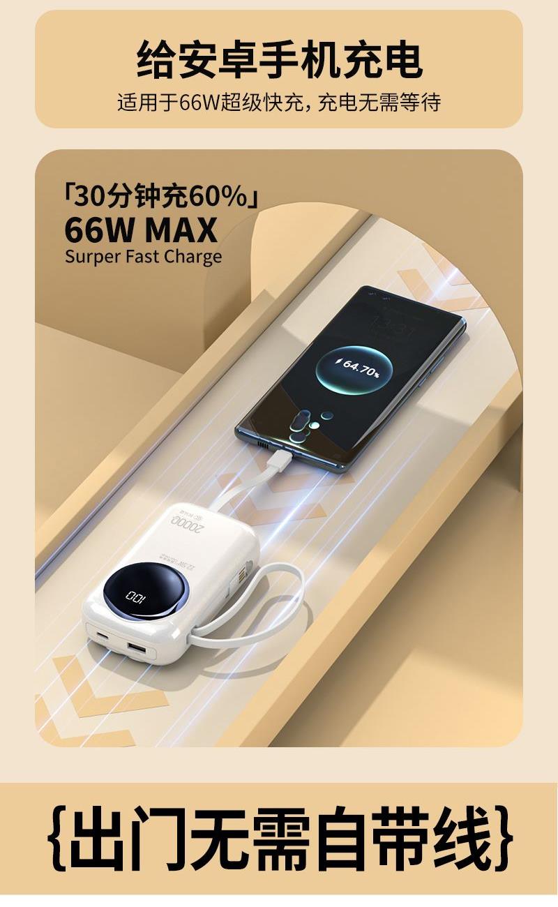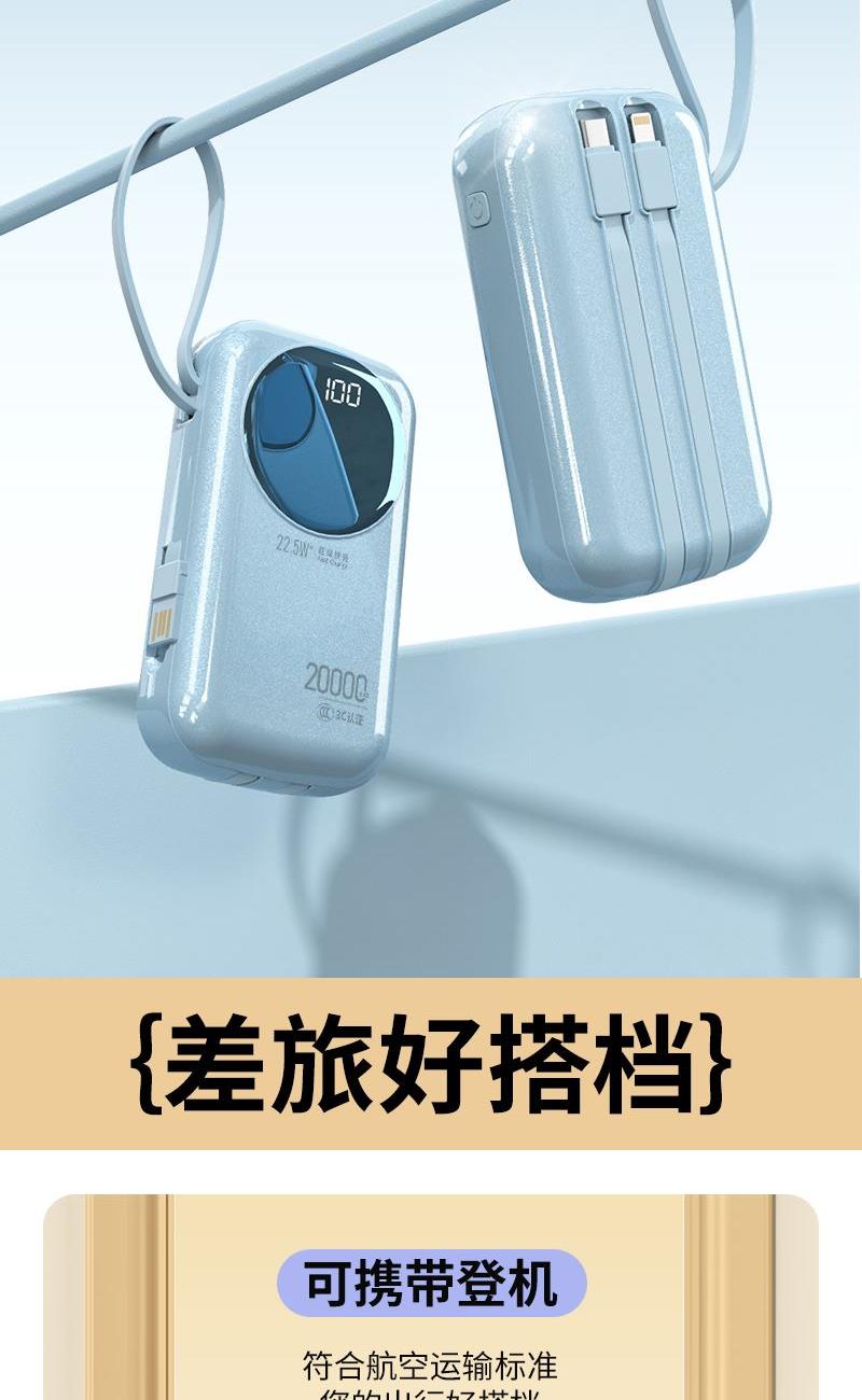 1. 30分钟充60%支持苹果8-15 PD快充,适用于PD 35W快充; 2. 出门无需自带线,1个充电宝解决「充电+储能」双难题; 3. 自带Type-C+Lightning双输出线以及USB+Type-C双接口可同时给四台设备充电; 4. 一线两用 方便携带,既是自充线也是手提绳; 5. 可携带登机,符合航空运输标准,您的出行好搭档; 6.LED智能数显,自带LED数字显示功能,可实时查看电量;