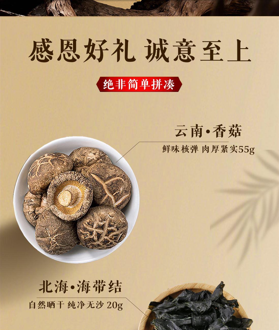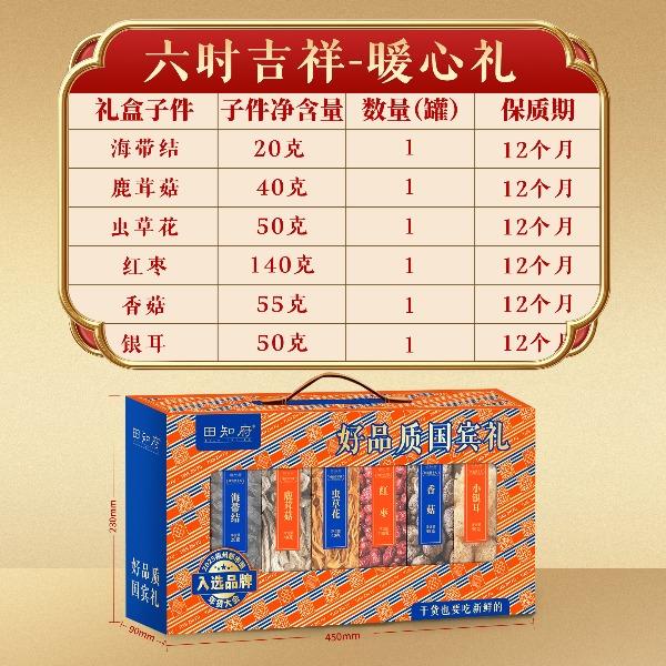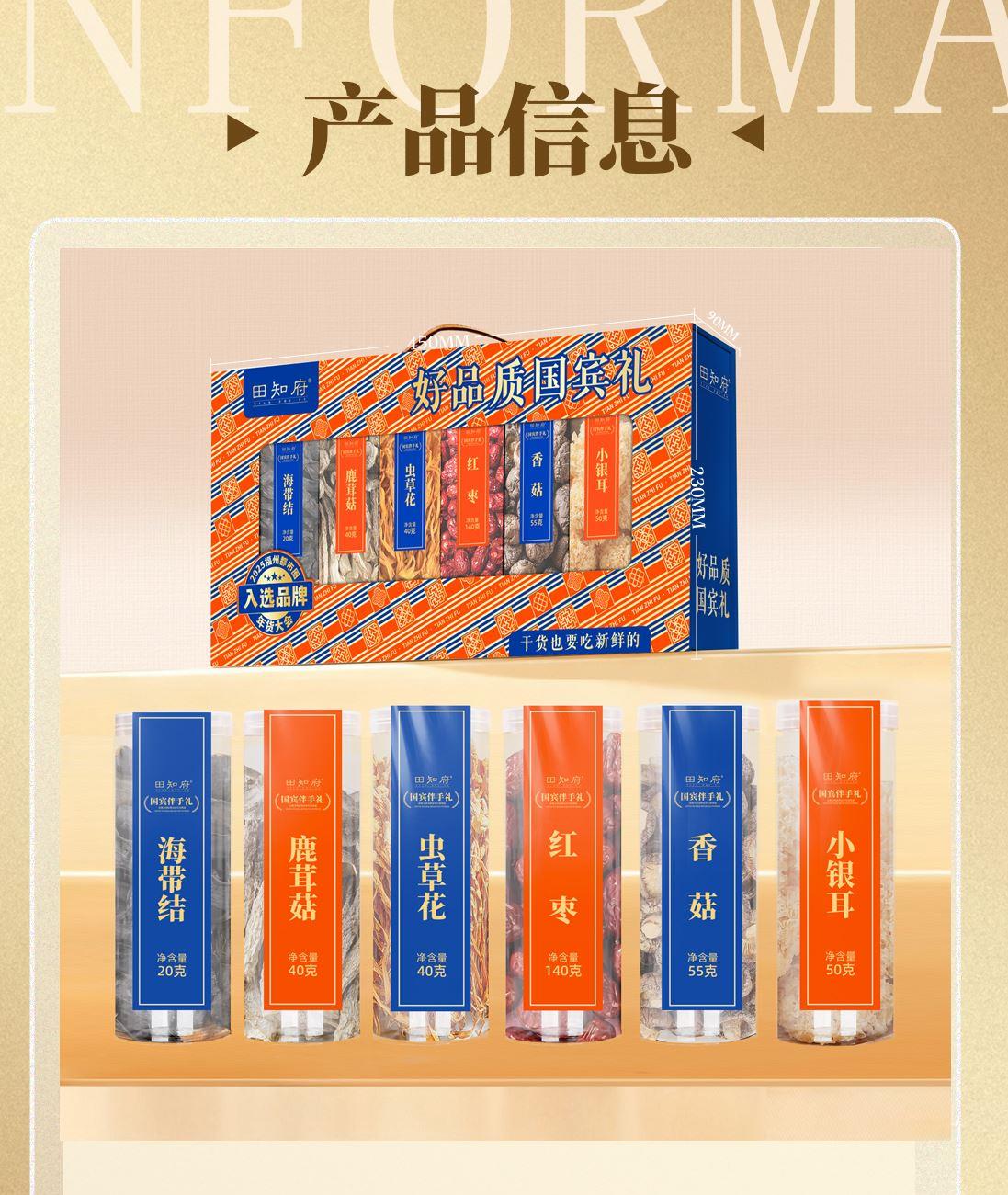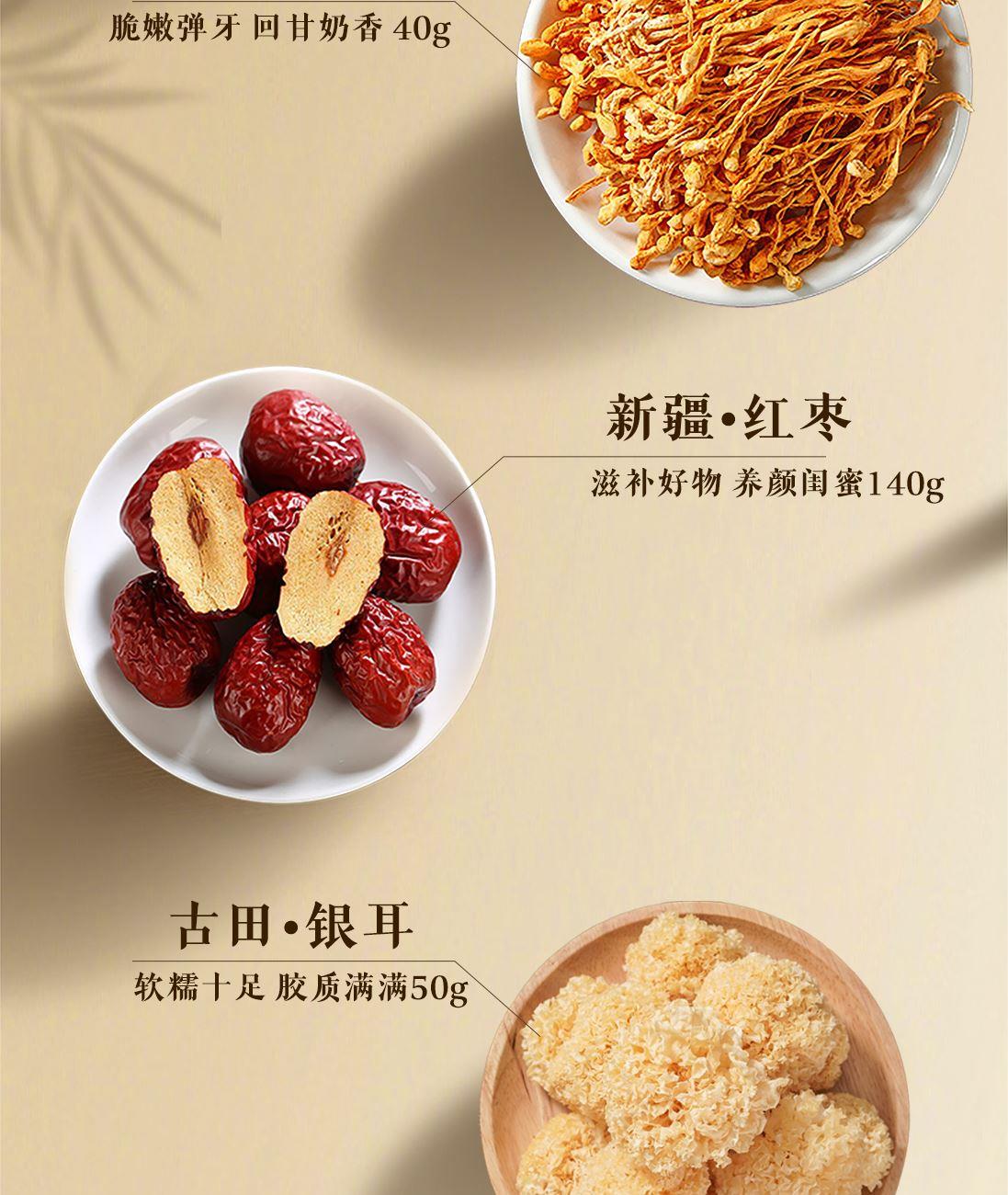 配置:海带结20g、鹿茸菇40g、虫草花40g、红枣140g、香菇55g、银耳50g 商品规格:345g/盒 产品尺寸:450*230*90mm 保质期:12个月 京东自营销量好评1w+,源头工厂,支持项目授权,项目保护