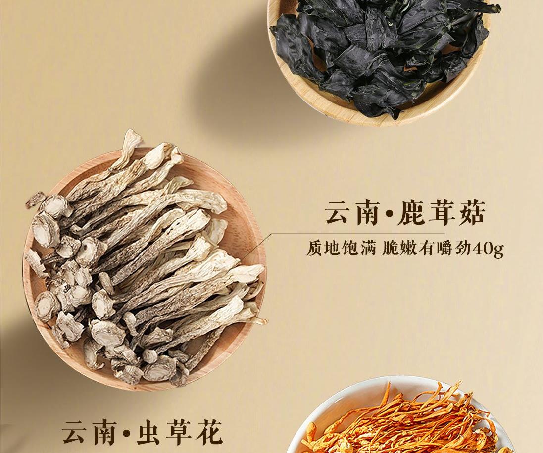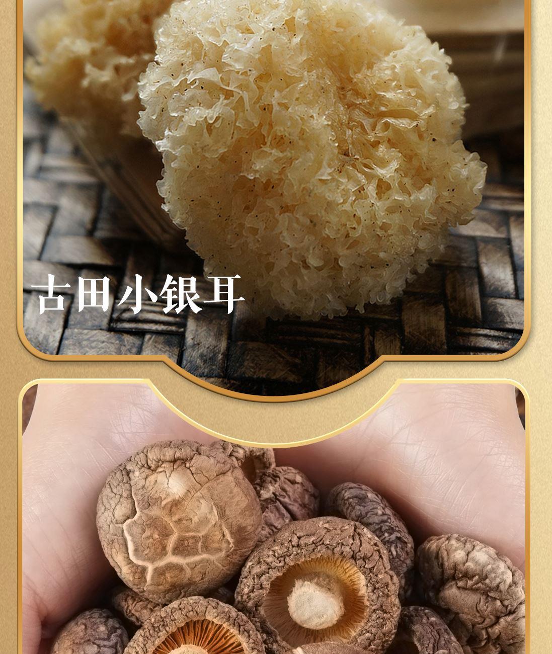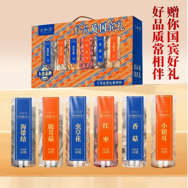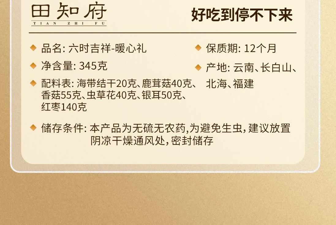 配置:海带结20g、鹿茸菇40g、虫草花40g、红枣140g、香菇55g、银耳50g 商品规格:345g/盒 产品尺寸:450*230*90mm 保质期:12个月 京东自营销量好评1w+,源头工厂,支持项目授权,项目保护