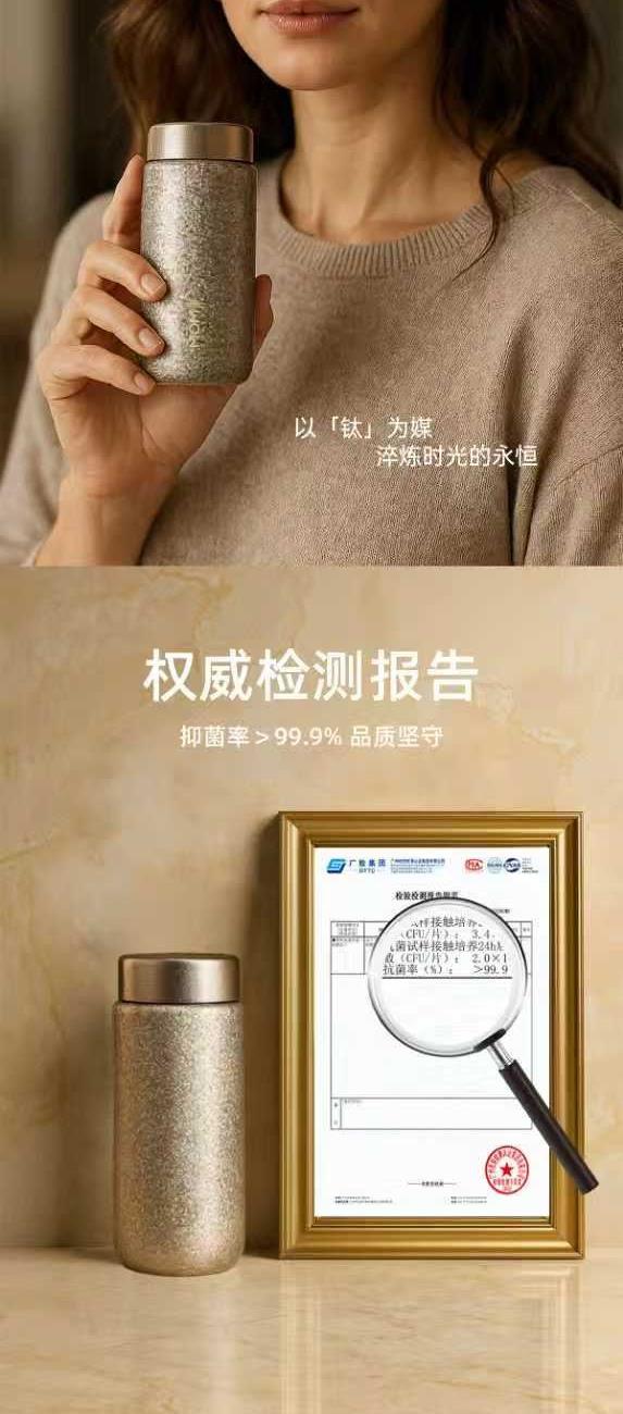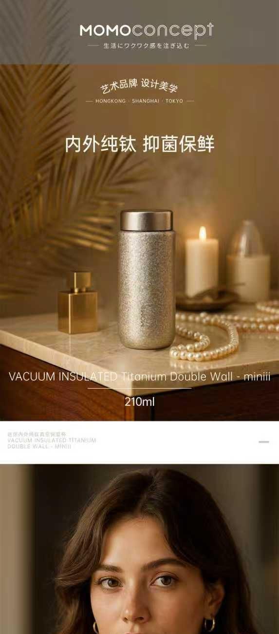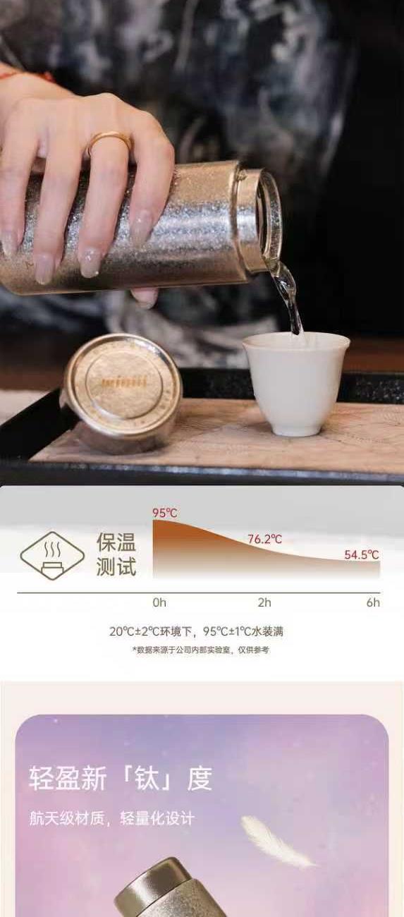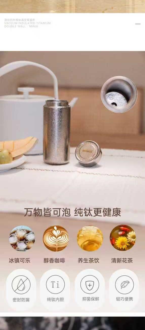 产品材质:纯钛(含钛99%以上)杯体内胆-钛TA1/杯体外壳-钛TA1内盖塑件-食品接触用PP密封圈-硅橡胶 容 量:210ML 口 径:36mm 颜 色:晶耀-白 产品尺寸:57*57*137.5mm 产品净重量:116.5 整箱数:12只/箱 产品卖点:轻盈新「钛」度 航天级材质,轻量化设计 随行装包,无惧漏水专为小包设计 多种场合 轻松驾驭 商务办公 居家美学