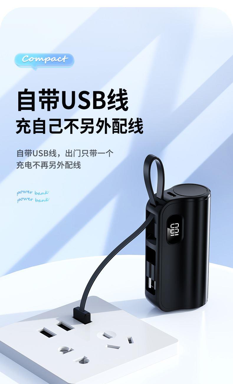 口袋胶囊自带线移动电源K13 型 号: K13 电池 :21700*1pcs 电池类型 :21700电芯 容量:5000mAh 材质 :ABS+PC 尺寸 :78*47*25MM 功能特点 仅口红般大小,精巧玲珑; 5000毫安容量,应急高手,保证顺畅沟通; 自带苹果接口和Type-c尾插接口,带USB充电线,各种机型轻松应对