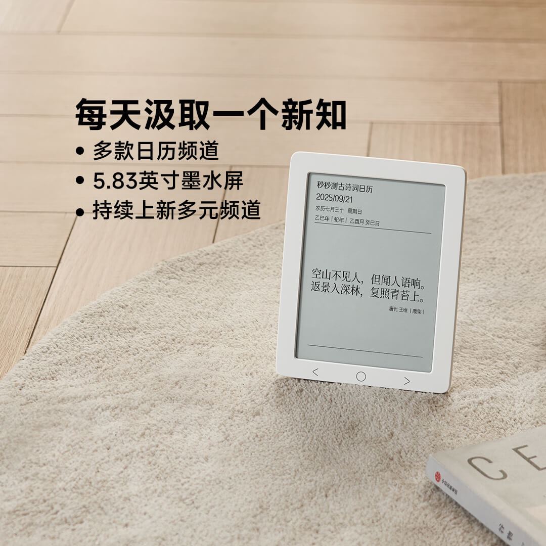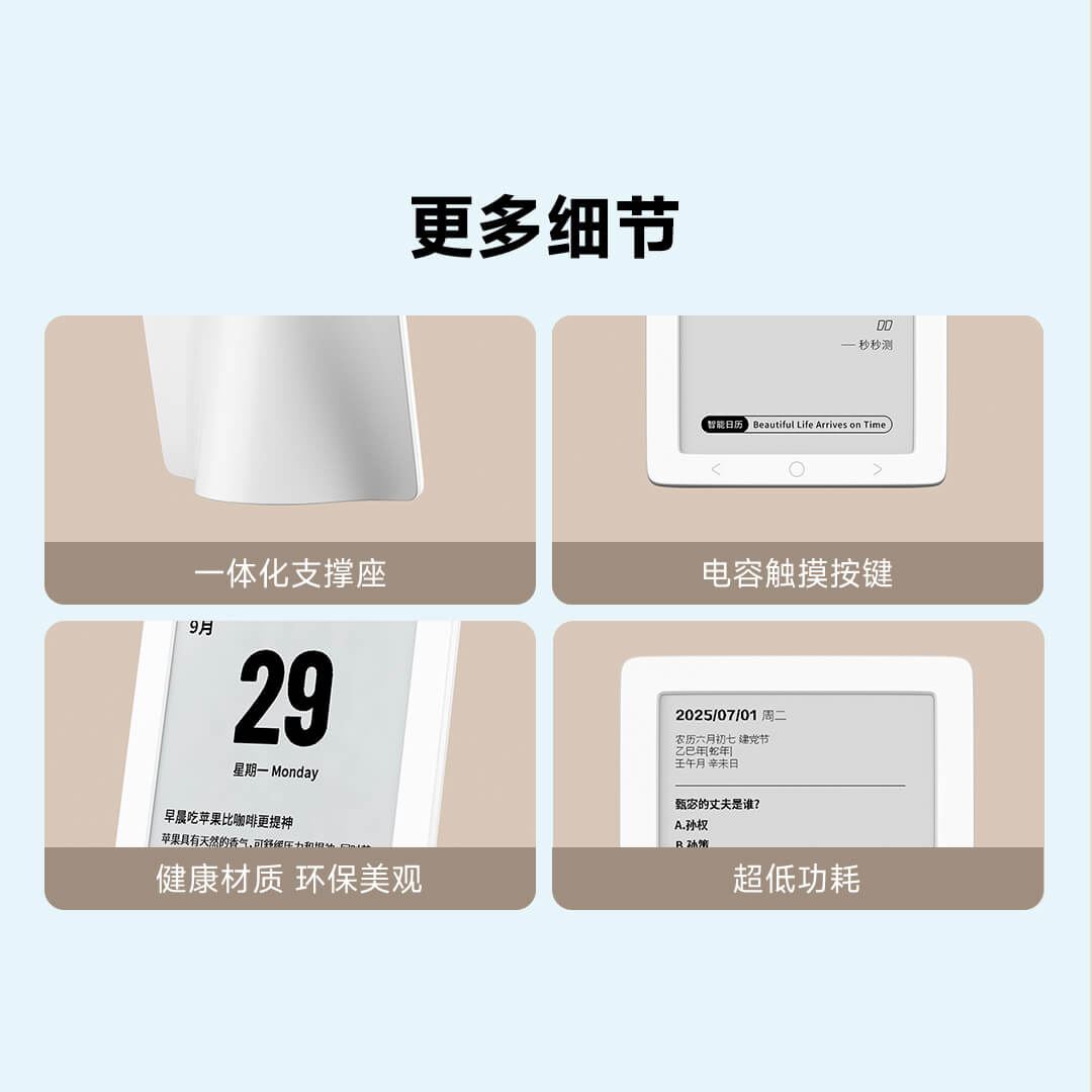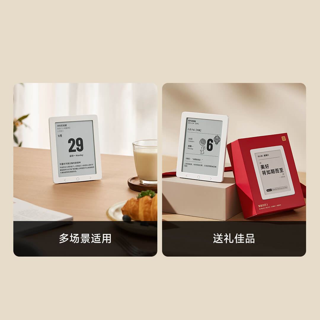 显示屏:5.83英寸电子墨水瓶 产品尺寸:142.5*112*40mm 外包装尺寸:163*130*47mm 中央处理器:ESP32-WROOM-32U 无线连接:Wifi/BLE(2.4G) 塑胶外壳:ABS+PC 按键:外置*3 额定功率:3W 工作电压:6V 电池:7号碱性电池(4节) 多款日历频道 一站式拥有 送礼佳品 低调内敛 多场景应用 享受智能生活