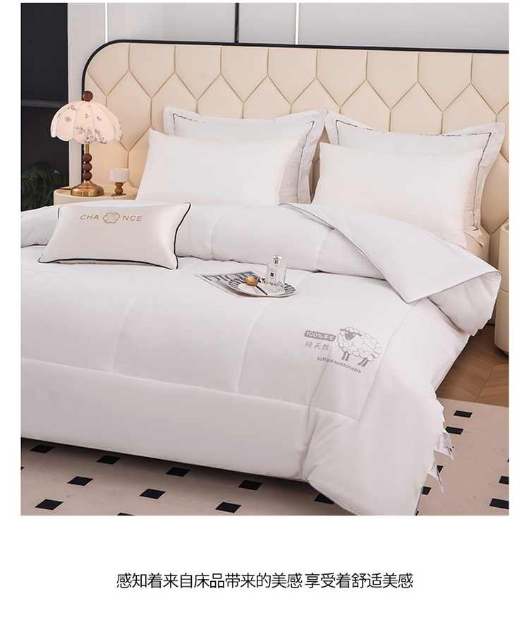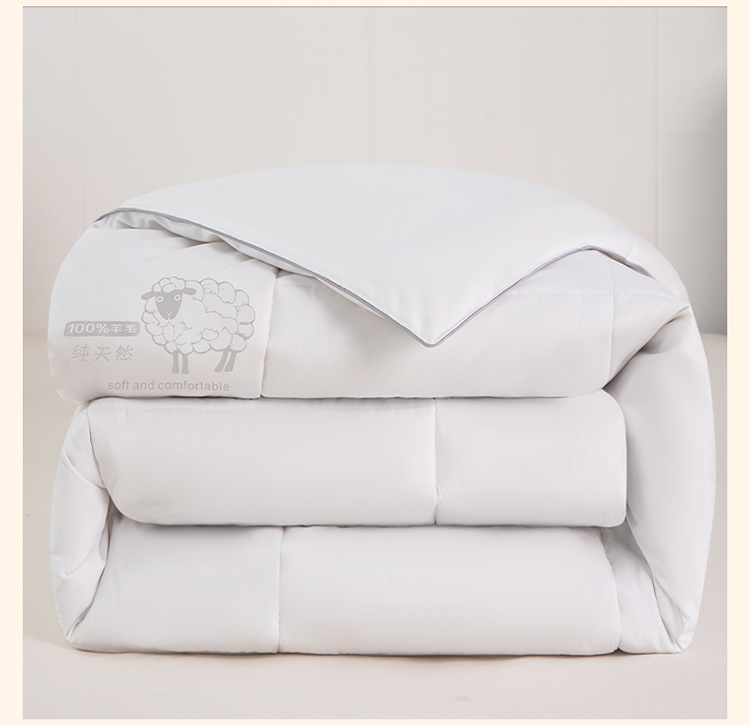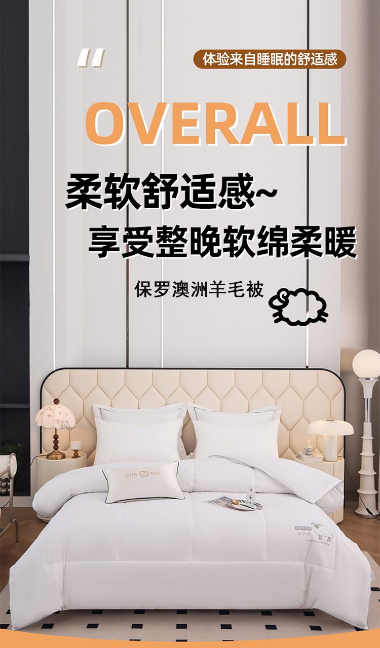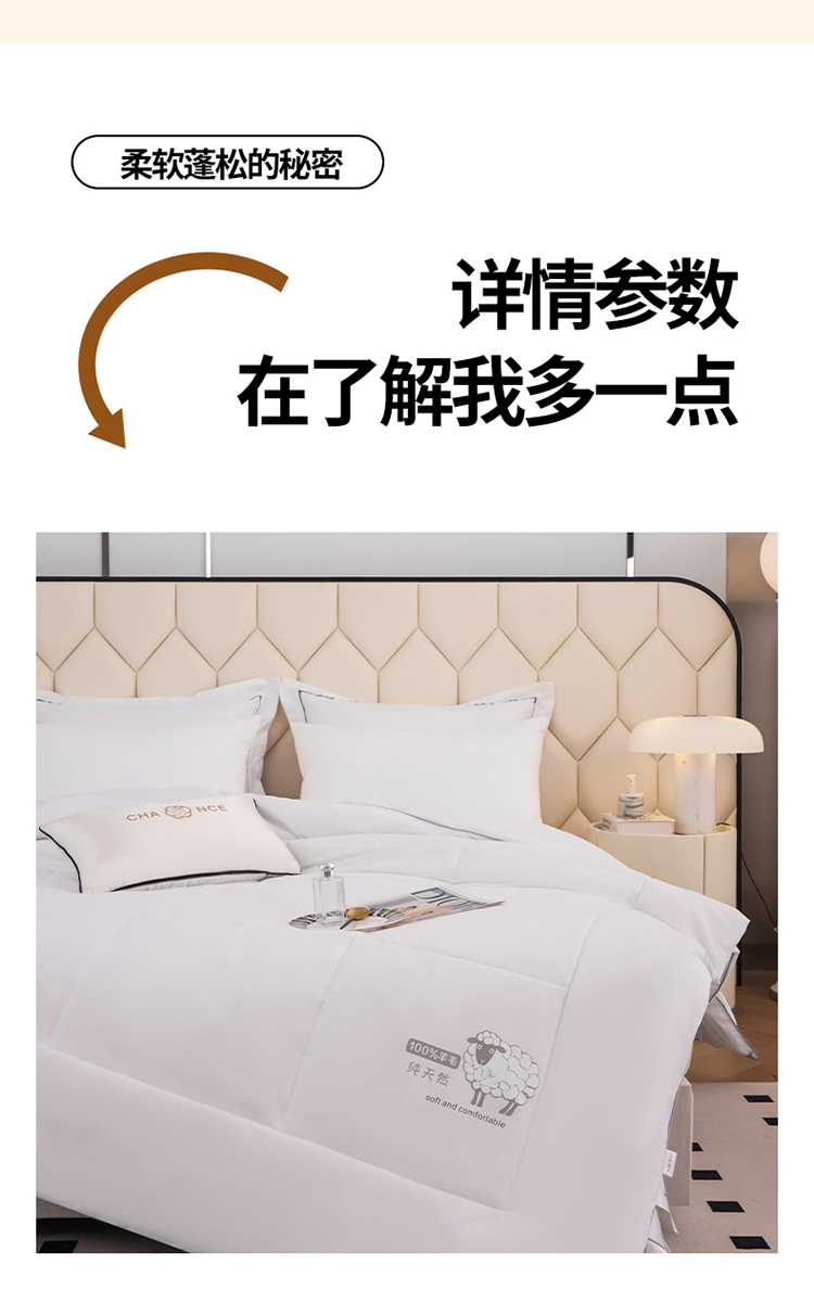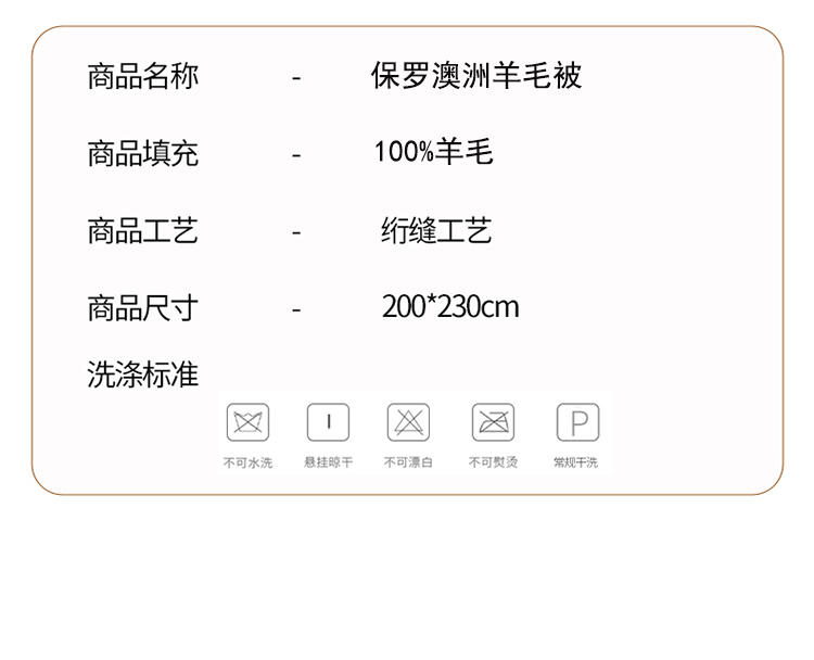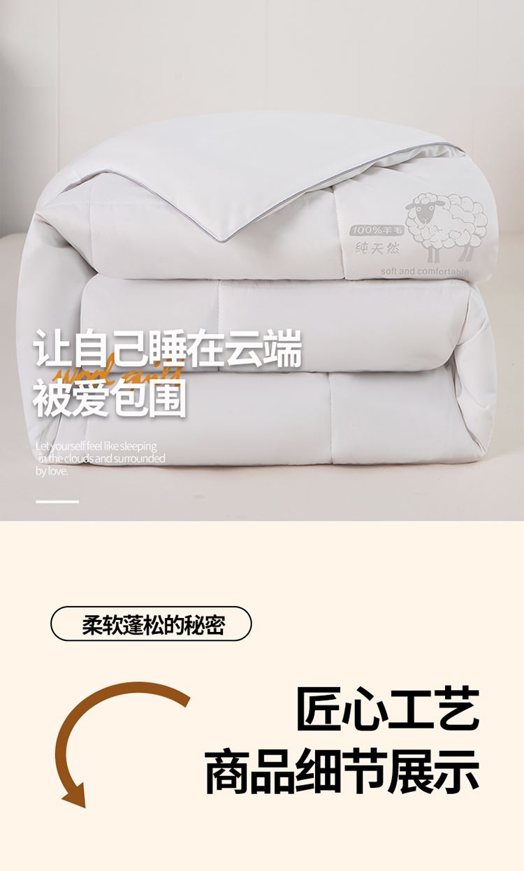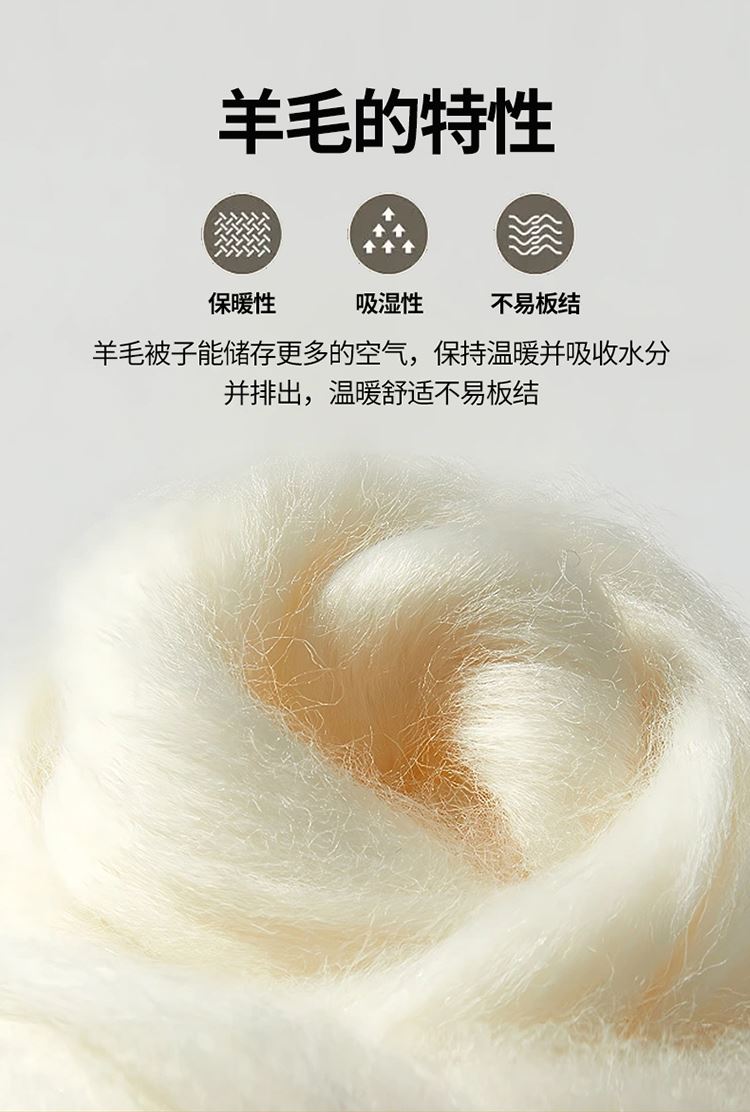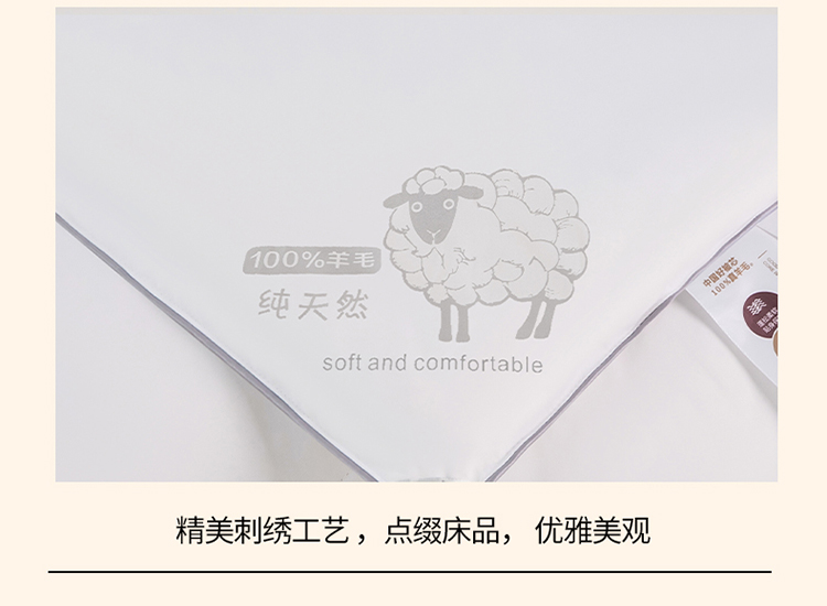 面料材质:亲肤棉 填 充:纯羊毛 产品规格:200*230cm 克 重:1900g 产品包装:精美礼盒 包装尺寸:50*40*20cm 1.高支亲肤棉细腻柔软,手感丝滑舒适,优雅美观。 2.羊毛被能储存更多的空气,保持温暖并吸收水分并排出,温暖舒适不易板结。