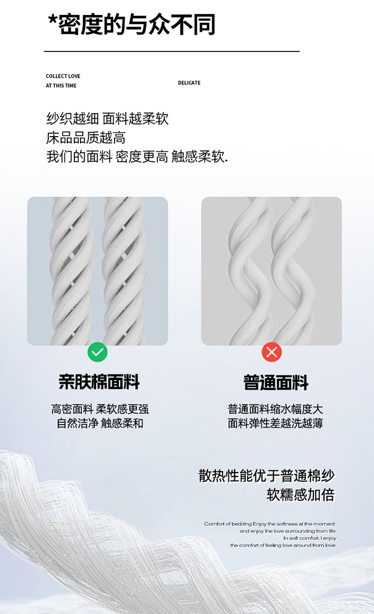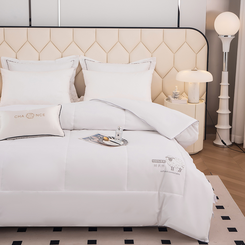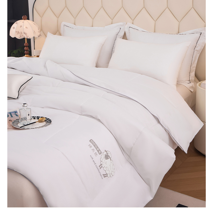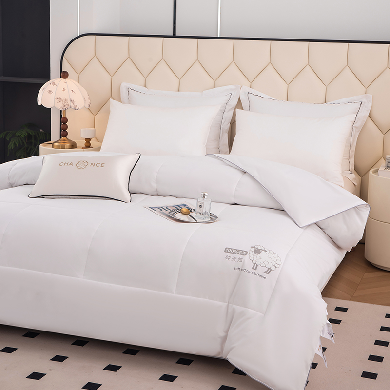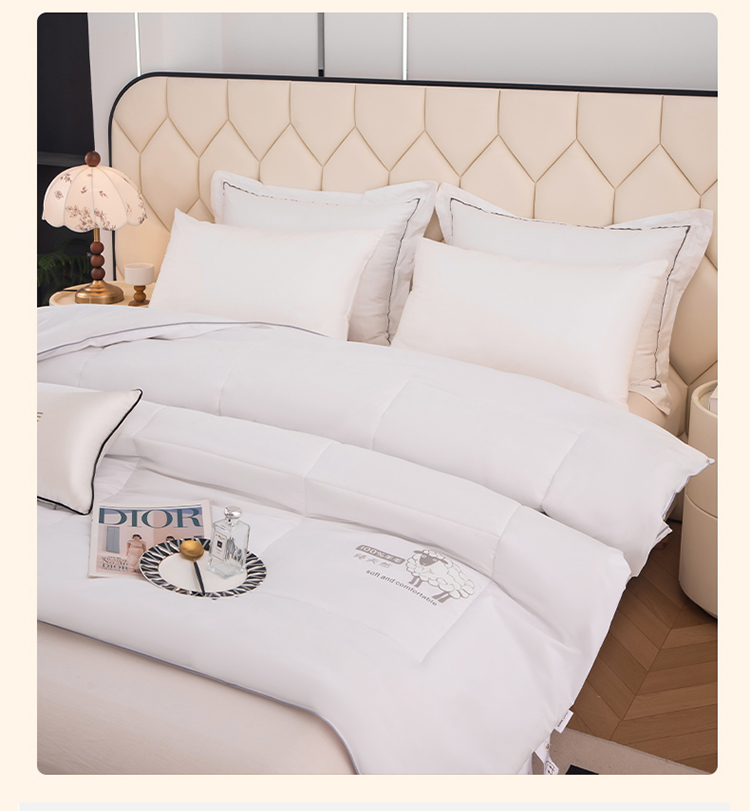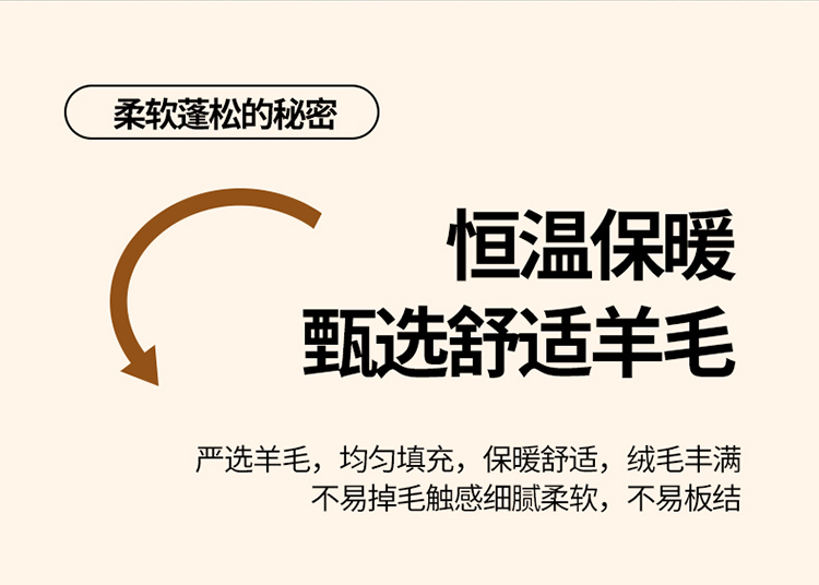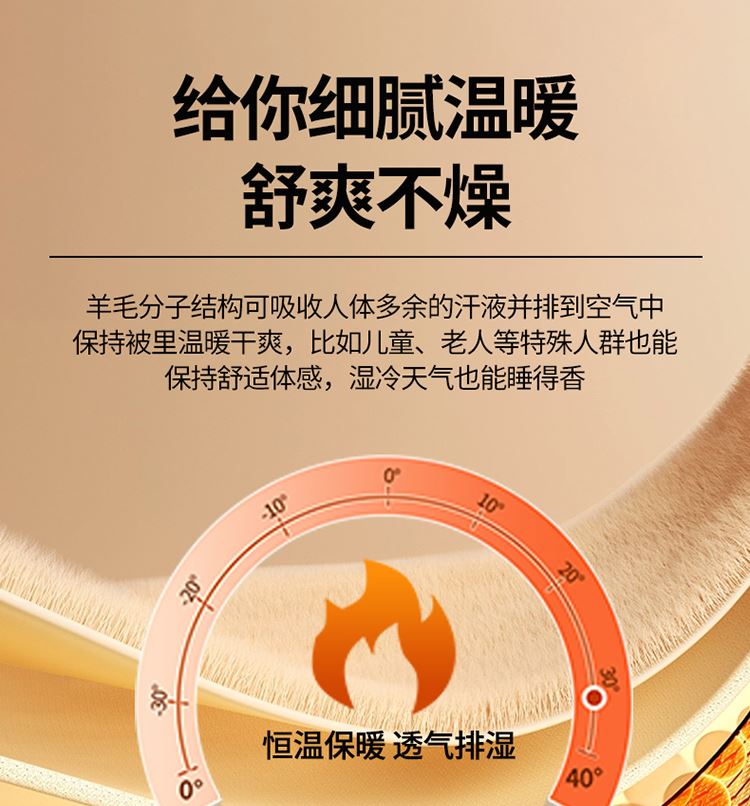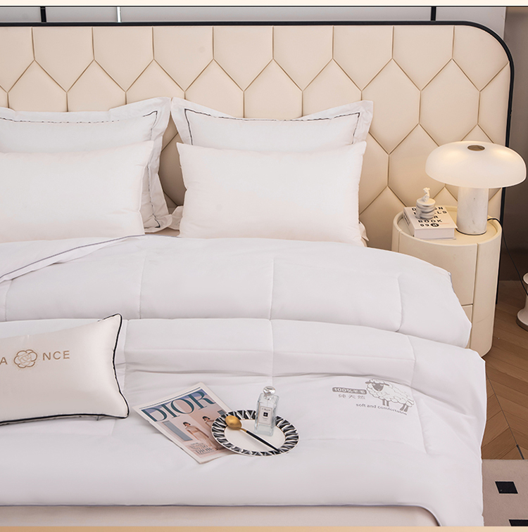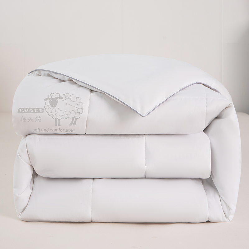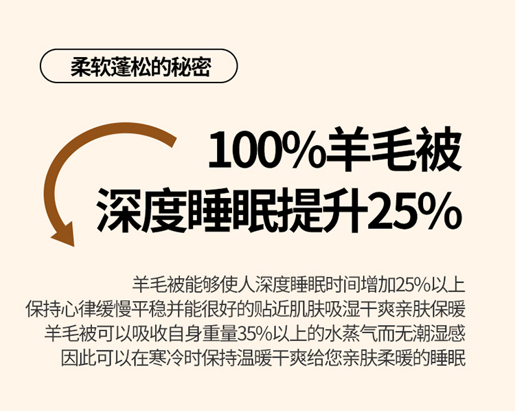 面料材质:亲肤棉 填 充:纯羊毛 产品规格:200*230cm 克 重:1900g 产品包装:精美礼盒 包装尺寸:50*40*20cm 1.高支亲肤棉细腻柔软,手感丝滑舒适,优雅美观。 2.羊毛被能储存更多的空气,保持温暖并吸收水分并排出,温暖舒适不易板结。