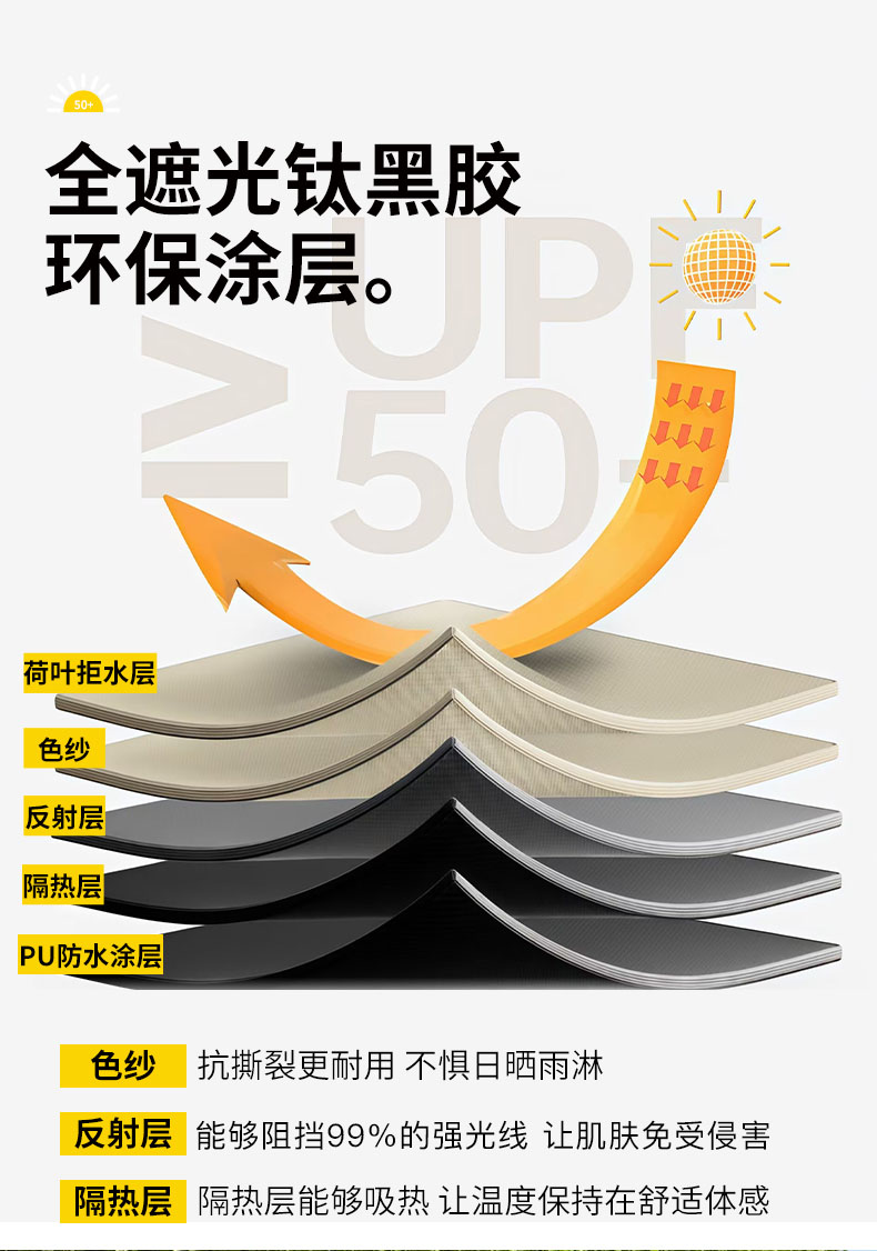 铁管直径:2.2cm 高度:225cm 防晒系数:UPF50+ 防水系数:pu3000+ 材质:210D钛黑胶牛津布 颜色:流沙金 尺寸:3*3m 重量:约2.8kg