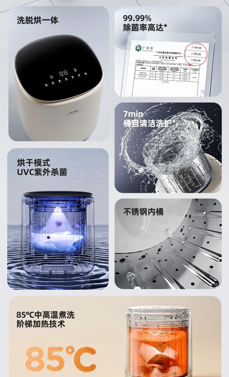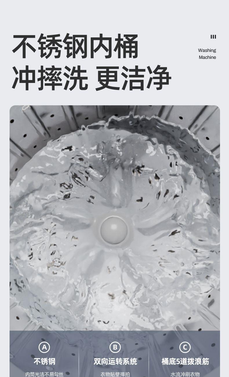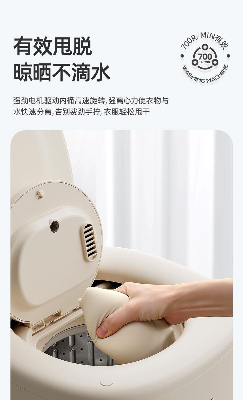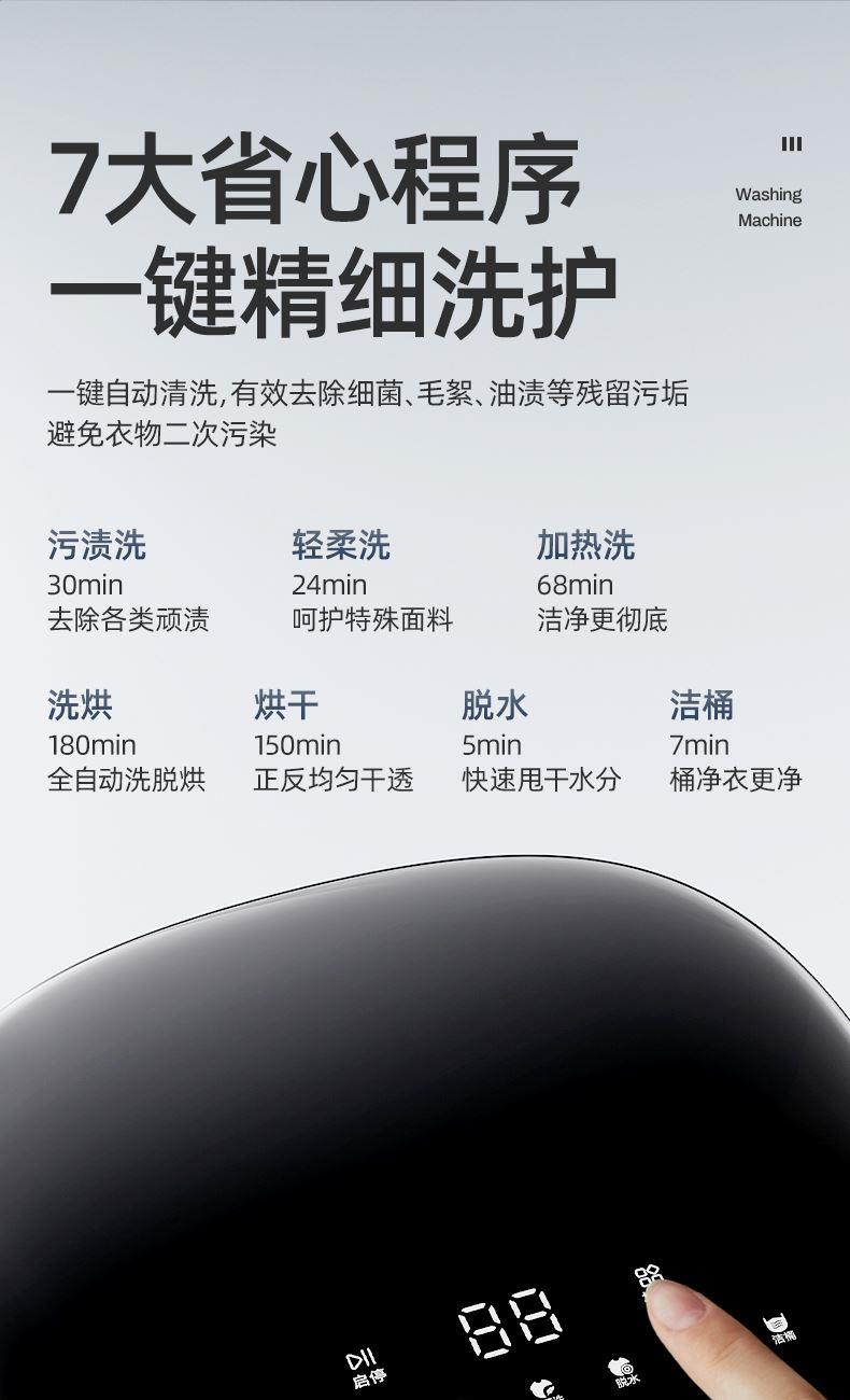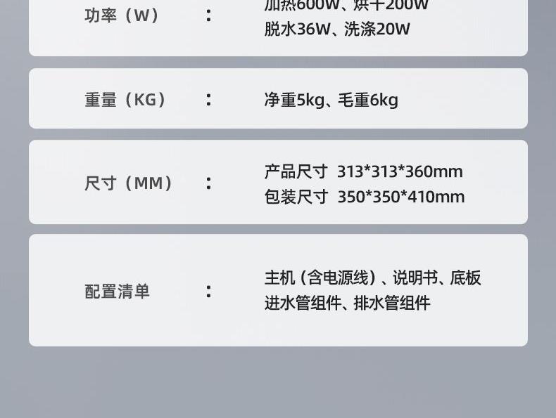 主要材质:PP+不锈钢内桶 电压:220V 功率:加热600W+洗涤20W+脱水36W 洗涤容量:7L 1、水位自感知,防缠绕流线型波轮、360度水流洗 2、可中途添衣,随添随洗,一键续洗 3、360度水流洗,去渍无死角那 4、高温加热洗,可达85℃清洗 5、开盖报警,盖上盖子可续洗 6、烘干过程,带UV功能