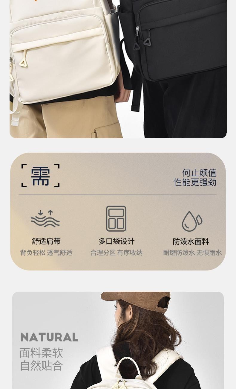 舒适便捷;精简外观设计,潮流休闲与旅行满足你所想; 优质高密度复合面料,柔润透气,防泼水耐脏; 人性化大容量多置物袋设计,男女同款皆可背负; 型号: FF-Y004A 面料材质:斜纹复合面料 里布材质:210D涤纶 尺寸: 43*30*13CM 颜色:黑色,米色 结构:主袋、前置拉链袋,后背拉链袋,侧置袋,内插袋