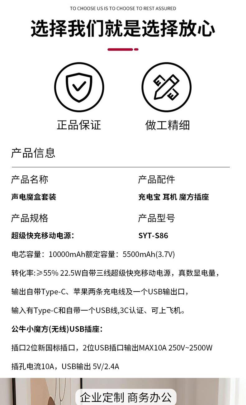 公牛小魔方(无线)USB插座+胜源通超级快充移动电源 产品重量:620g 超级快充移动电源:电芯容量10000mAh自带三线3C认证 公牛小魔方(无线)USB插座: 插口2位新国标插口,2位USB插口 立体集成结构、小巧便携、自动分流、微动开关、五重保护