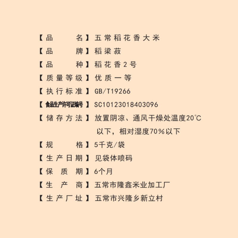 包装:真空袋装 执行标准:GB/T 19266 保质期:6个月 质量等级:优质一级 产地:黑龙江五常市 产品尺寸:300mm*240mm*80mm 推荐理由: 1、五常稻花香2号米。 2、PICC人保承保产品。 3、稻田24小时实时监控。 4、智慧农业系统。 5、当月现磨新米发货。 6、独立溯源码。 7、双层真空保鲜。