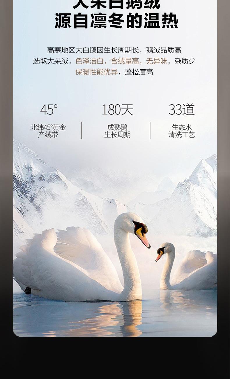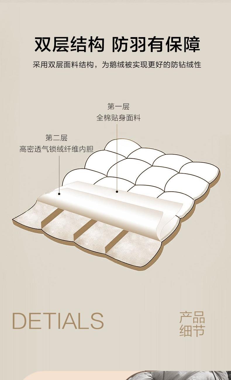 产品规格:220*240CM/1200g(填充克重) 面 料:棉 (100S) 填充物:白鹅绒(绒子含量95%) 1、本品采用高密仿钻绒,母婴级A类超柔面料,触感软糯轻盈,静音不扰眠。 2、填充高寒环境下的白鸭绒,绒朵蓬松度达到600+,清洁度达到800+,自然洁净,触感细腻,能够更好的阻隔寒冷空气。 3、立体锁温立衬工艺,保存更多静止空气,有效隔绝冷空气的入侵,更加轻盈,保暖。
