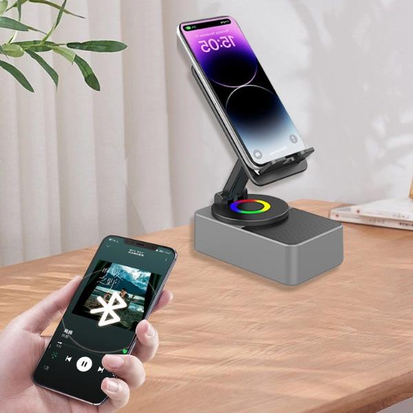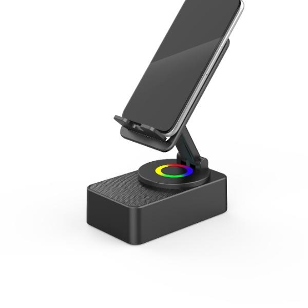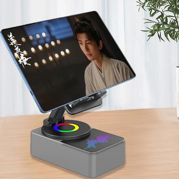 三合一手机支架无线蓝牙音响充电宝 型 号: WYS-2301BT 产品尺寸 :120*70*60mm 产品净重 :290g 材质 :ABS+硅胶 颜色 :灰色,黑色, 电池容量:1200mAh 续航:6H 【功能特点】: 360°无死角自由旋转手机平板均可使用 手机支架结合蓝牙音响功能更加强大 360度立体音质办公娱乐体验更加好 预留充电位,可当充电宝,追剧娱乐两不误