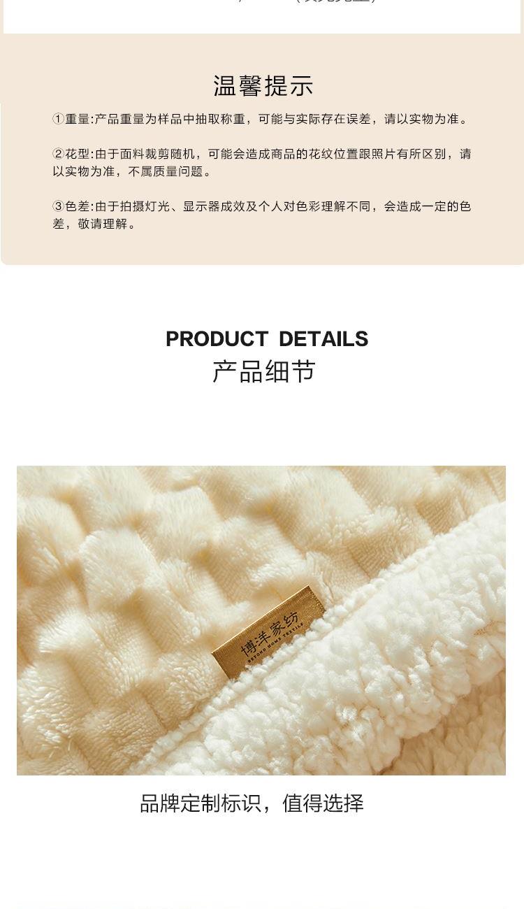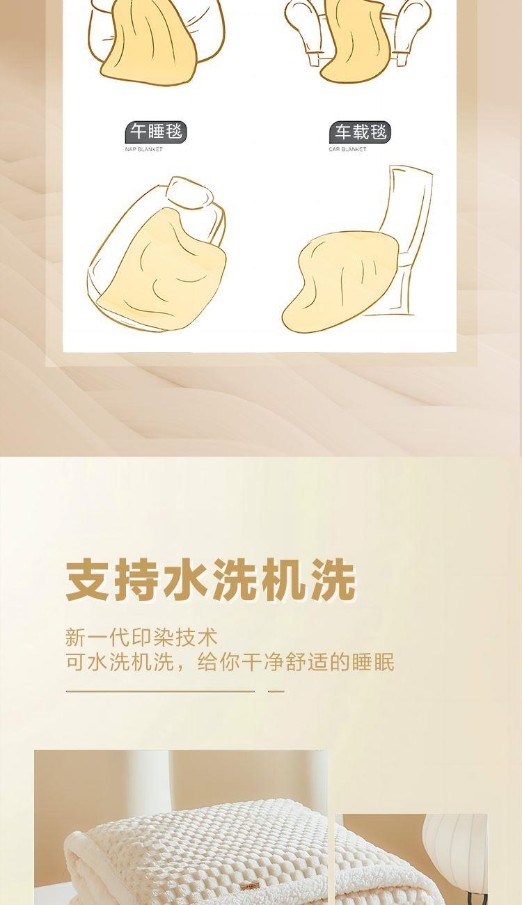 产品规格:180*200cm/1490g 200*230cm/1900g 产品材质:聚酯纤维 1、软乎乎菠萝绒材质,剪花工艺使毯面更立体蓬松。 2、产品可机洗水洗,色牢度高,久洗如新不掉毛。 3、本品为被套多用毯,产品底部装有拉链,可填充被芯做为被套使用。更可做空调毯,休闲毯,旅行毯,床单,午休毯等。