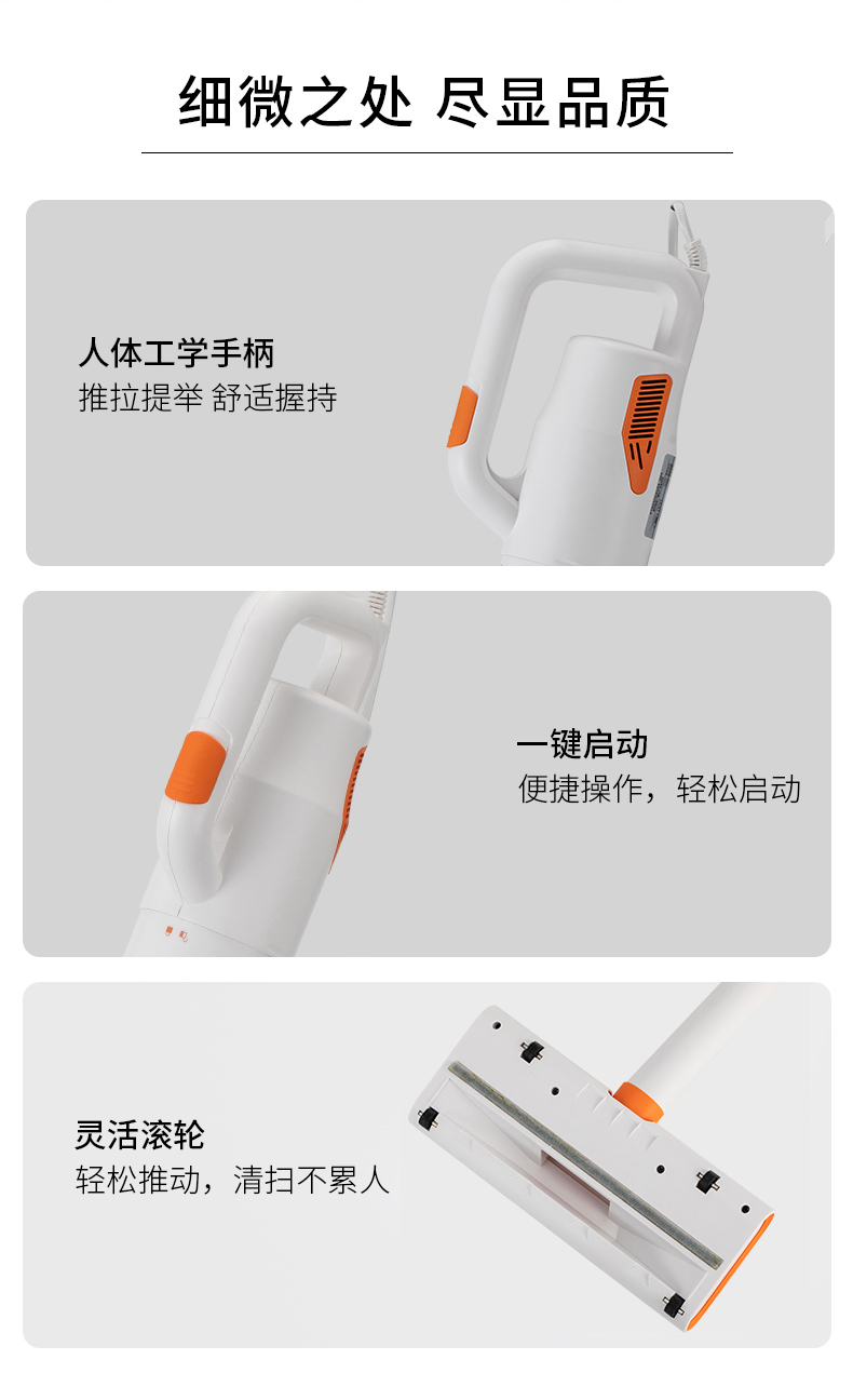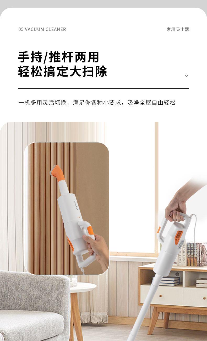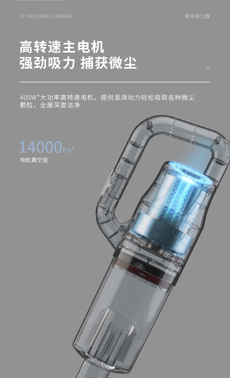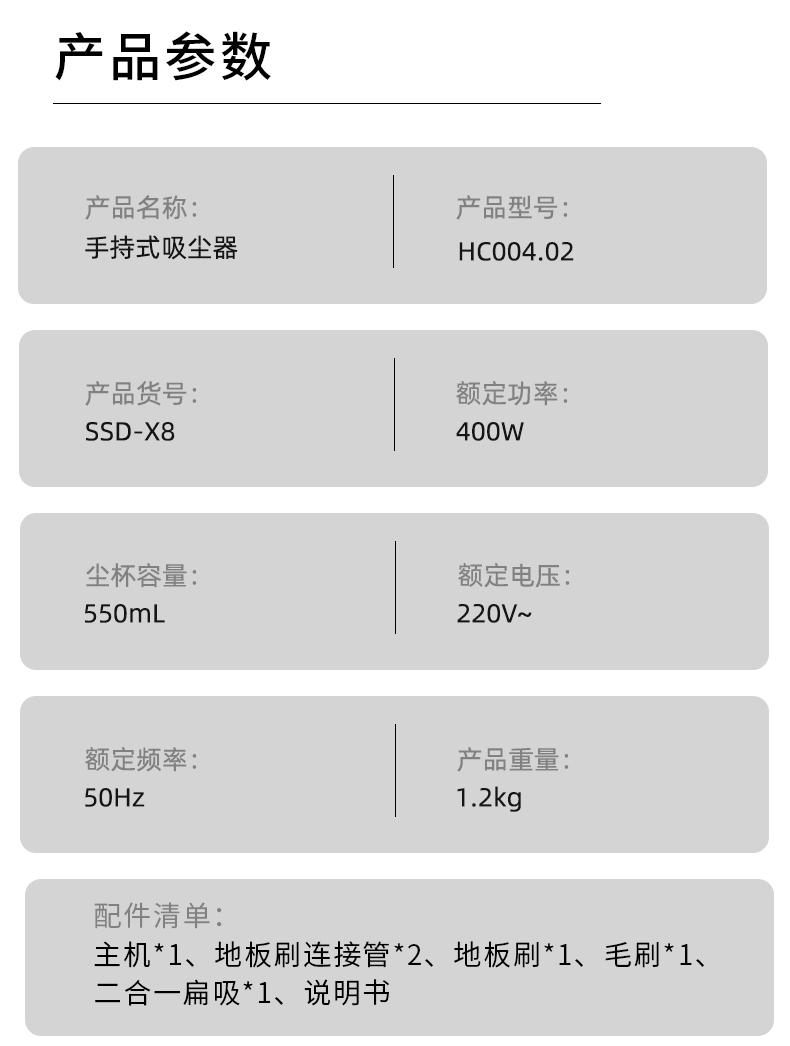 额定功率:400W 强劲小旋风大吸力降噪吸尘器 有线设计、手持/推杆两用设计 550ml大容量尘杯 三款清洁刷头从容应对复杂家居环境、多重过滤、高速电机、稳定功率输出 一键启动、灵活滚轮 主机*1、地板刷连接管*2、地板刷*1、毛刷*1、二合一扁吸*1、说明书 包装方式:彩盒+网购包装
