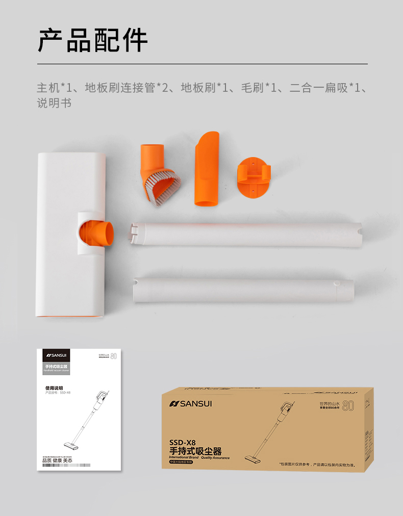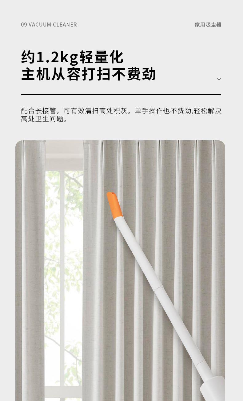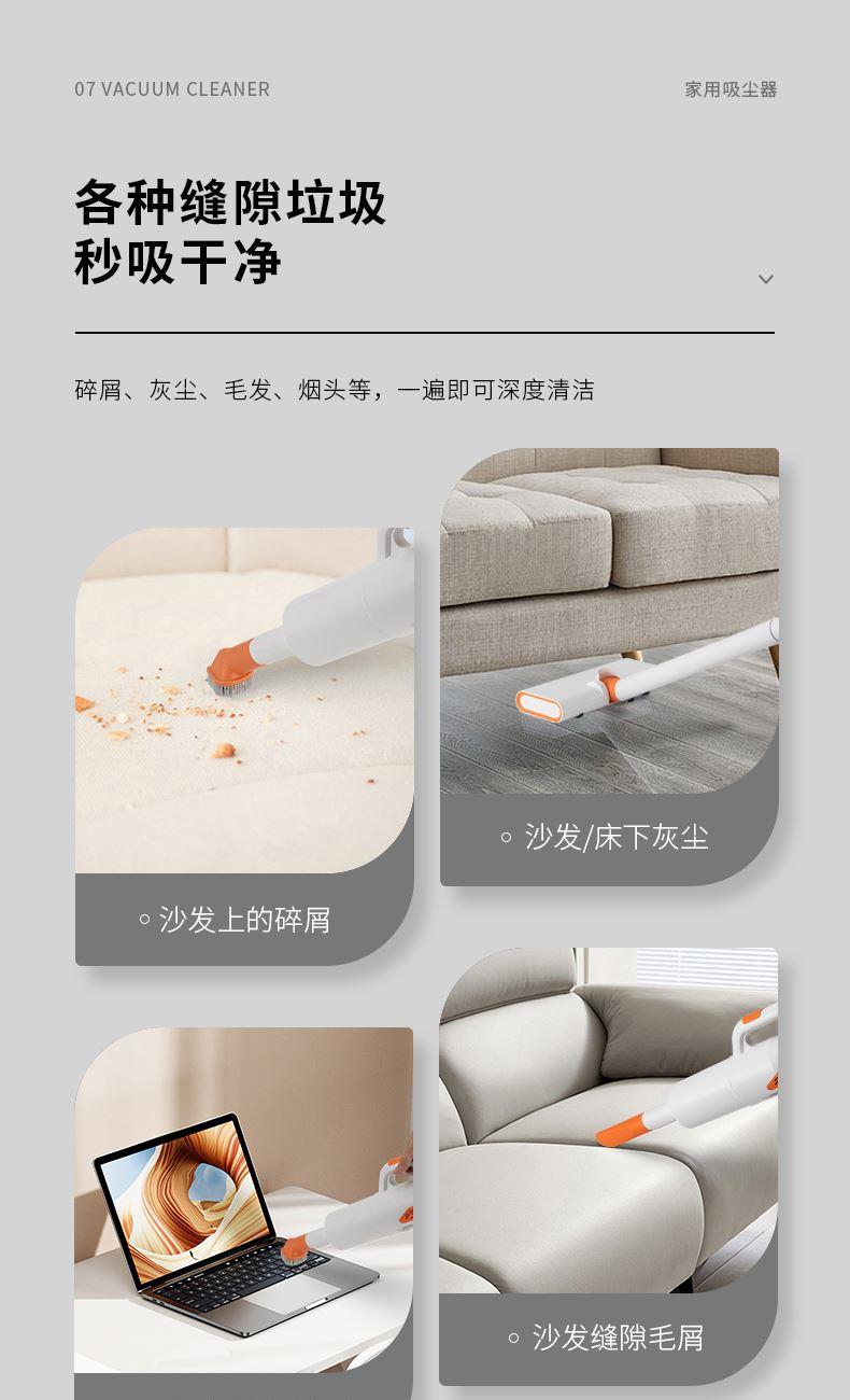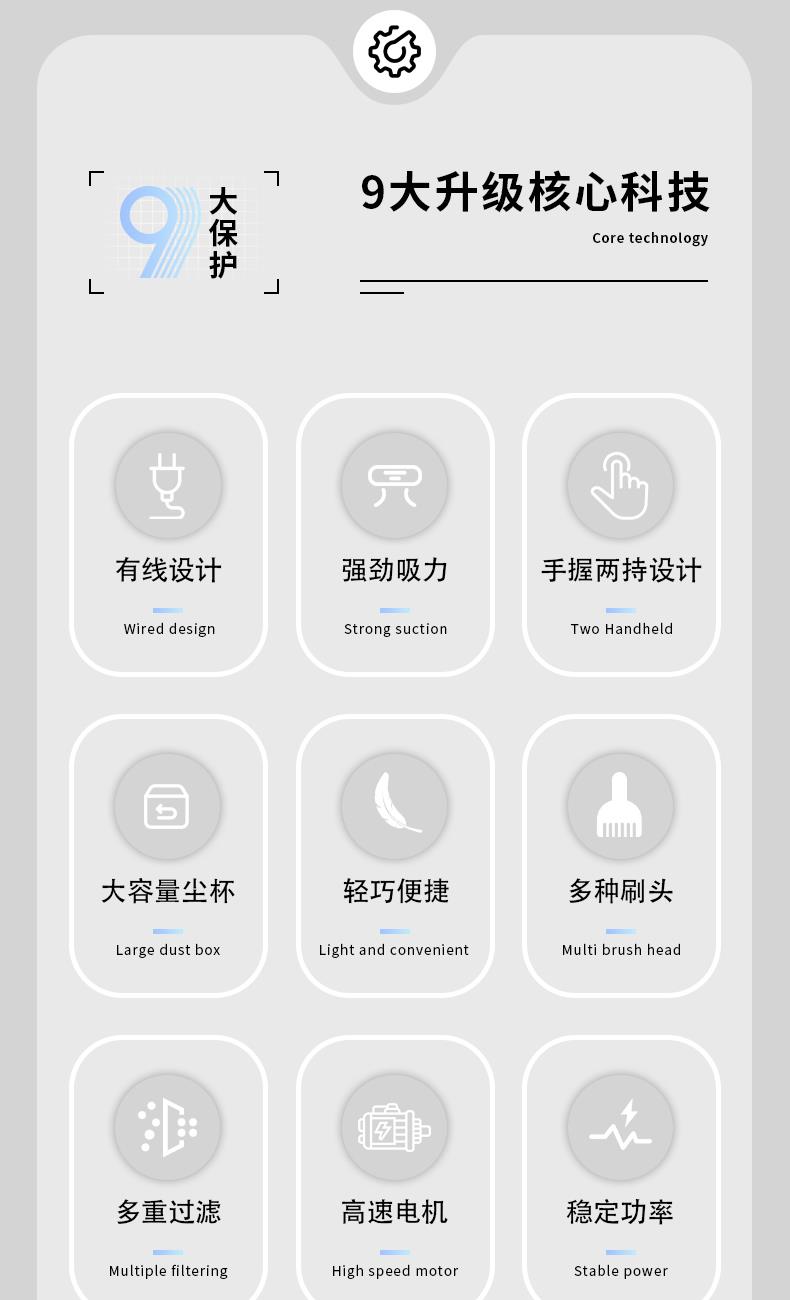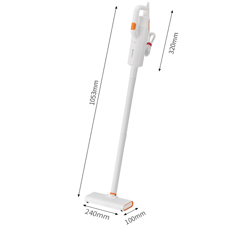 额定功率:400W 强劲小旋风大吸力降噪吸尘器 有线设计、手持/推杆两用设计 550ml大容量尘杯 三款清洁刷头从容应对复杂家居环境、多重过滤、高速电机、稳定功率输出 一键启动、灵活滚轮 主机*1、地板刷连接管*2、地板刷*1、毛刷*1、二合一扁吸*1、说明书 包装方式:彩盒+网购包装