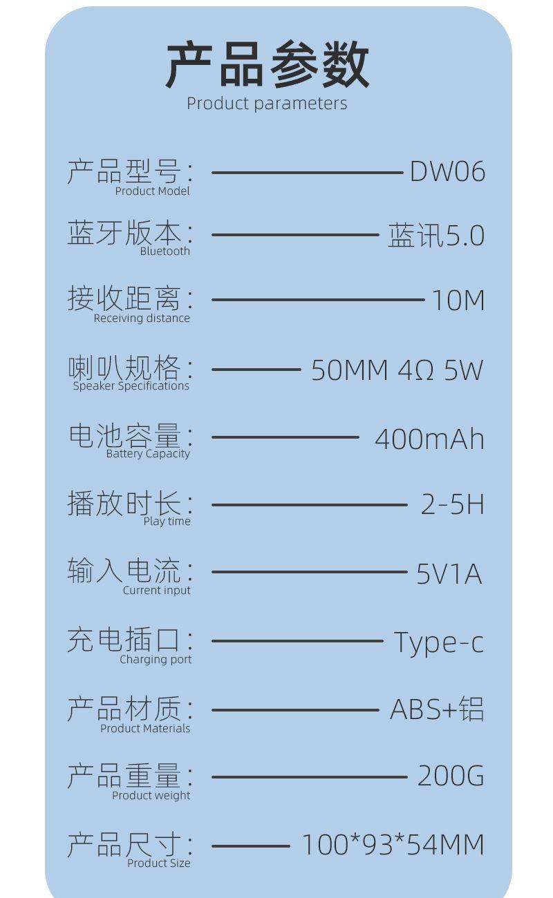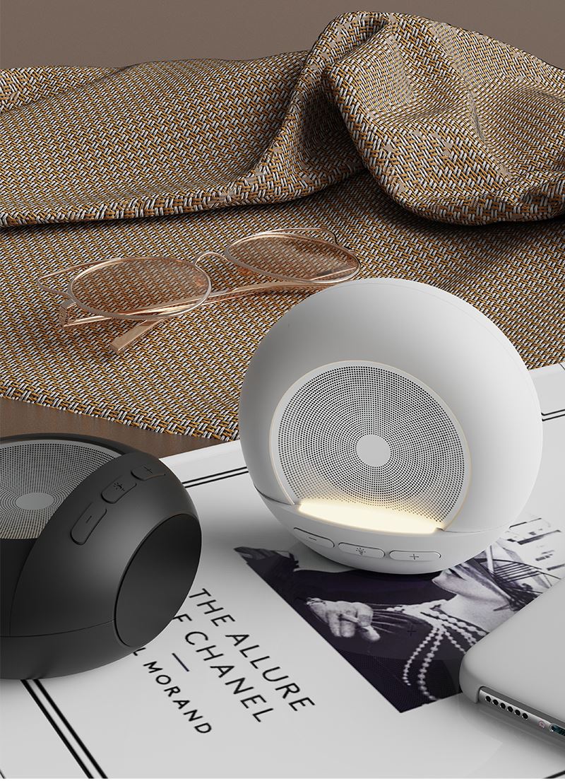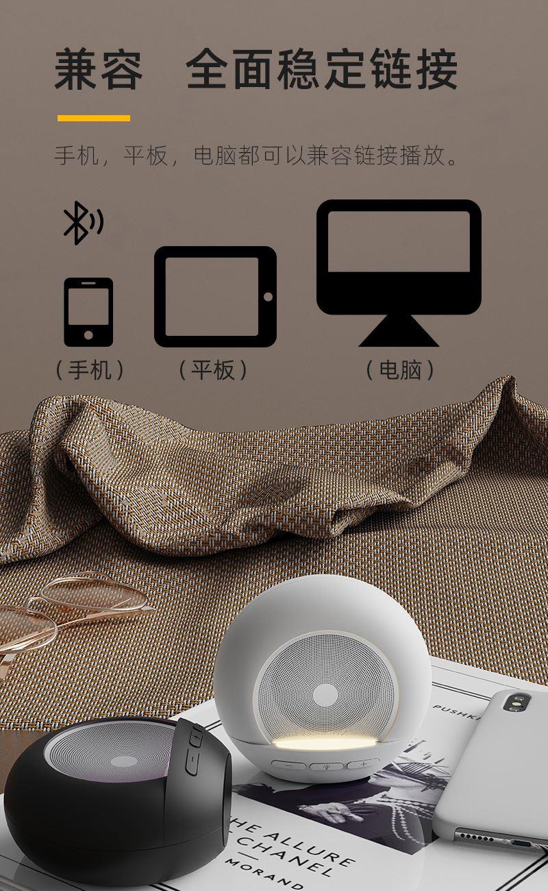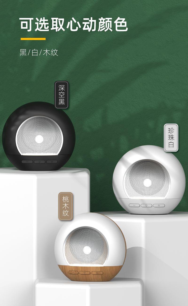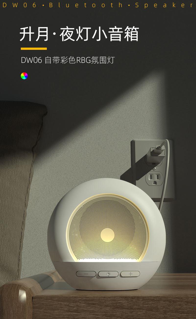 月圆无线蓝牙音响灯DW06 颜色:白色 黑色 材质:ABS+PC 尺寸:10*9.3*5.4cm 包装:彩盒包装 【功能特点】: 月圆造型音响,可当床头小夜灯 蓝牙连接/插卡播放 5.3蓝牙芯片连接稳定 柔光小夜灯不刺眼