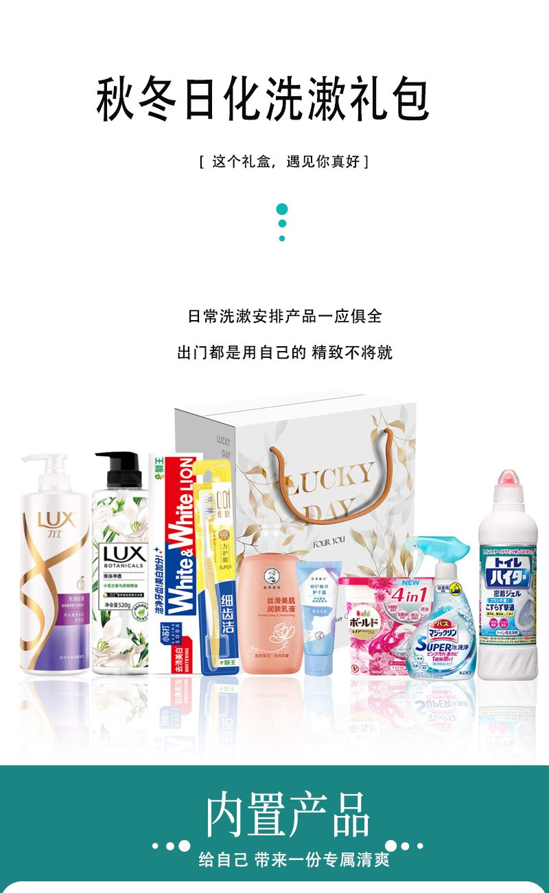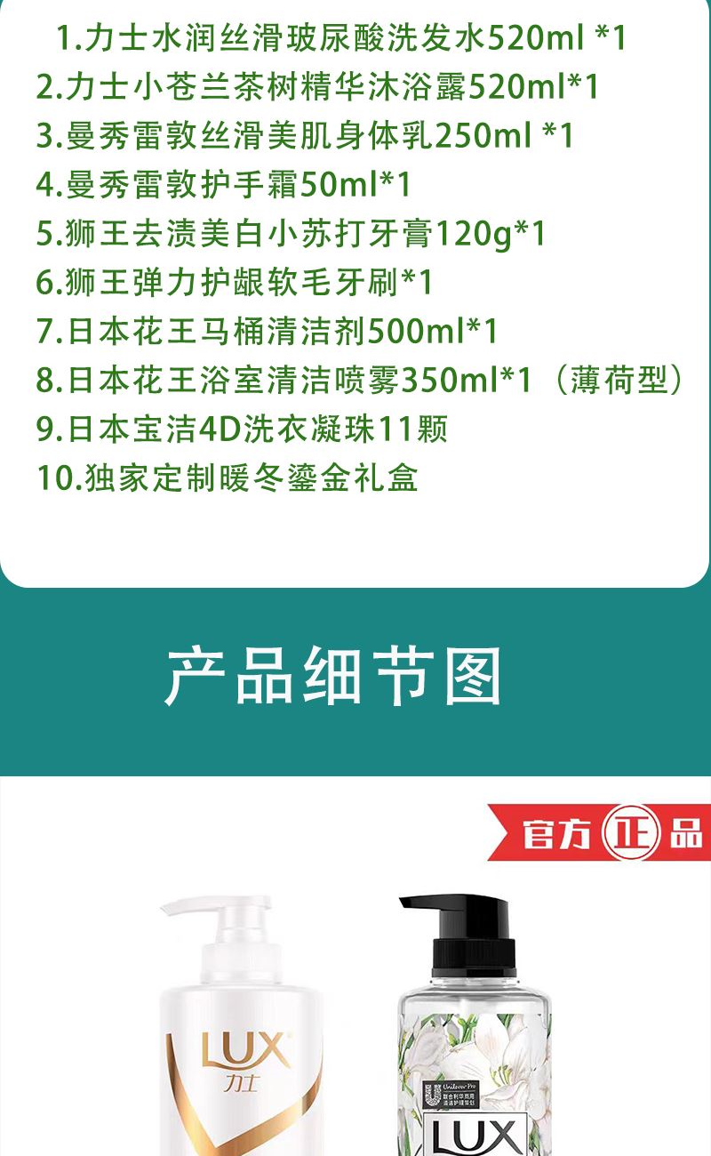 1.力士水润丝滑玻尿酸洗发水520ml *1 2.力士小苍兰茶树精华沐浴露520ml*1 3.曼秀雷敦丝滑美肌身体乳250ml *1 4.曼秀雷敦护手霜50ml*1 5.狮王去渍美白小苏打牙膏120g*1 6.狮王弹力护龈软毛牙刷*1 7.日本花王马桶清洁剂500ml*1 8.日本花王浴室清洁喷雾350ml*1(薄荷型) 9.日本宝洁4D洗衣凝珠11颗 10.定制暖冬鎏金礼盒 这套超值冬季护肤礼盒共包含力士水润丝滑玻尿酸洗发水、力士小苍兰茶树精华沐浴露、曼秀雷敦丝滑美肌身体乳、曼秀雷敦护手霜、狮王去渍美白小苏打牙膏、狮王弹力护龈软毛牙刷、日本花王马桶清洁剂、日本花王浴室清洁喷雾和日本宝洁4D洗衣凝珠。所有产品都是精心挑选,具有出色的品质和效果,能够满足您对美容美发的需求。此外,这套礼盒还附赠了一款精美的定制暖冬鎏金礼盒,增添了节日氛围,是您送给家人或朋友的礼物。