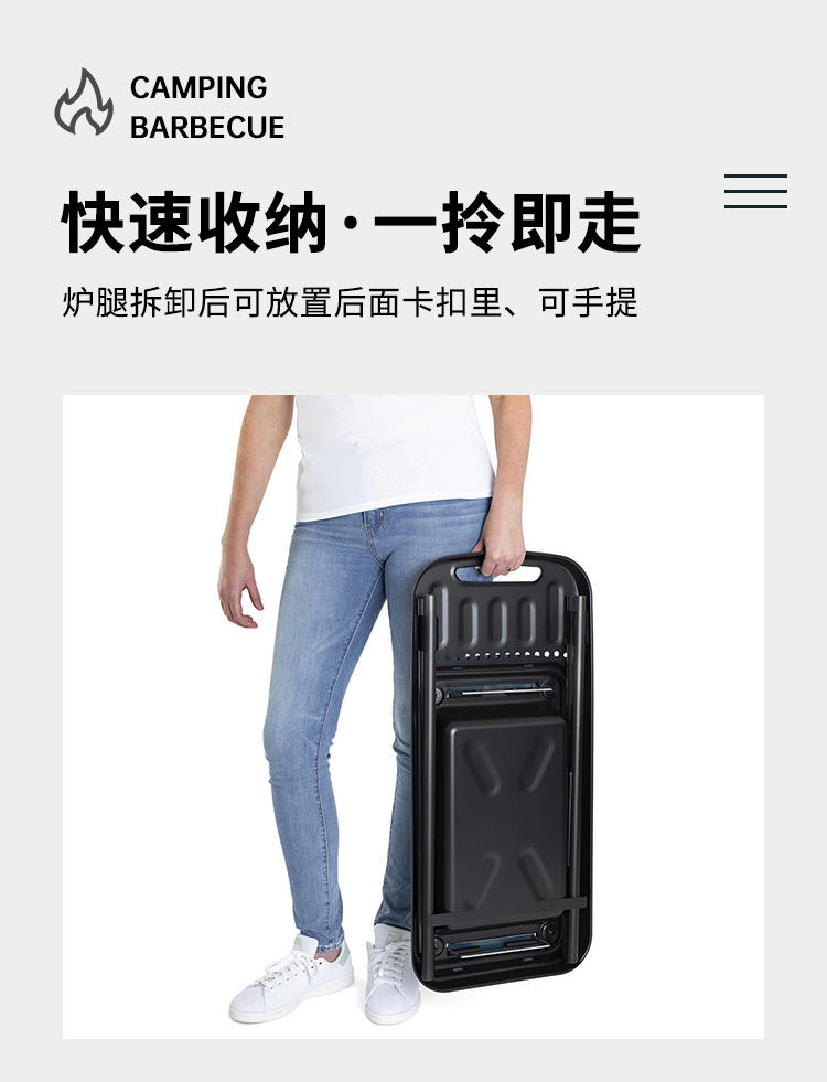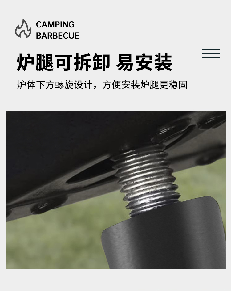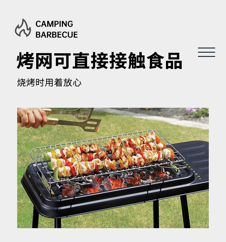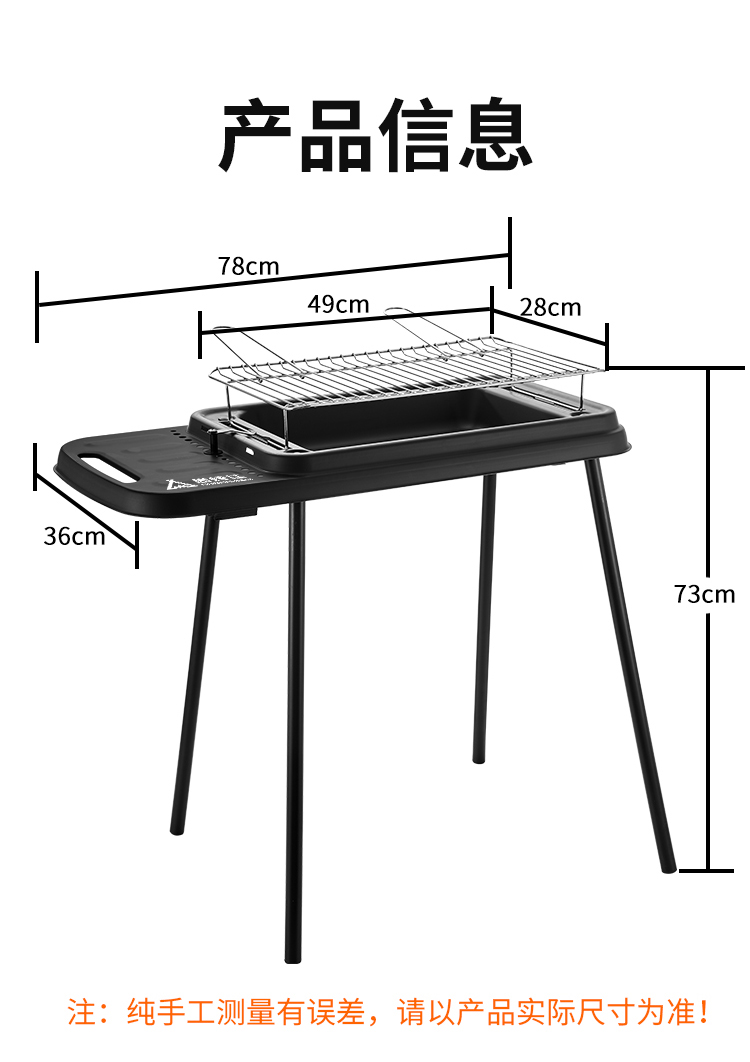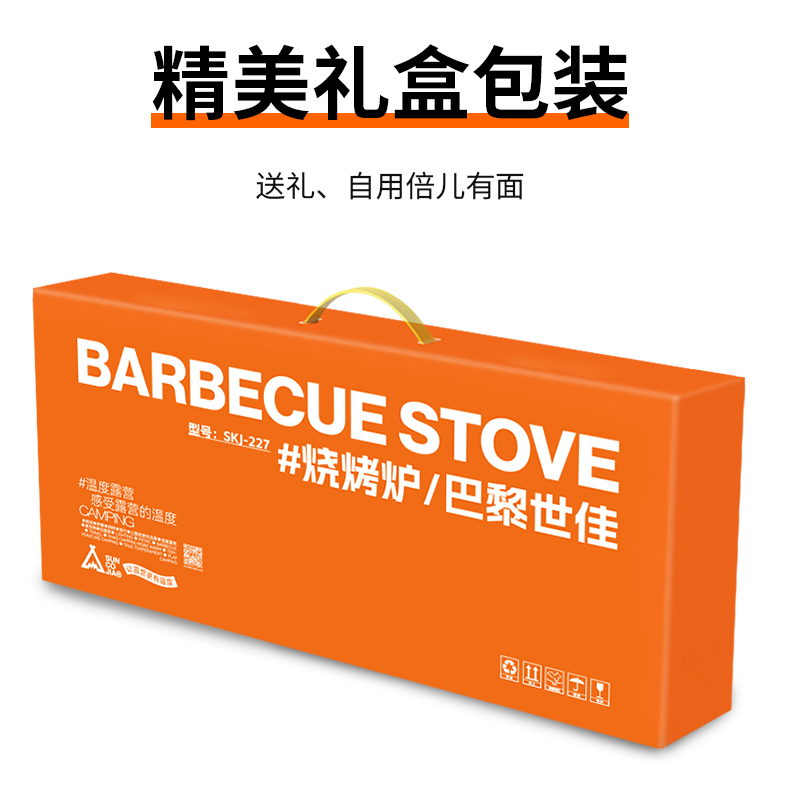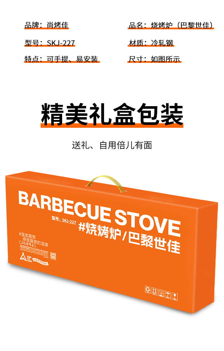 炉体:冷轧铁 烤网:不锈钢 彩盒包装 符合人体工学设计,烧烤更便利