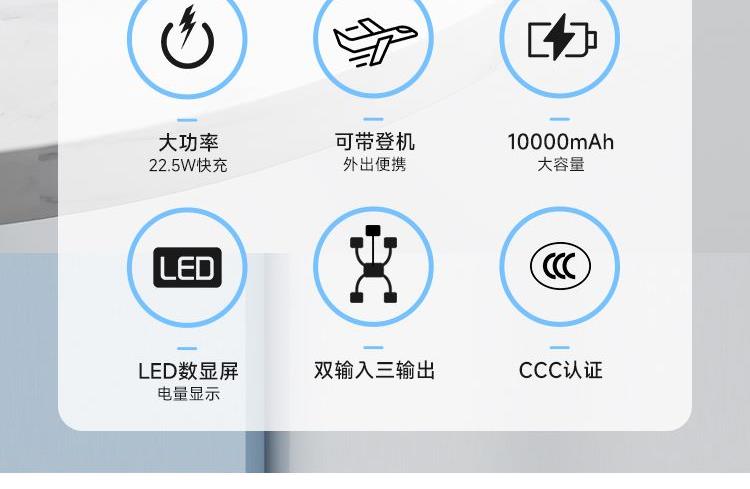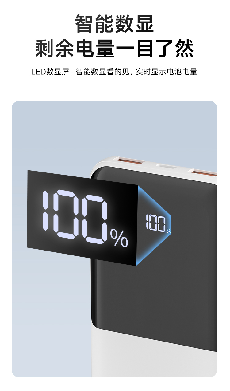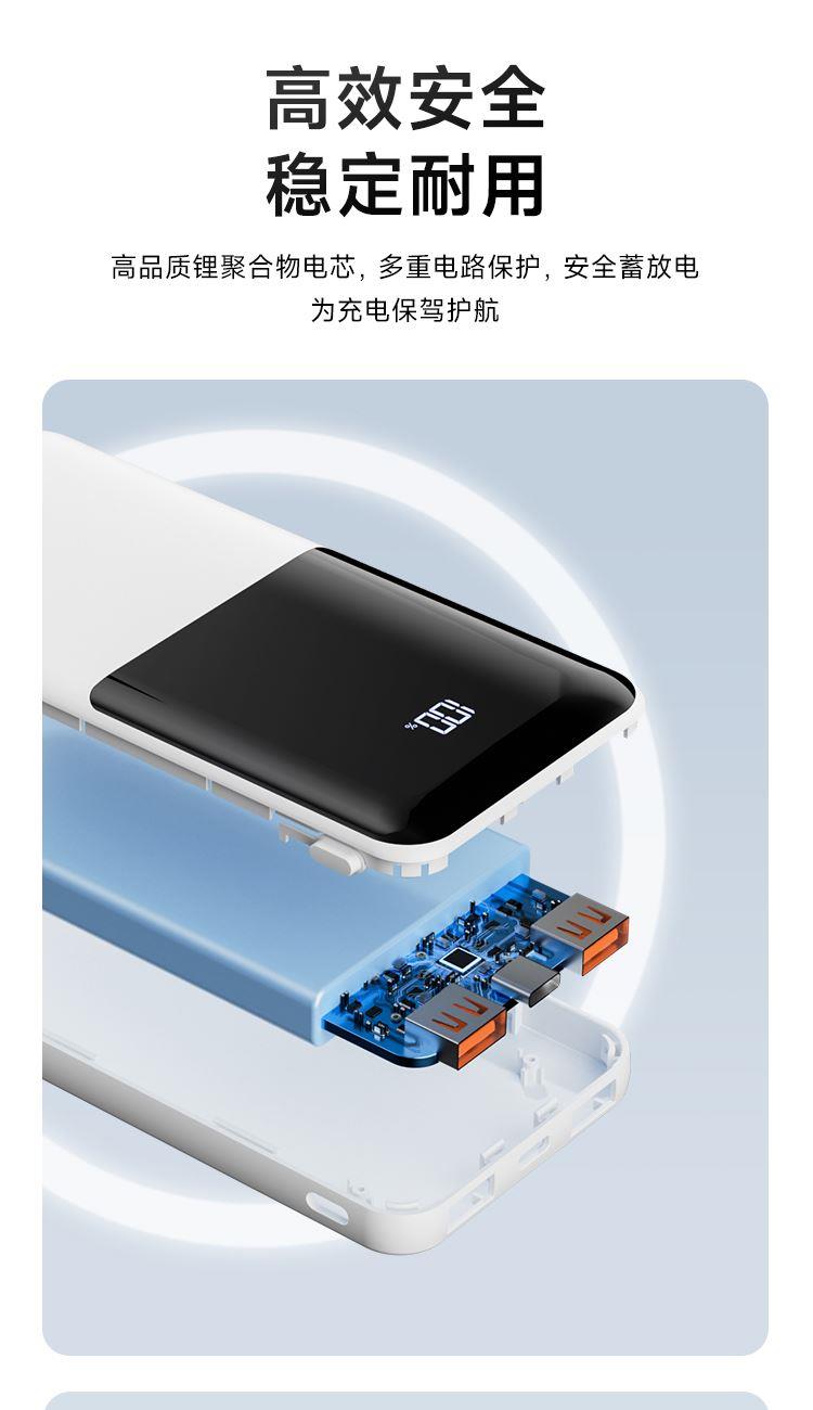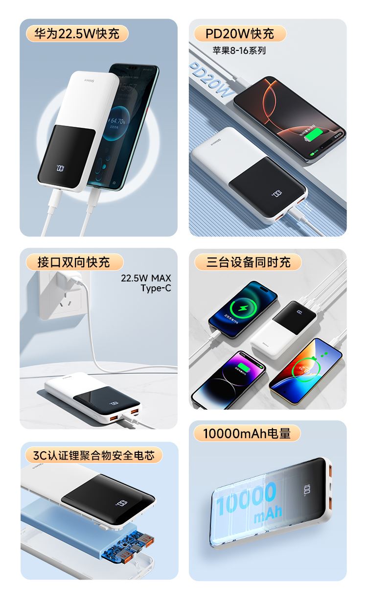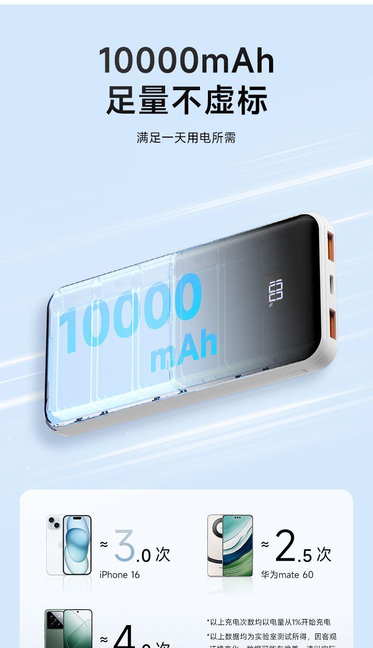 电池类别:聚合物锂离子电池 型号: G1 锂电池容量: 10000mAh/3.7V/37Wh 额定容量: 5300mAh(5V=3A) 输入Type-C: DC5V=3A 9V=2A 12V=1.5A 输出USB1/2: 5V-3A 9V-2A 12V-1.5A 10V=2.25A Type-C: DC 5V-3A 9V m2.23A 12Vm1.67A 总输出:DC 5V -3A (Max) 转换效率:≥53% 1:接口齐全、充蓄便捷、双口输入输出,18W输入+22.5W输出,充设备快,给移动电源充也快 2:广泛适配、全面兼容、兼容苹果,三星,华为,小米等主流手机和平板设备充电 3:高效安全、稳定耐用、高品质锂聚合物电芯,多重电路保护,安全蓄放电,为充电保驾护航 4:IPhone手机8-16、前30分钟充50%、支持PD 20W输出,搭配PD快充线,电量从0-1%开始充,半小时充电约50% 5:华为Mate 60、前30分钟充60%、支持22.5W超级快充,大功率输出,快速充电
