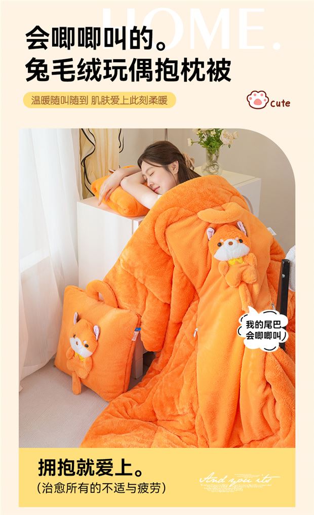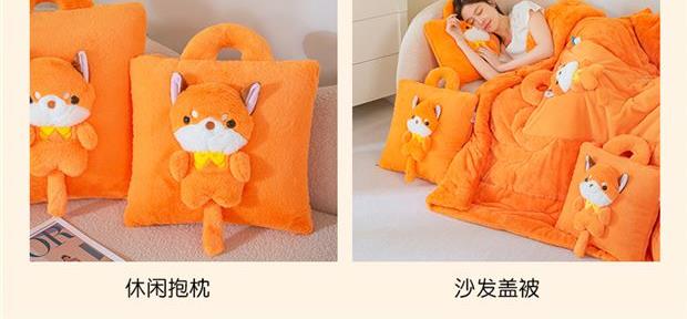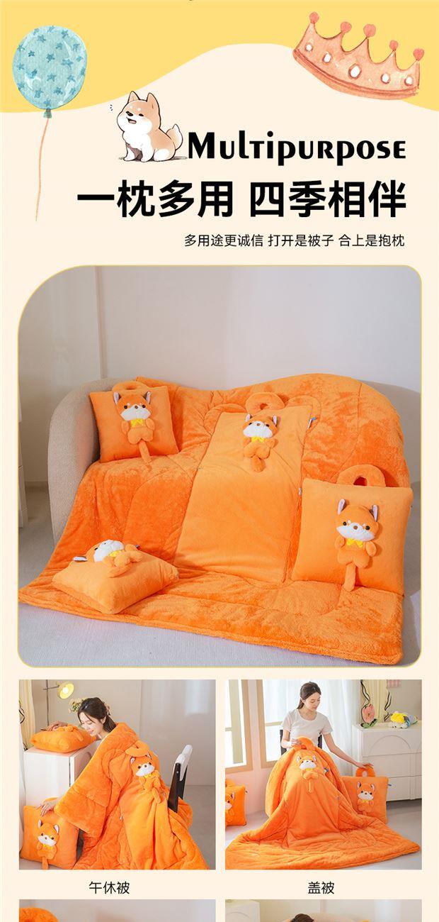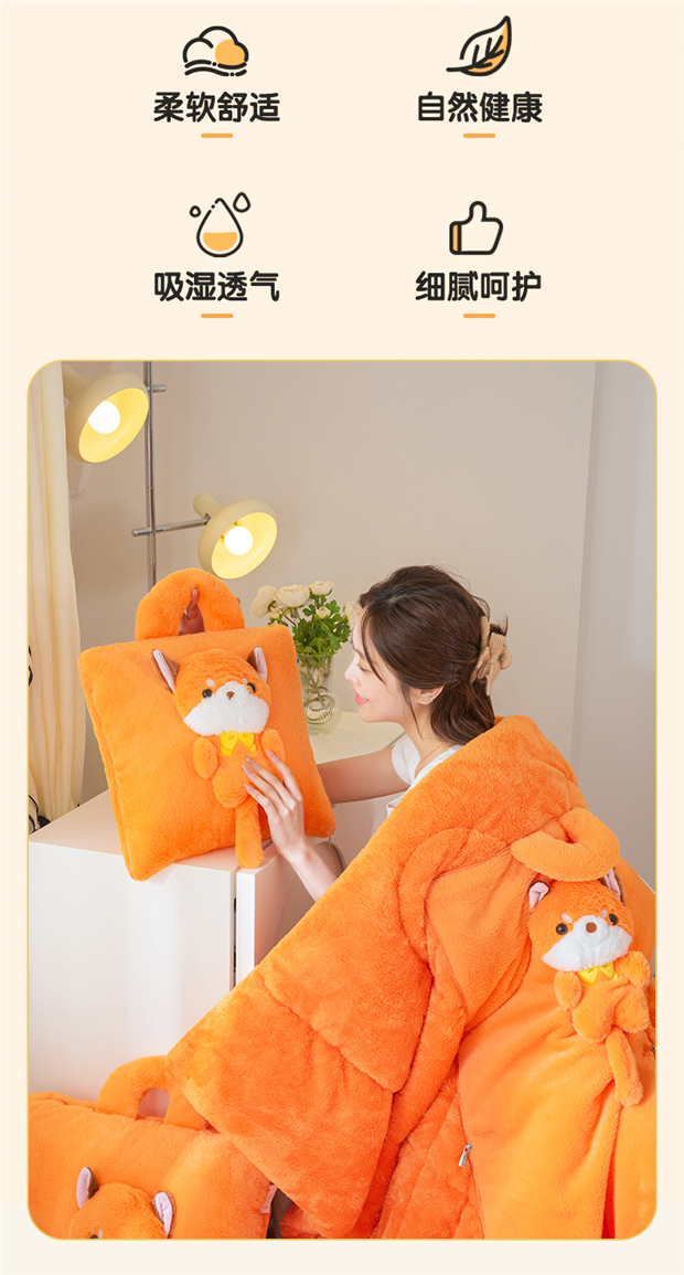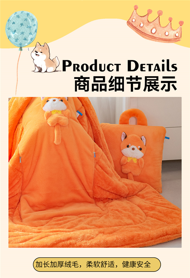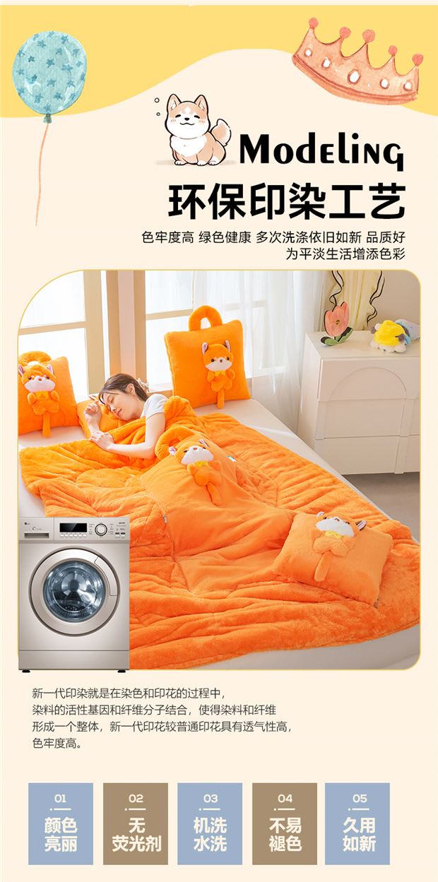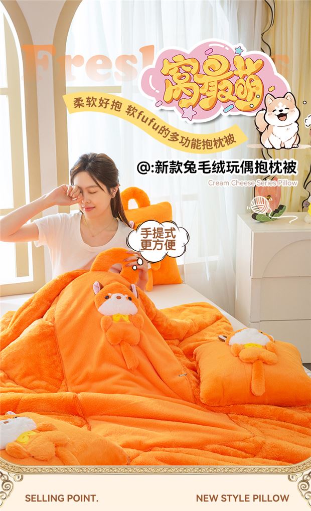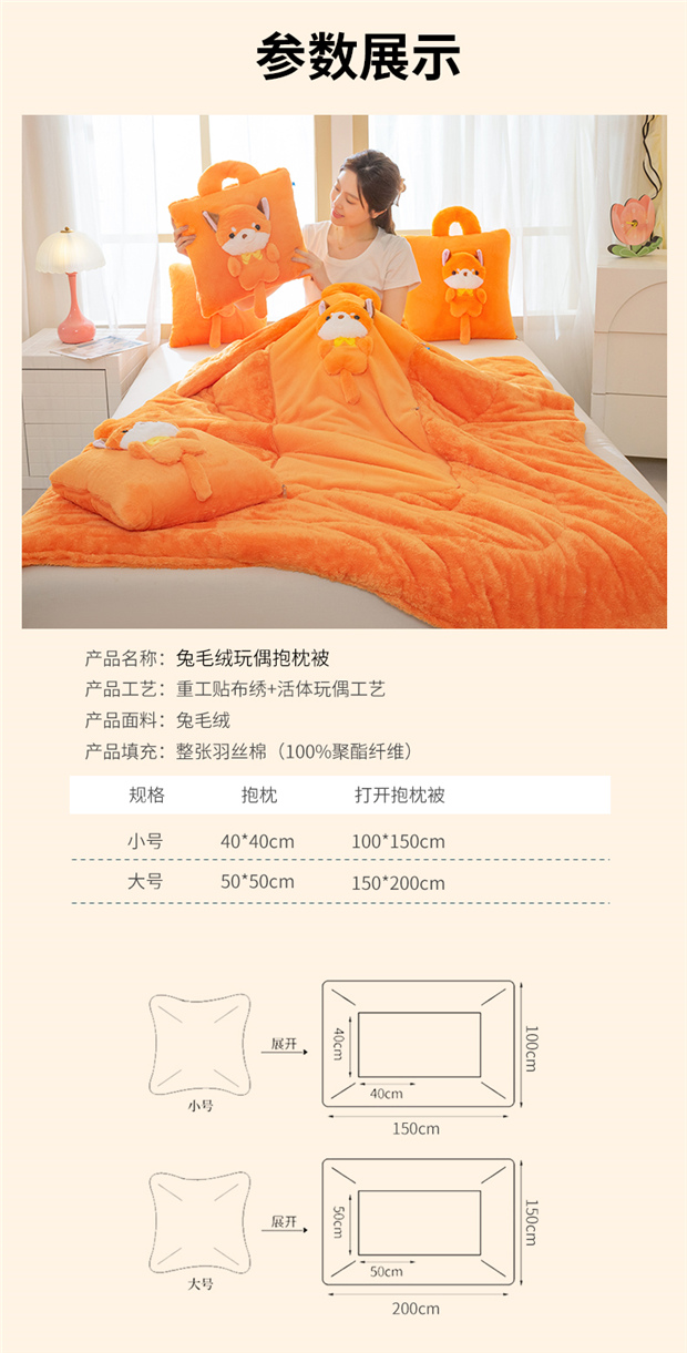 面料:兔毛绒 填充:整张羽丝棉 工艺:重工贴布绣+活体玩偶工艺 尺寸:40*40cm 打开100*150cm