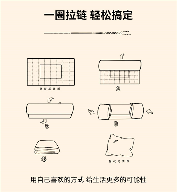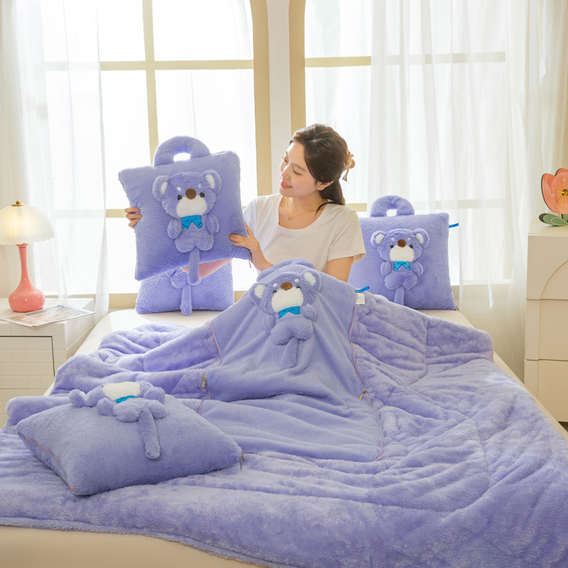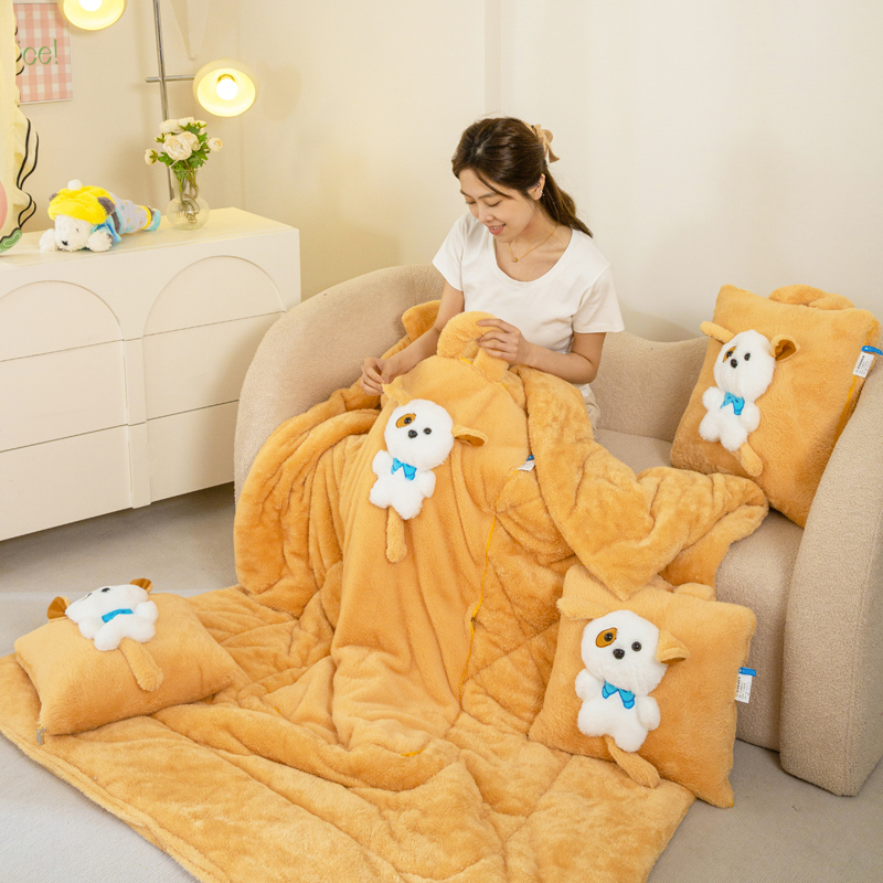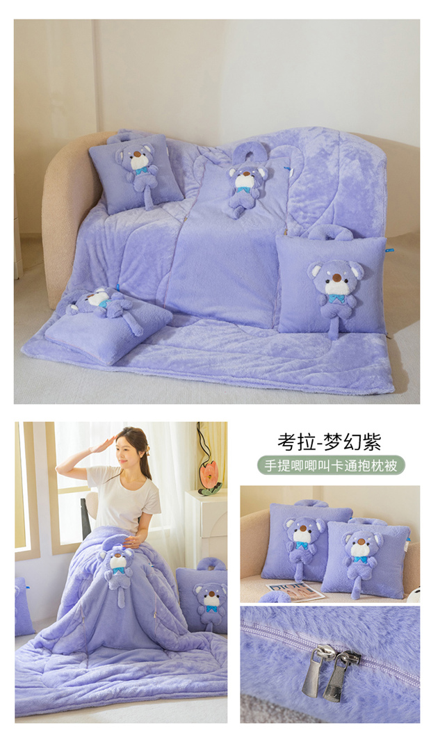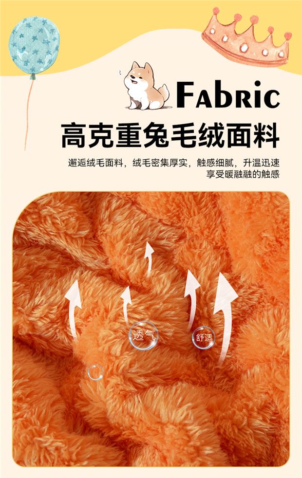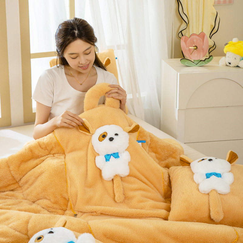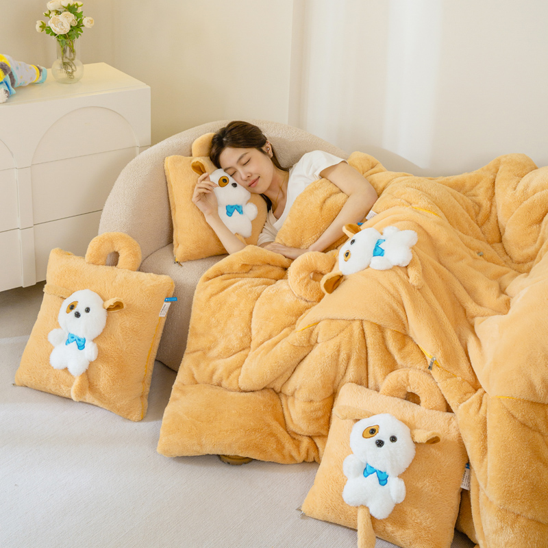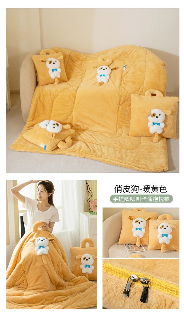 面料:兔毛绒 填充:整张羽丝棉 工艺:重工贴布绣+活体玩偶工艺 尺寸:40*40cm 打开100*150cm
