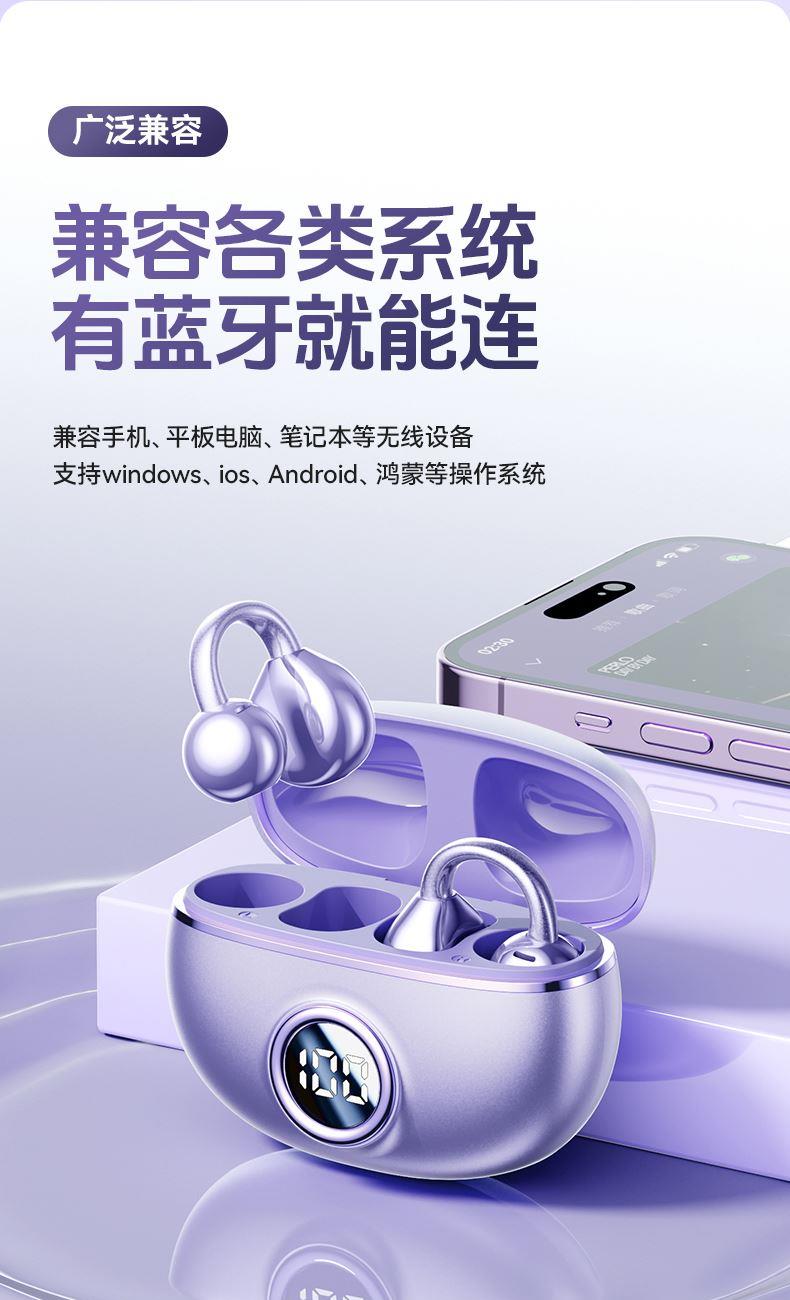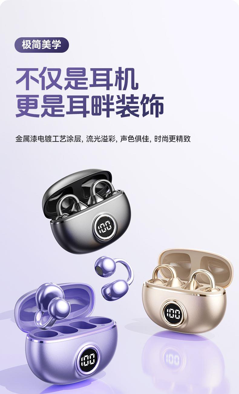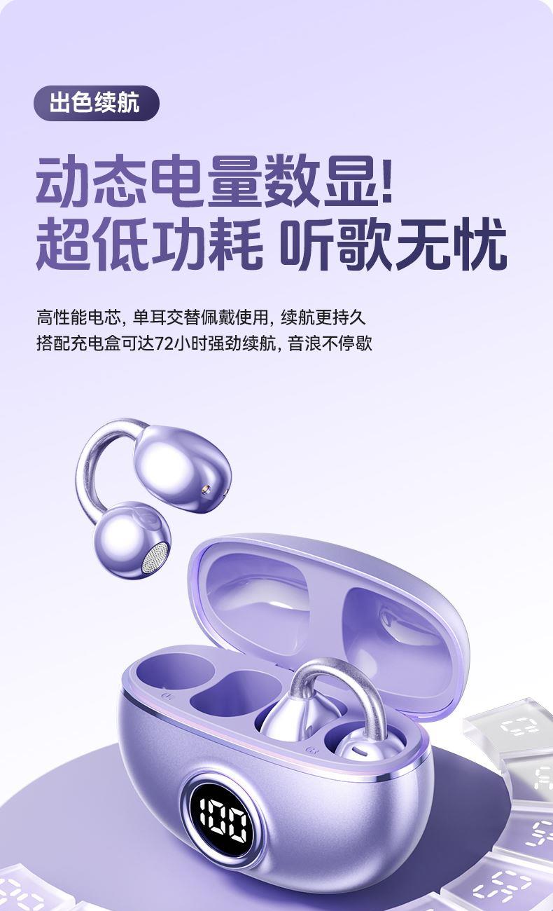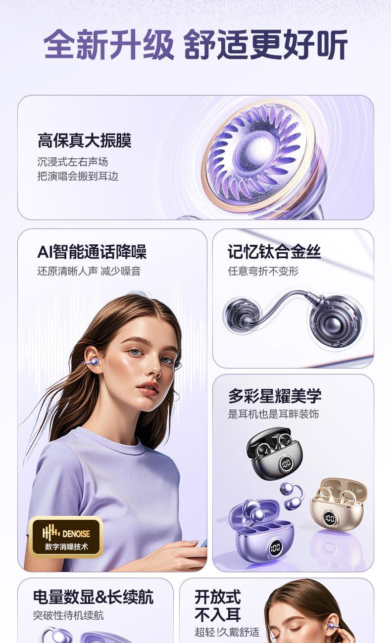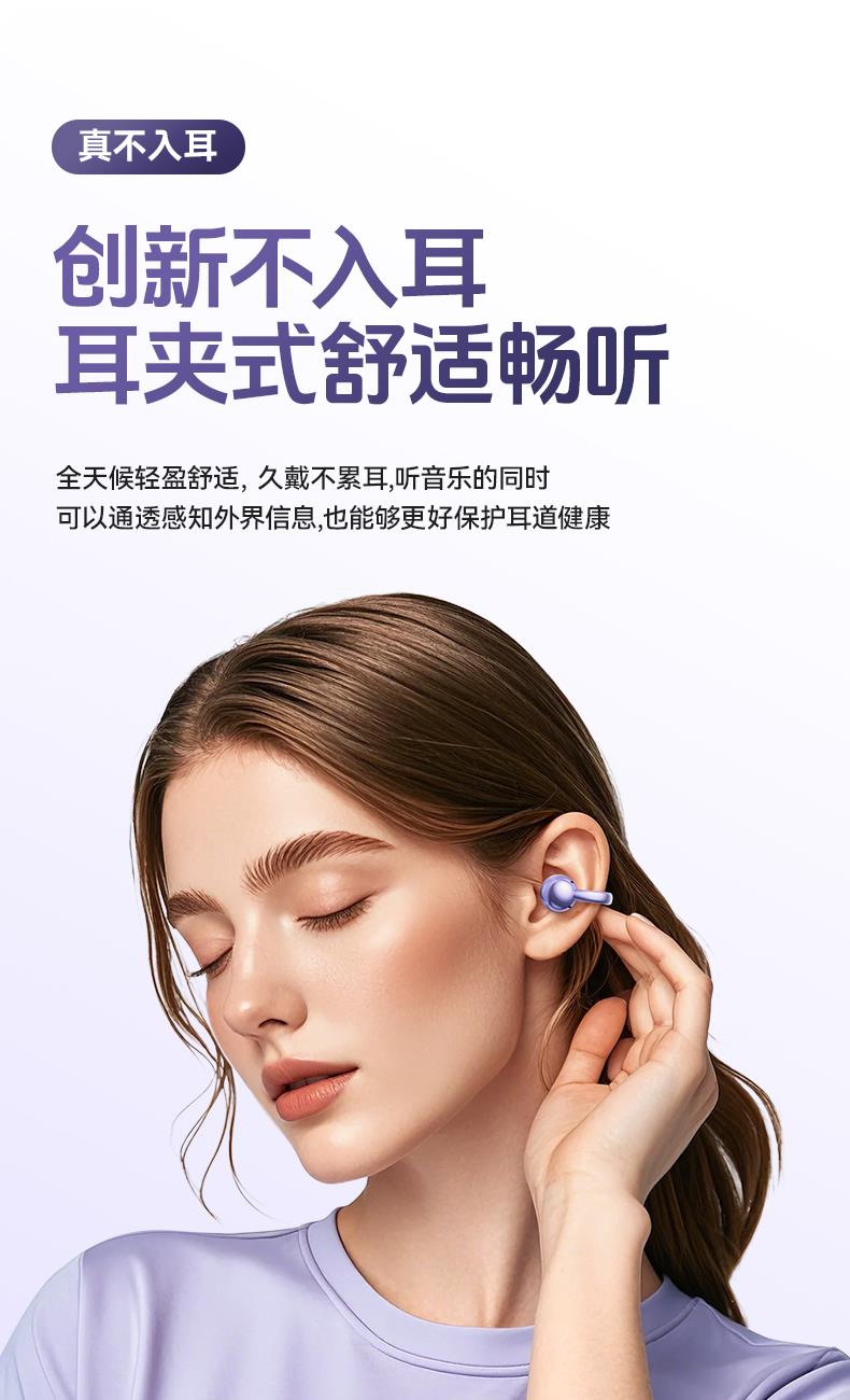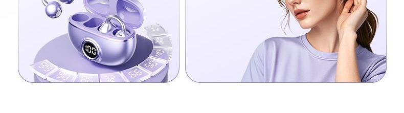 颜色:米色 紫色 黑色 材质:ABS+电镀 容量:耳机30mAh 耳机舱230mAh 包装:彩盒包装 【推荐理由】: 云感耳夹式设计 久戴不累 定向传音技术 V5.4蓝牙版本 智能通话降噪 数字屏电量显示 一目了然 触摸式功能操作
