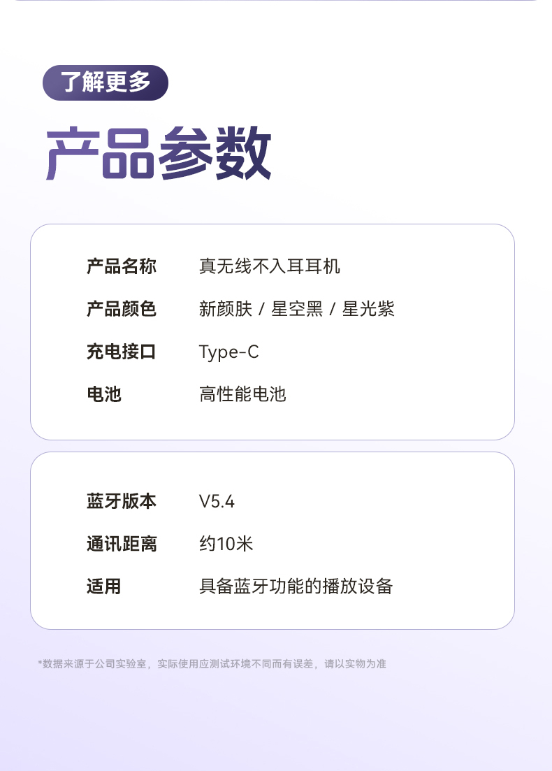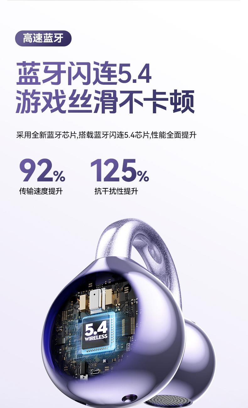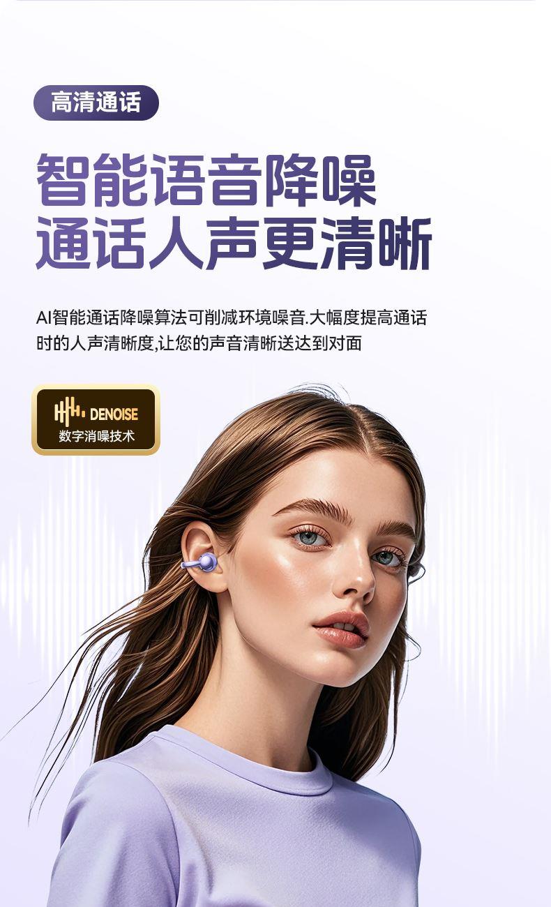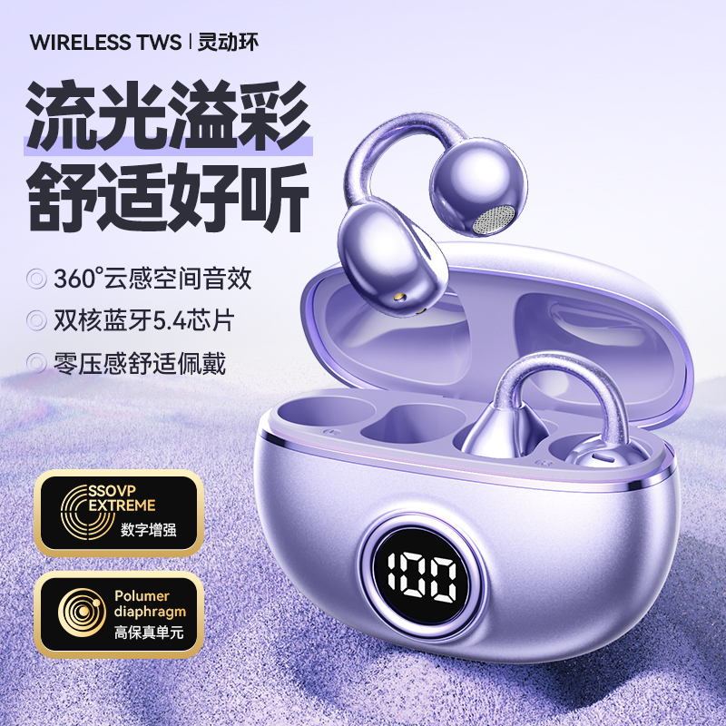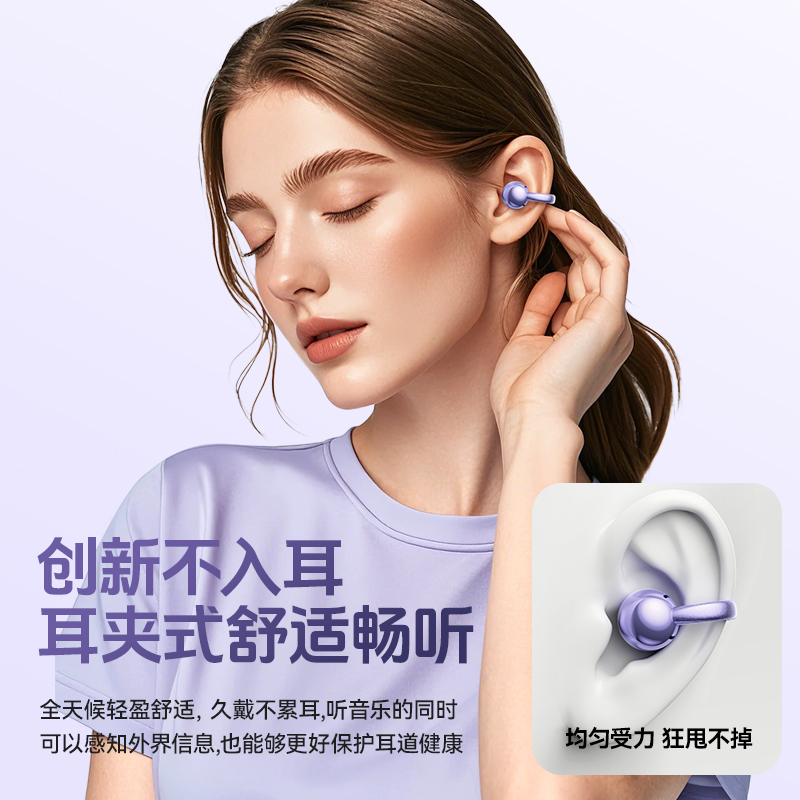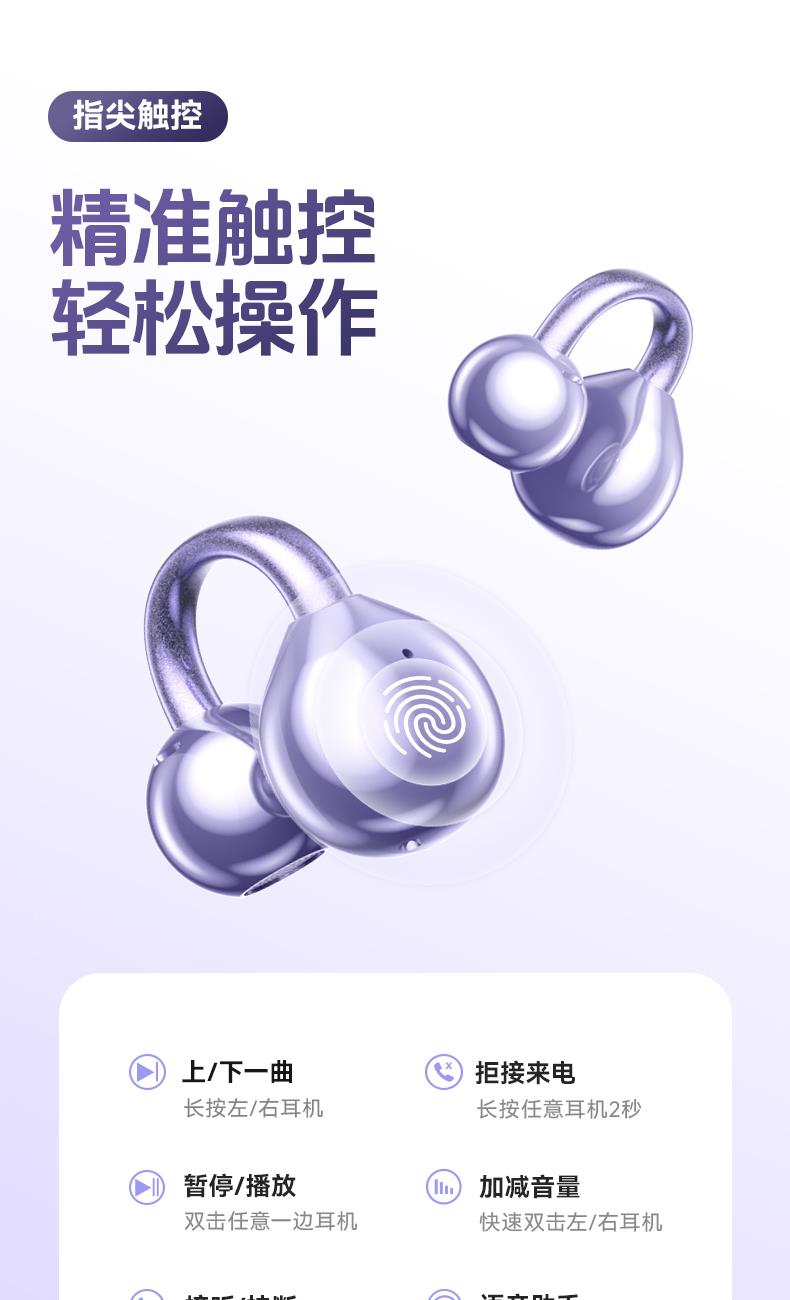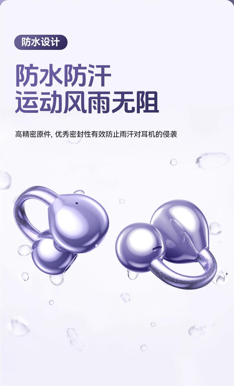 颜色:米色 紫色 黑色 材质:ABS+电镀 容量:耳机30mAh 耳机舱230mAh 包装:彩盒包装 【推荐理由】: 云感耳夹式设计 久戴不累 定向传音技术 V5.4蓝牙版本 智能通话降噪 数字屏电量显示 一目了然 触摸式功能操作