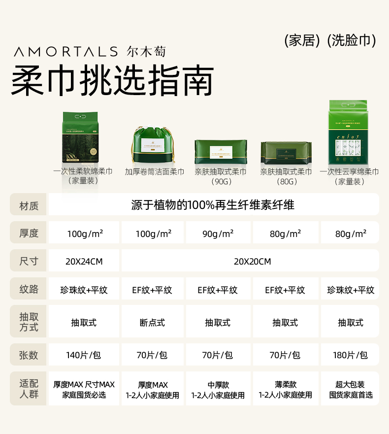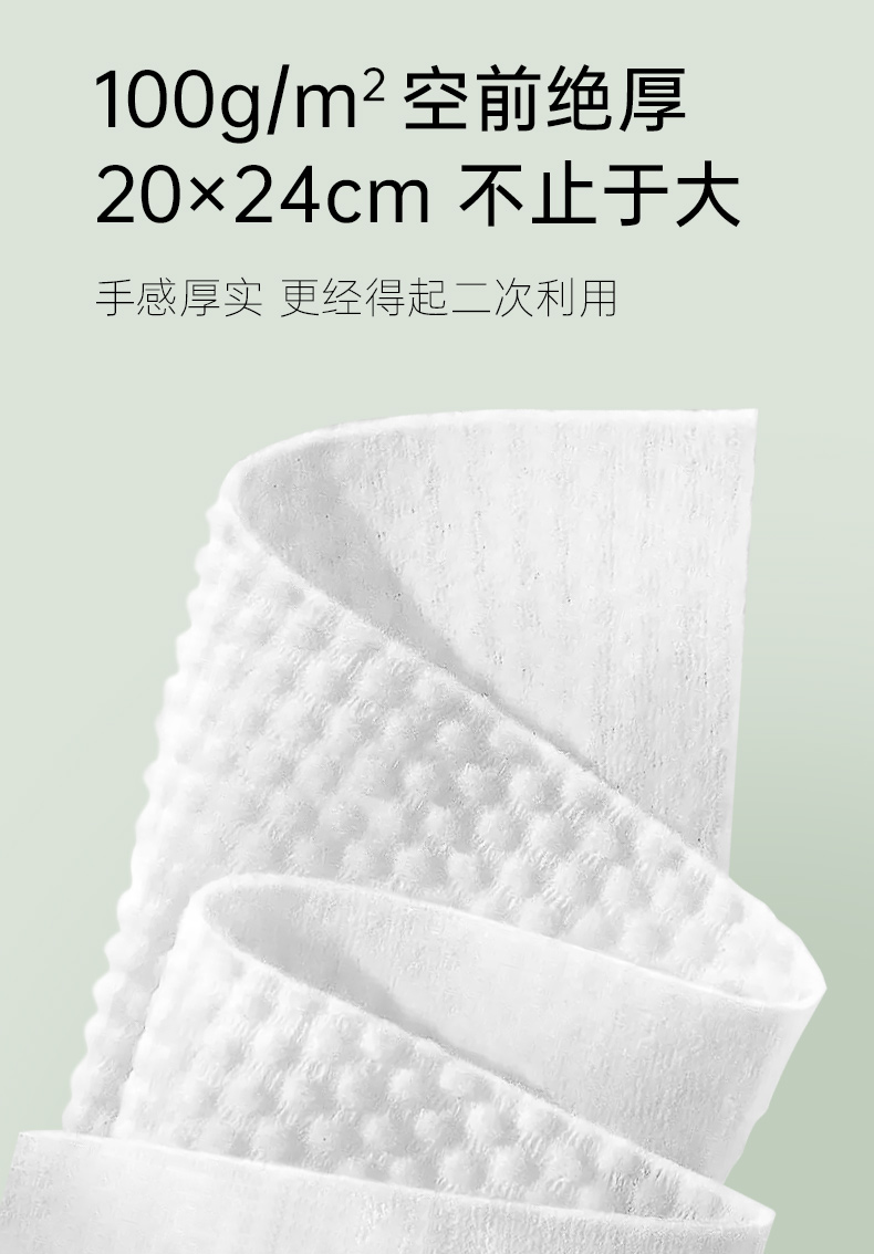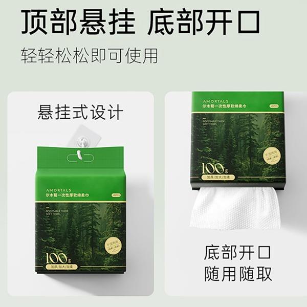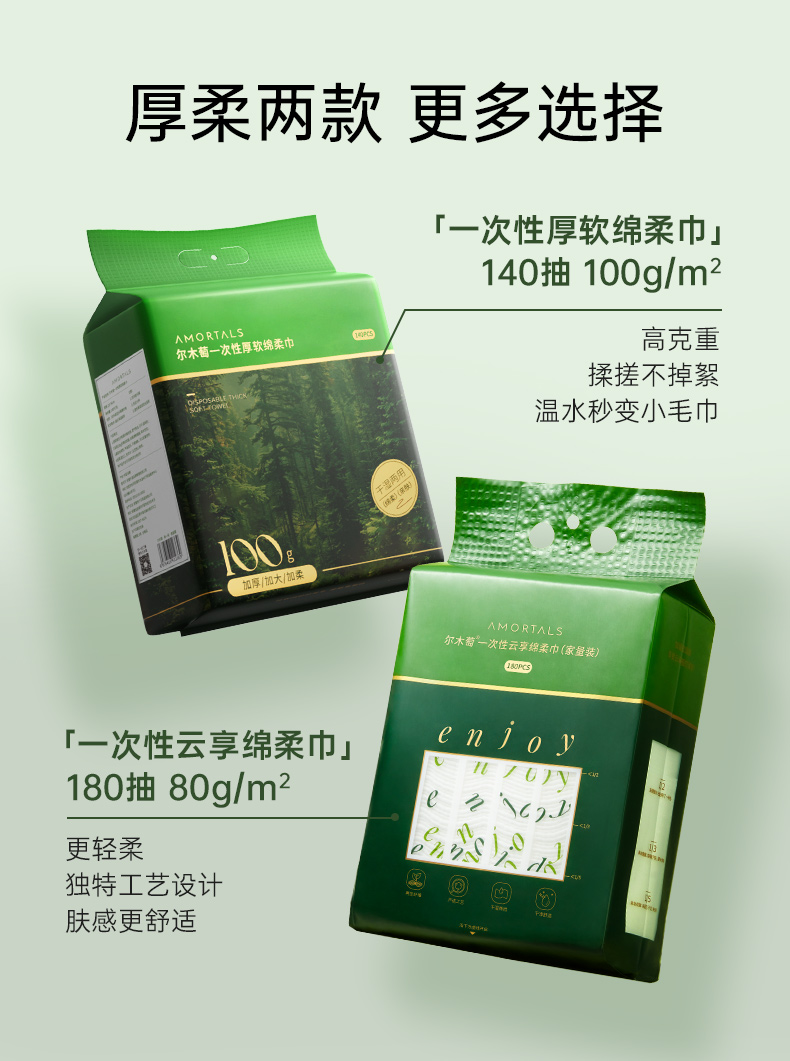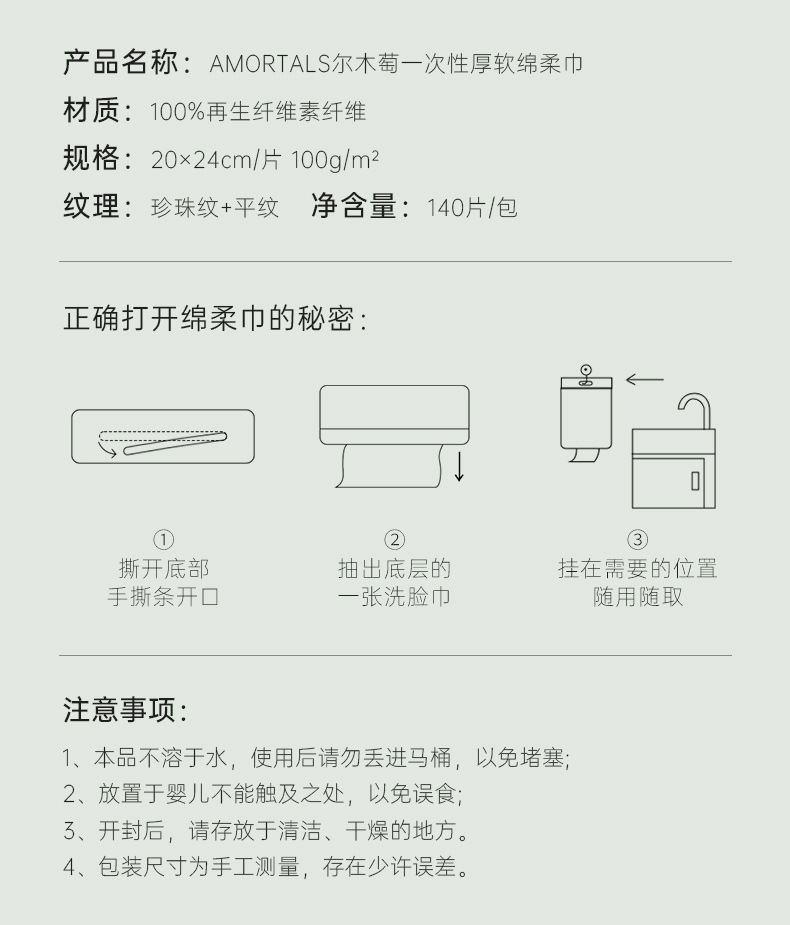 产品:AMORTALS尔木萄一次性厚软绵柔巾 材质:再生纤维素纤维 规格:20x24cm/片 100g/m2 纹理:珍珠纹+平纹净含量:140片/包 加厚100g/m²材质:厚度堪比小方巾,湿水后仍保持强韧,可擦拭3次以上不破裂 珍珠纹压花设计:凹凸表面增强清洁力,卸妆时省力50%,且触感亲肤 悬挂式便捷取用:防水背胶固定,防尘盖设计,抽取不连张,适合浴室潮湿环境 多功能使用:卸妆、洁面、擦镜台均可,敏感肌友好无荧光剂