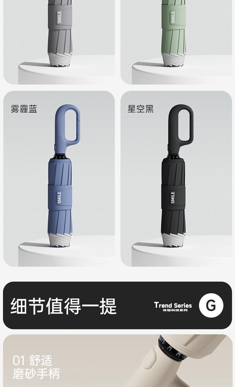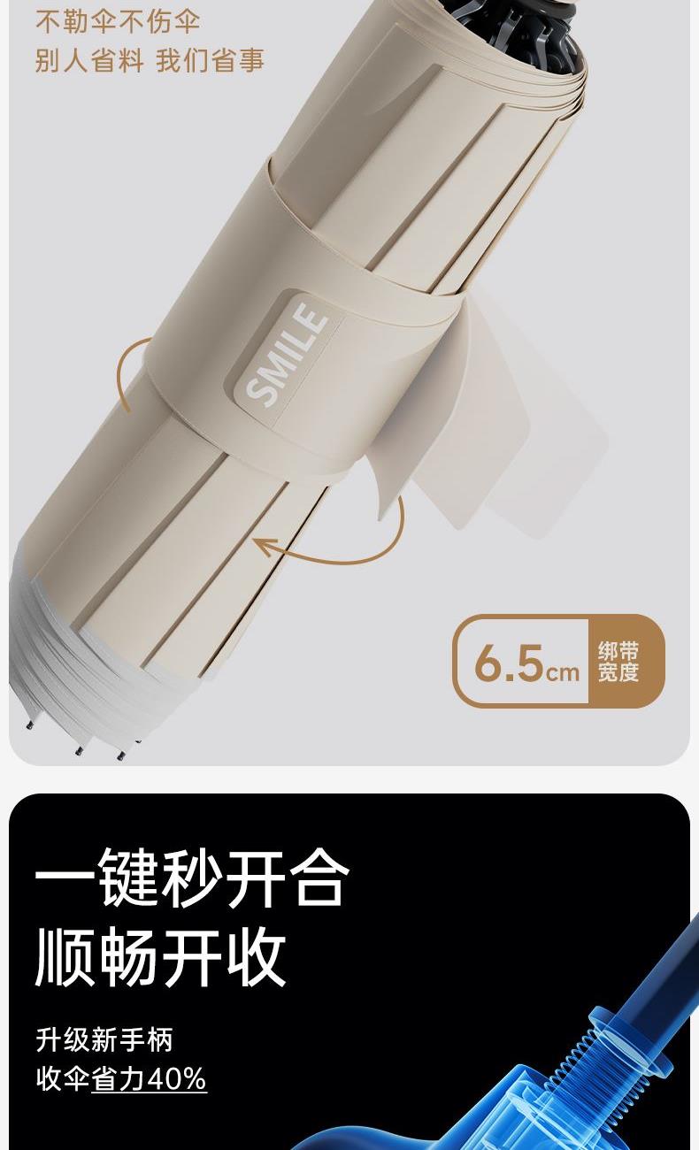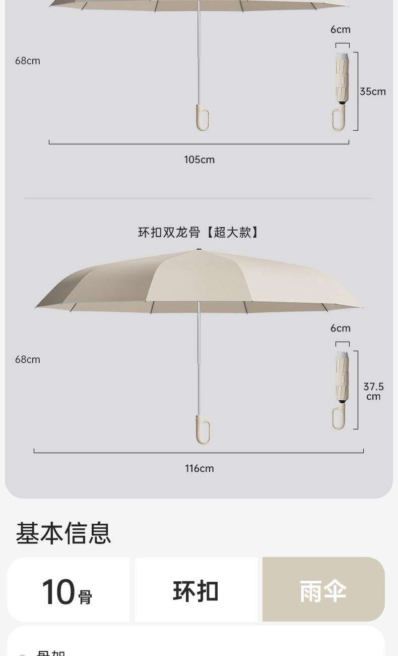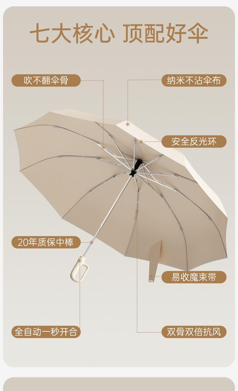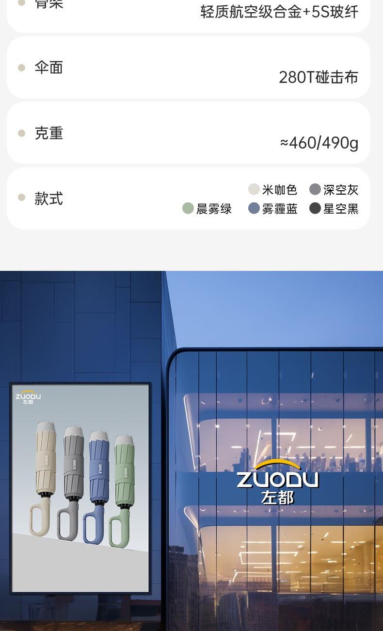 商品货号:ZD210 伞架材质:不锈钢,玻纤 伞面材质:280T超轻布 款式:自动三折 商品参数:直径:105-115cm 高度:68cm 收拢直径:6cm 收拢高度:35cm 商品毛重:0.46-0.49 商品颜色:星空黑 米咖色 晨雾绿 深空灰 雾霾蓝