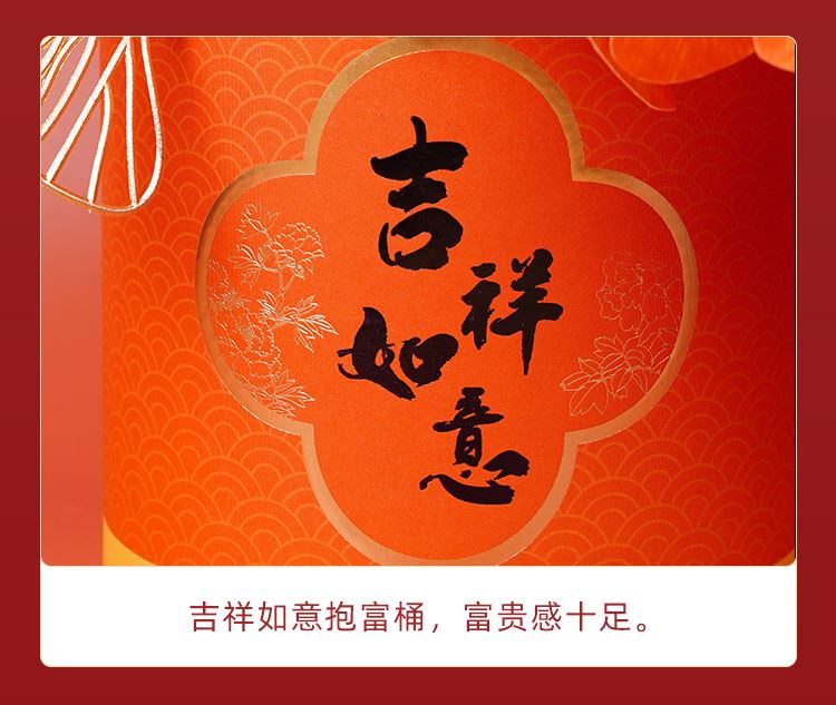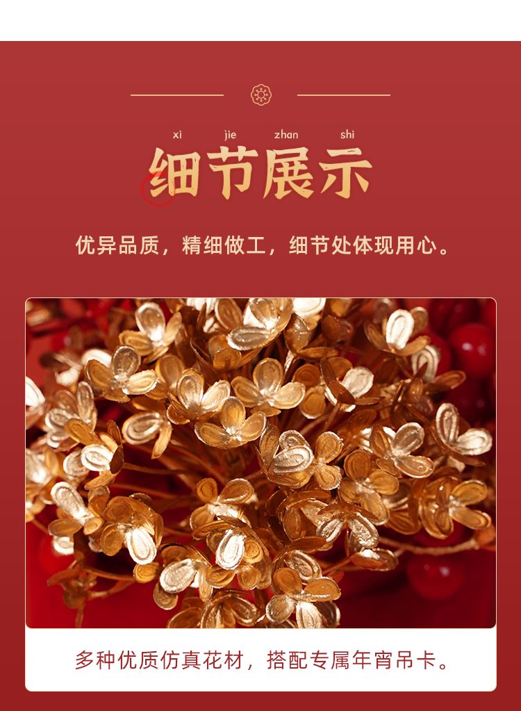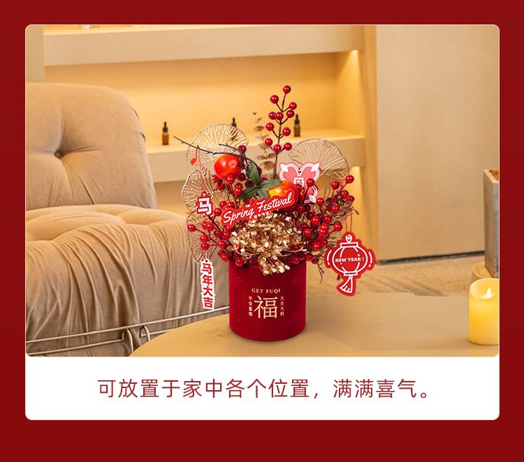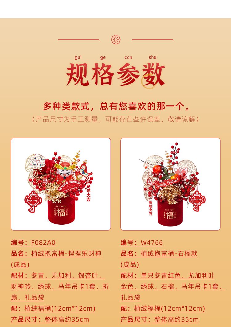 产品:植绒抱富桶-石榴款 编码;W4766 规格 桶:12*12cm 年宵花高度35cm 材料:单只冬青红色、尤加利叶金色、绣球、石榴、马年吊卡1套、礼品袋 注:报价只对应主图款,详情页其他款报价具体联系