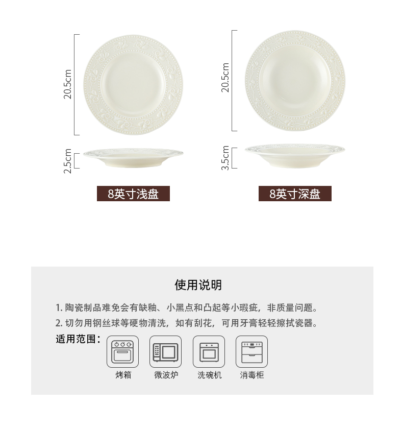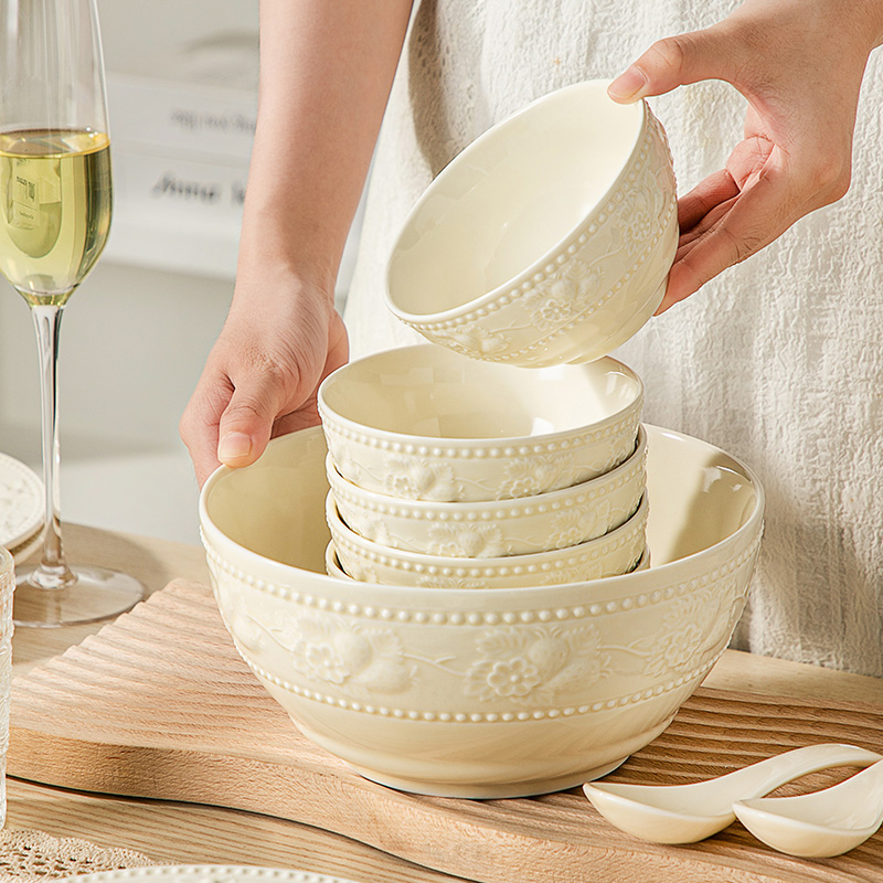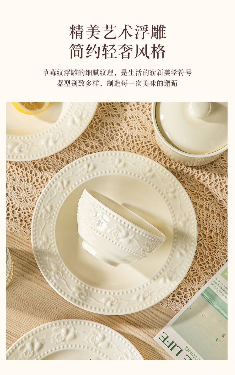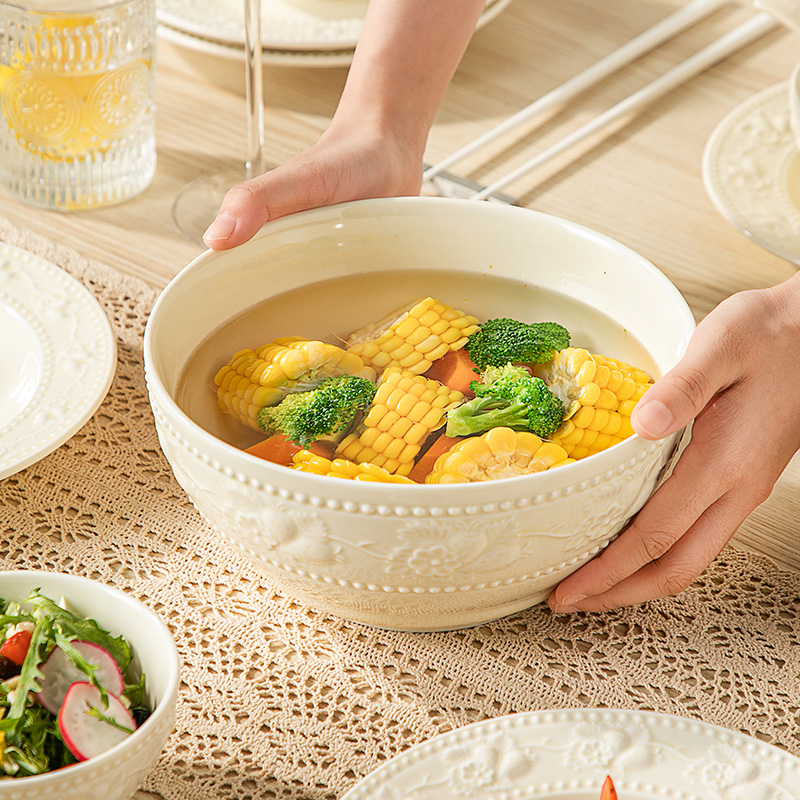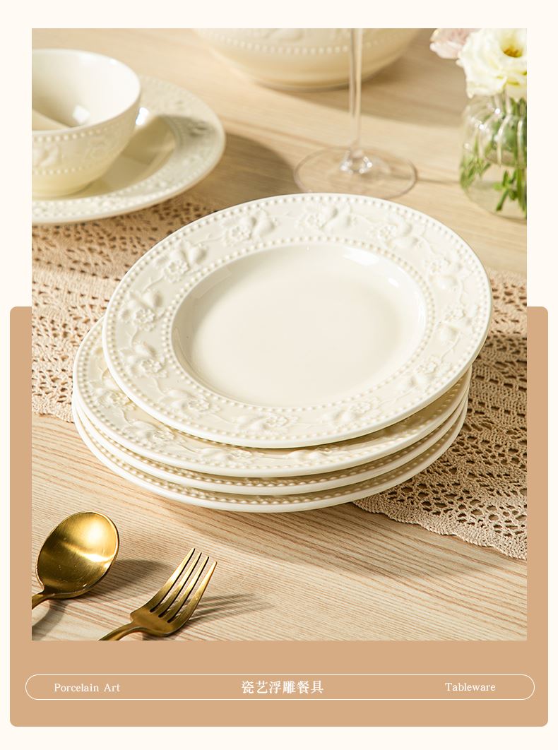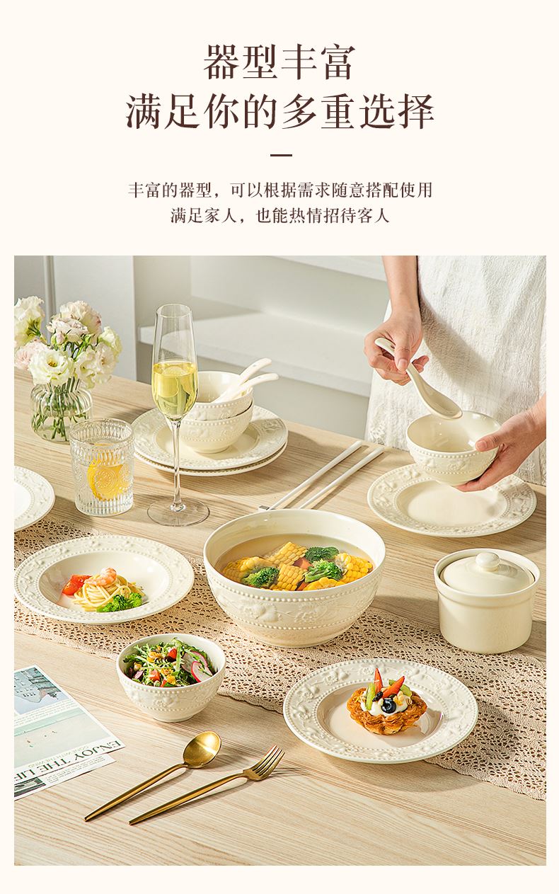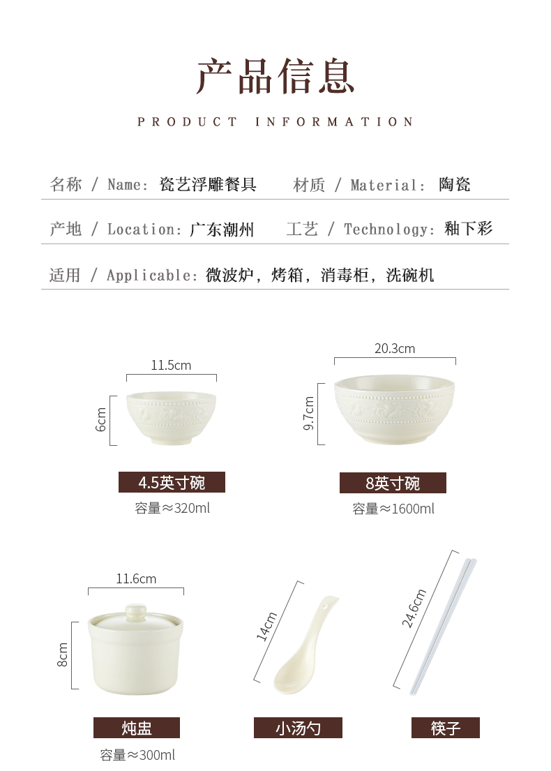 【材质】陶瓷 【颜色】米色 【包装方式】彩盒 【外箱尺寸】404x165x284mm 【重量】7.9kg 【条码】6957929941348 【配置】4.5寸小碗*6,7寸汤碗*2,8寸浅盘*4,8寸深盘*2,勺子*6, 300ml炖盅*2,筷子*6 精选优质陶土,高温烧制,釉面光滑易清洗,省时省力,即刻干净如新,可进烤箱、微波炉,洗碗机,釉下花色永不褪色,更健康,使用更安全; 细腻的浮雕工艺,在餐具上悄然绽放,轻轻触摸,指尖能感知到的脉络纹理,那是匠人们倾注的心血与深情。 优质瓷质,质地温润如玉,不仅触感舒适,更具出色的耐用性。高温烧制让色彩经久不褪,浮雕的立体感历久弥新。清洗时,光滑的表面也能让污渍无所遁形,轻松打理.
