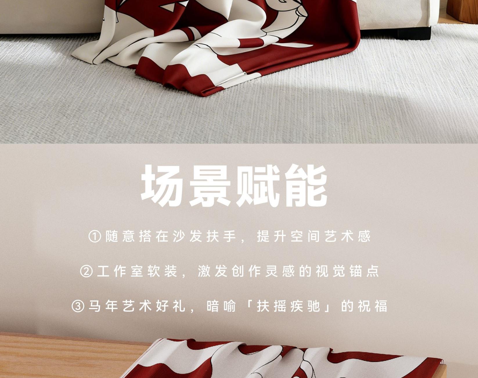 以抽象的线条与块面,勾勒马匹驰骋时的动态瞬间。“艺境驰骋”不止于马的意象,更寓意新年的奔赴与自由。几何化的结构语言,赋予传统生肖当代的艺术表达。 马踏流光,不扰尘寰,乘风而行,心向无际,愿新岁,步履从容如诗 规格: 80x130cm 材质:腈纶 包装尺寸:380*290*90mm