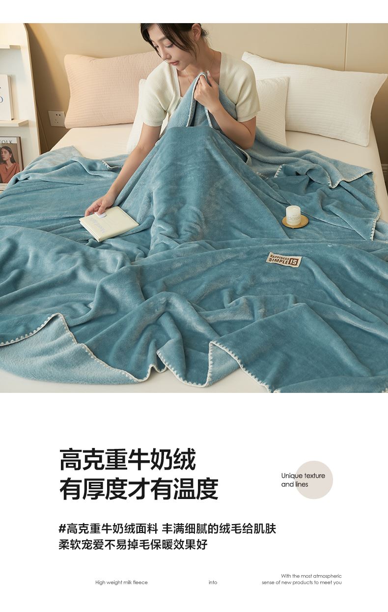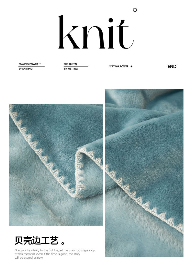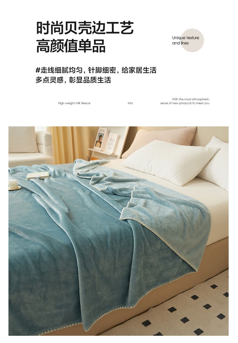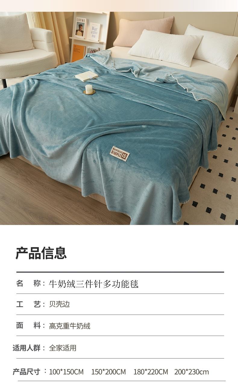 产品规格:200*230cm 花色:水绿 、深灰、藕粉、卡其灰、灰蓝 面料:高克重牛奶绒 产品卖点:高克重牛奶绒面料,丰满细腻的绒毛给肌肤柔软宠爱不易掉毛保暖效果好,时尚贝壳边工艺高颜值单品,走线细腻均匀,针脚细密,彰显品质生活