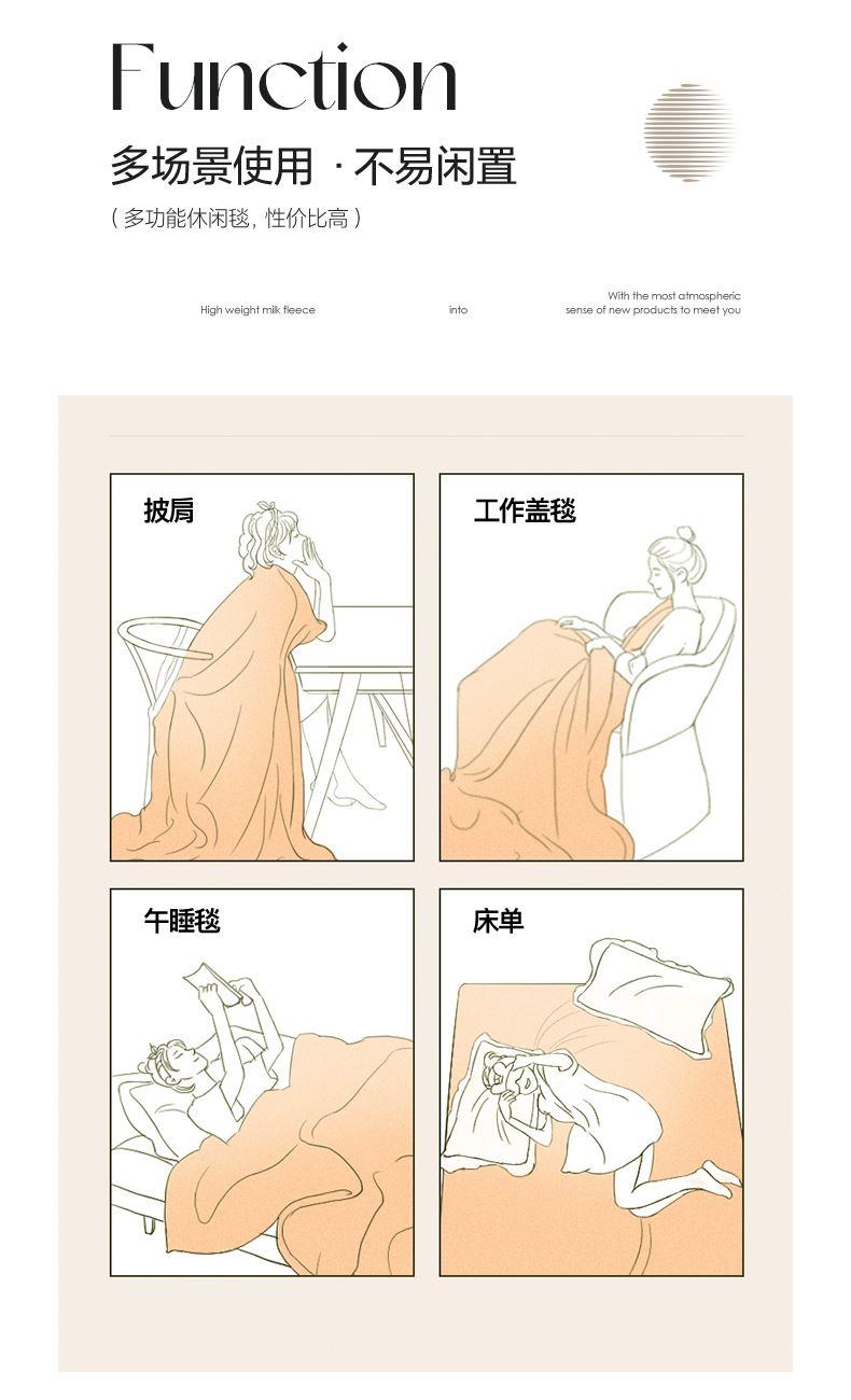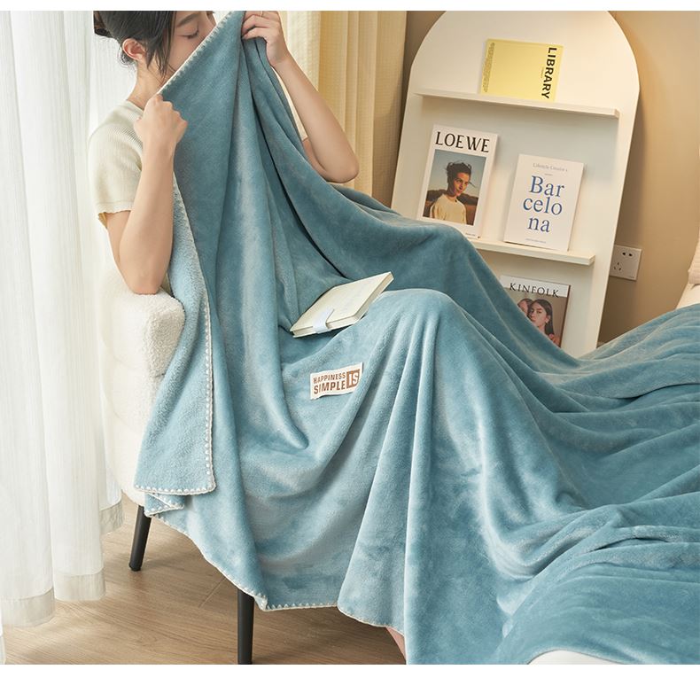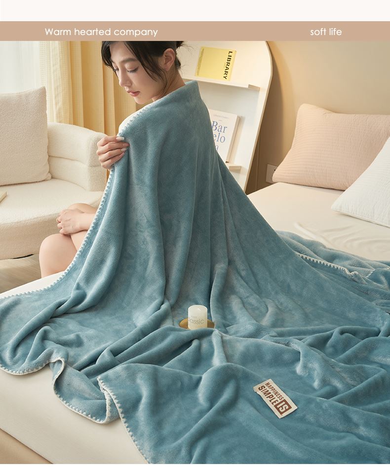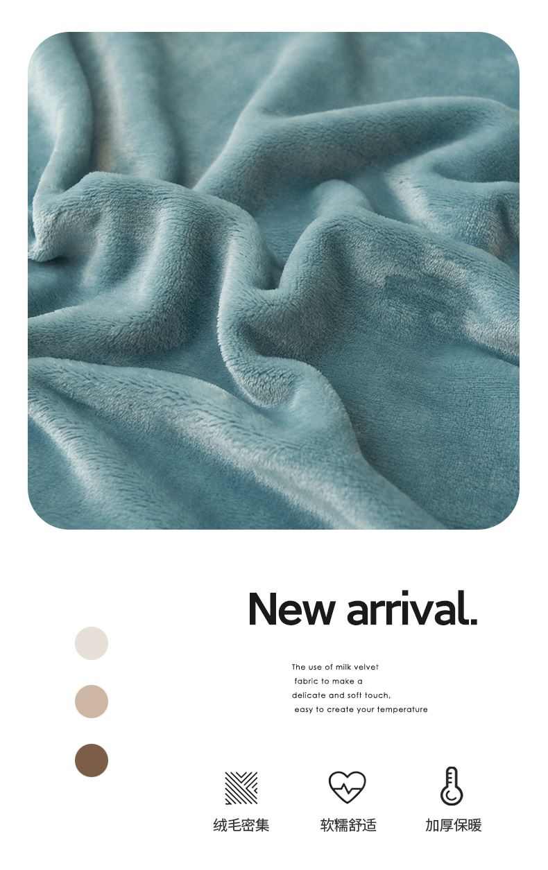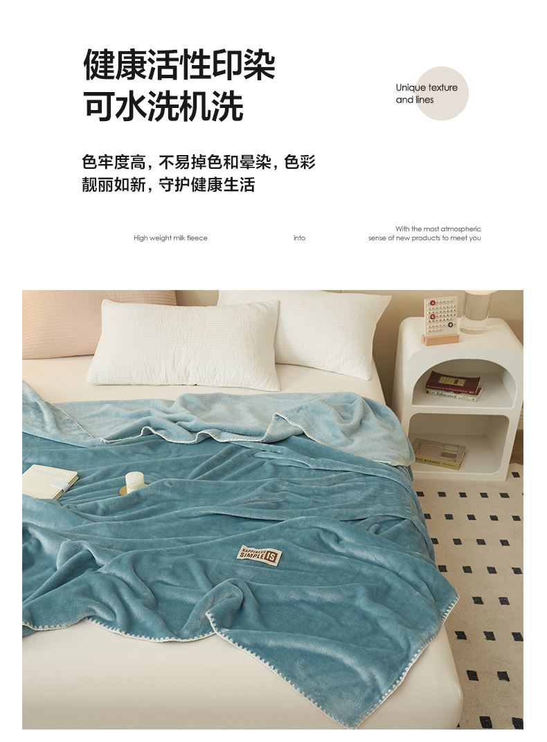 产品规格:200*230cm 花色:水绿 、深灰、藕粉、卡其灰、灰蓝 面料:高克重牛奶绒 产品卖点:高克重牛奶绒面料,丰满细腻的绒毛给肌肤柔软宠爱不易掉毛保暖效果好,时尚贝壳边工艺高颜值单品,走线细腻均匀,针脚细密,彰显品质生活