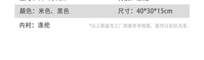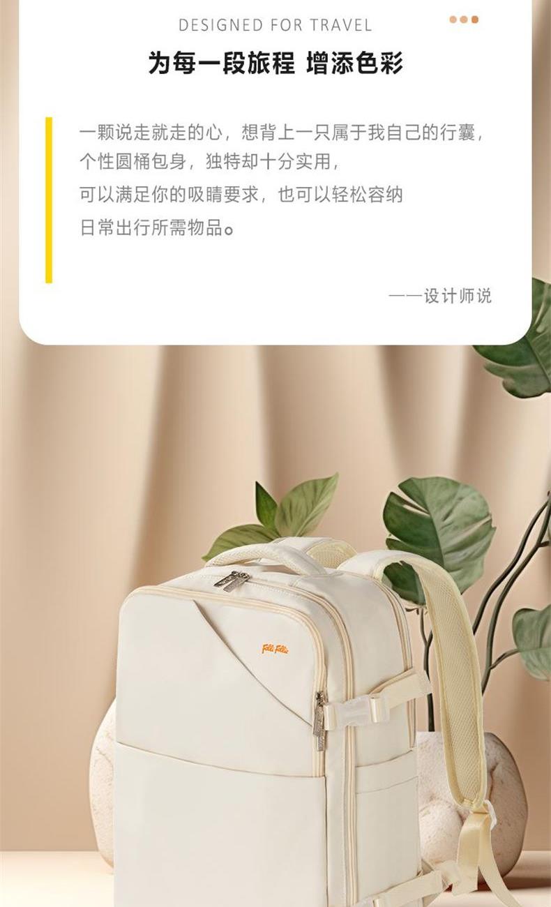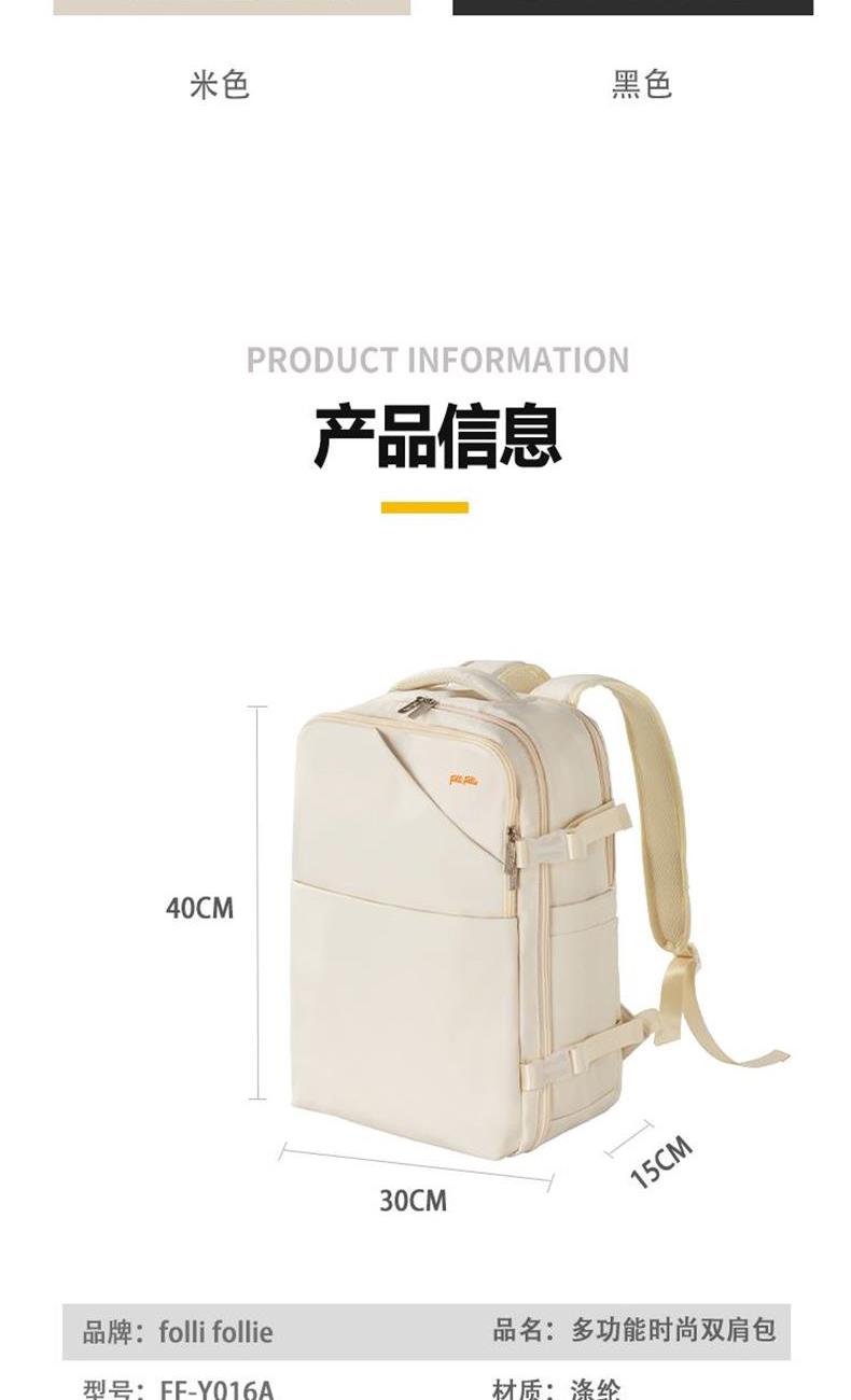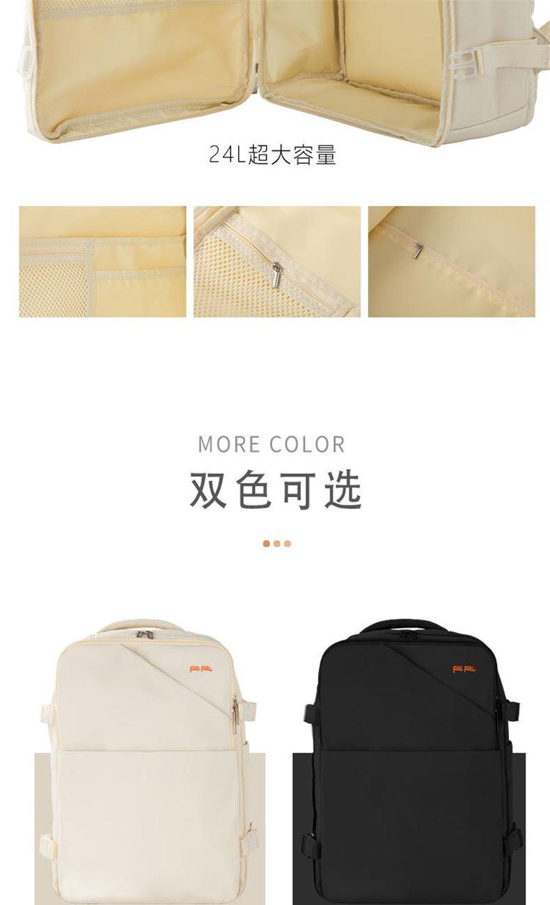 舒适透气肩带,贴合背部,缓解压力,背负更轻松 24L宽幅大容量的设计 搭配饱满的色彩青春活力 舒适时刻在线潮流休闲 玩转出行 面料升级版防泼耐刮划,全新耐磨防泼水面料 柔软质感 日常易打理 型号: FF-Y016A 面料材质:290斜纹复合 里布材质:210D涤纶面料 尺寸: 29*18*42cm 颜色:黑色/米白色 结构:主袋,内置拉链袋,内插袋,前置拉链袋