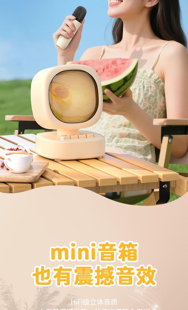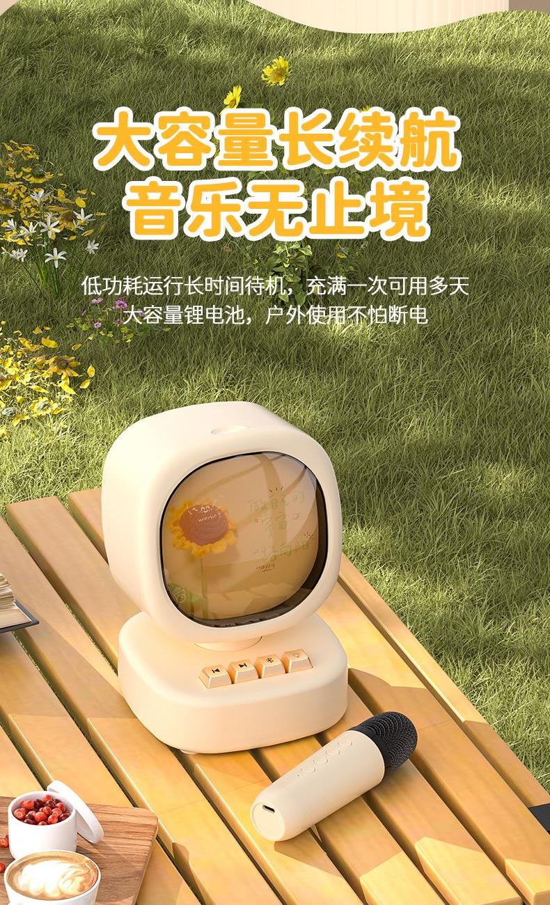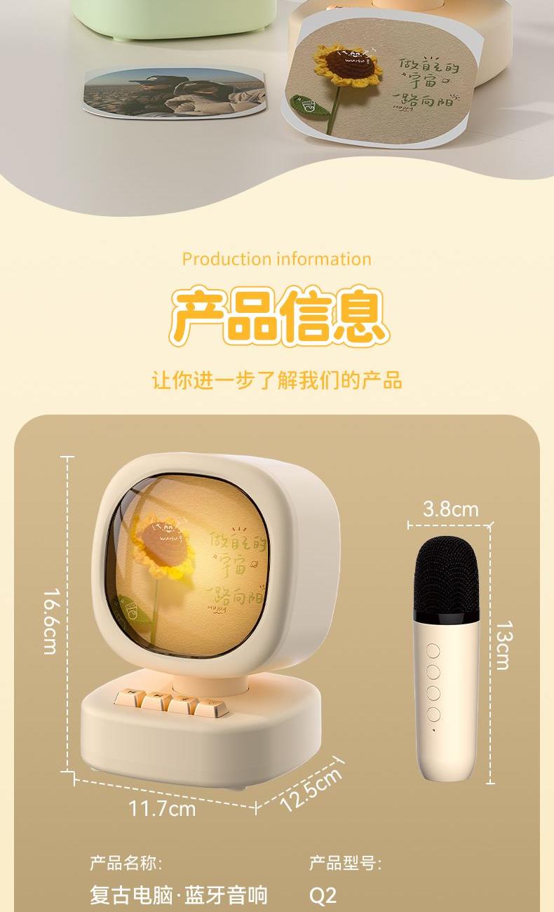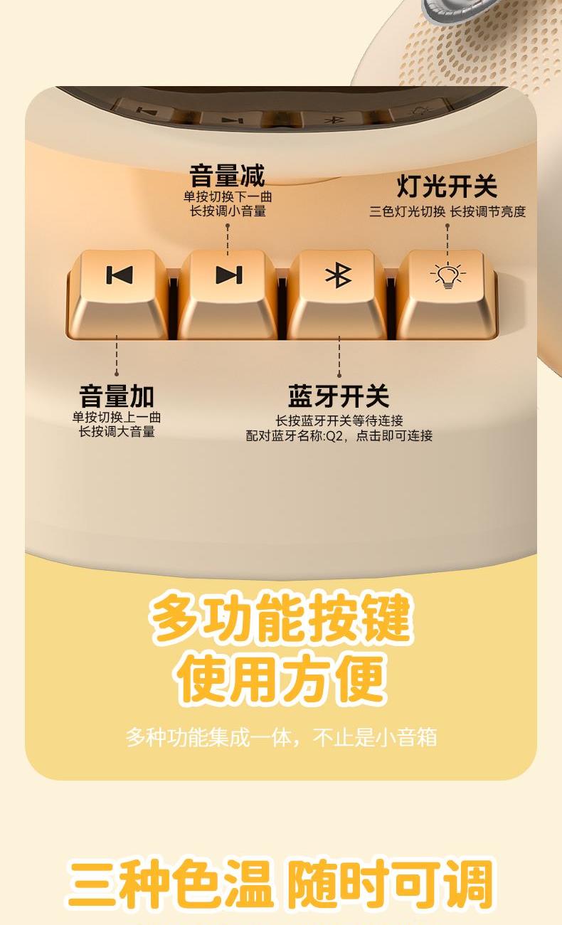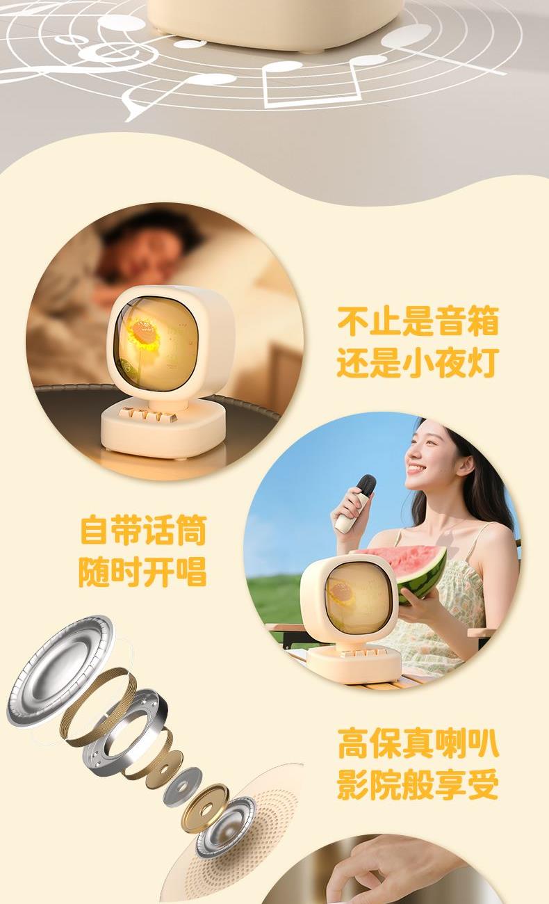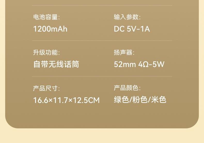 颜色:卡其色、浅粉色、绿色 供电方式:Type-C充电 电池容量:1200mAh 主机包装:125*117*166mm/520g 彩盒尺寸:16*12.5*17cm 外箱尺寸:62.5*50*53cm/40台/23kg 产品标配:彩盒、主机、卡片*2、麦克风*2、说明书、数据线 时尚创意,可替换灯片 蓝牙5.0,兼容IOS、鸿蒙、安卓系统 音质清晰清澈,温润自然 温馨夜灯,即是音箱也是小夜灯 配2支麦克风,K歌娱乐自动连接