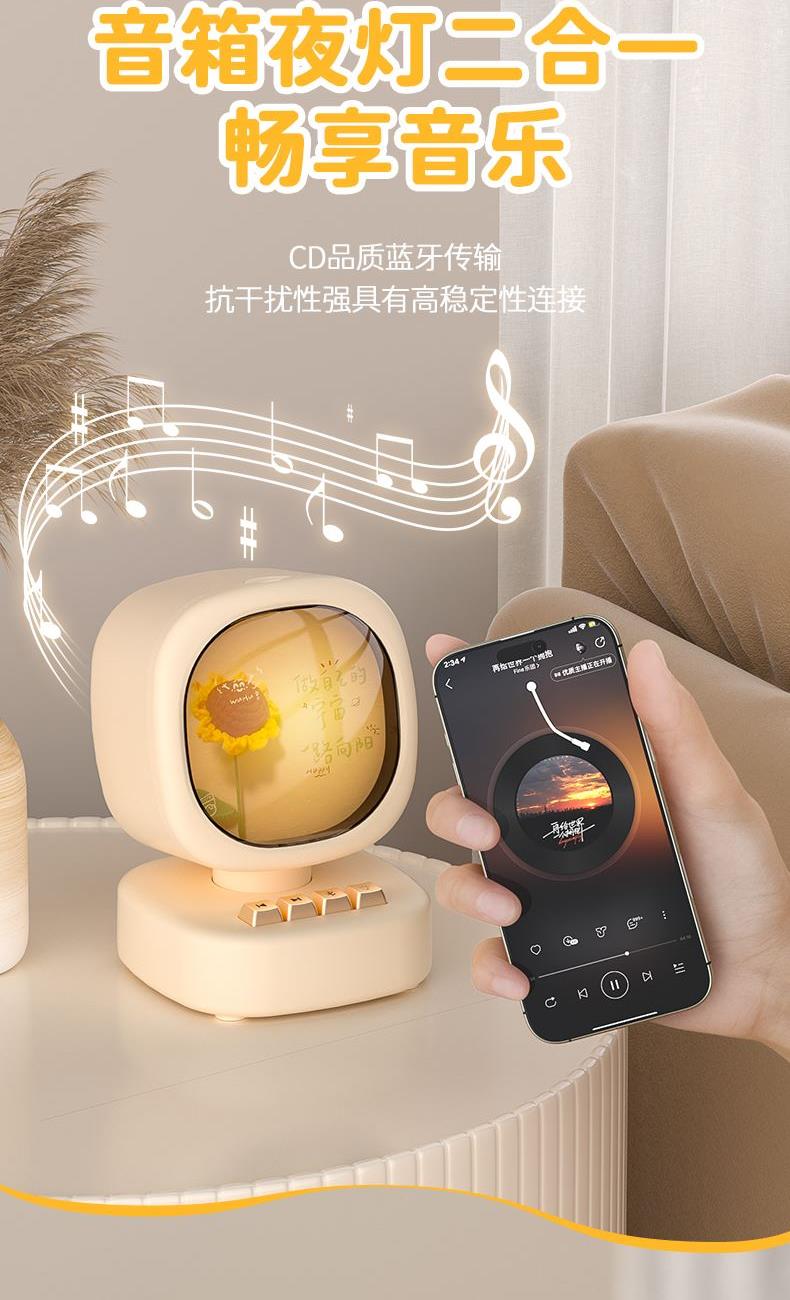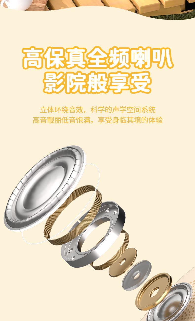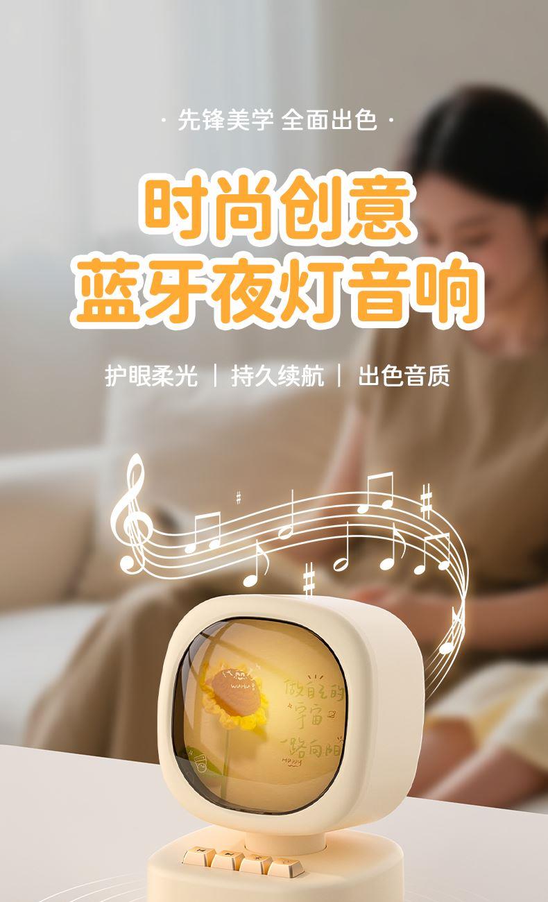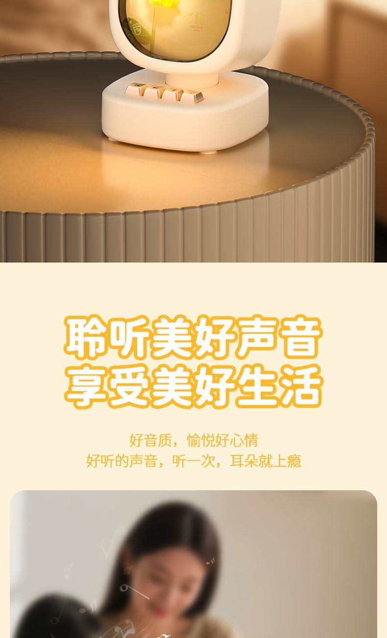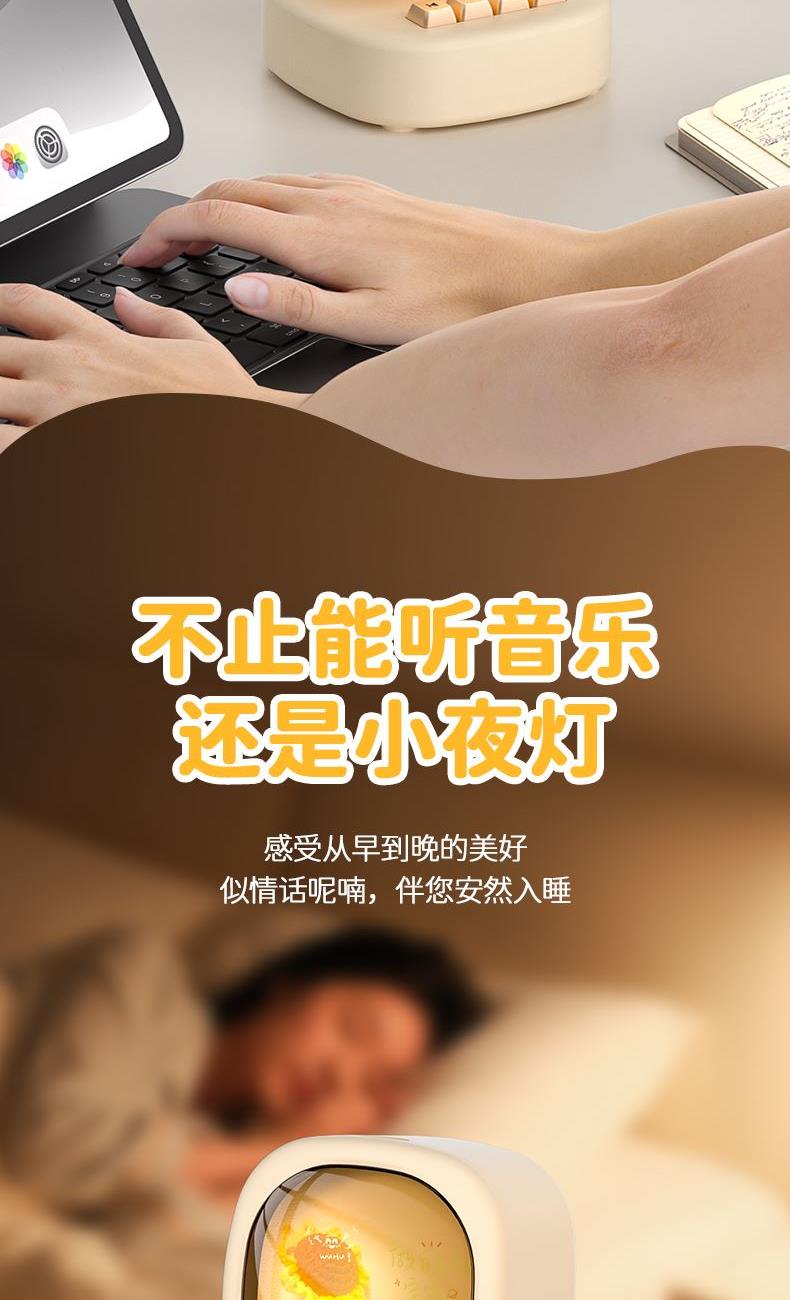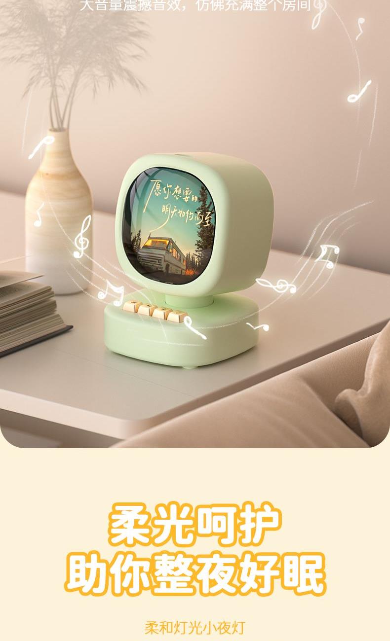 颜色:卡其色、浅粉色、绿色 供电方式:Type-C充电 电池容量:1200mAh 主机包装:125*117*166mm/520g 彩盒尺寸:16*12.5*17cm 外箱尺寸:62.5*50*53cm/40台/23kg 产品标配:彩盒、主机、卡片*2、麦克风*2、说明书、数据线 时尚创意,可替换灯片 蓝牙5.0,兼容IOS、鸿蒙、安卓系统 音质清晰清澈,温润自然 温馨夜灯,即是音箱也是小夜灯 配2支麦克风,K歌娱乐自动连接