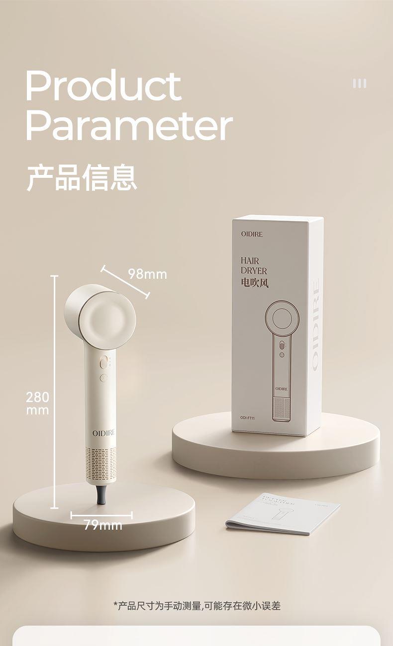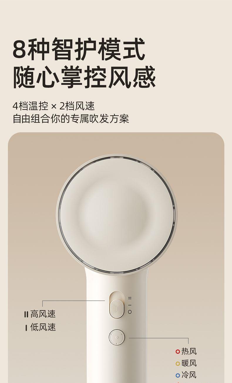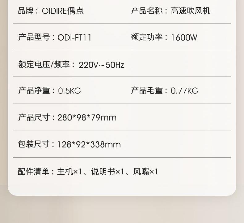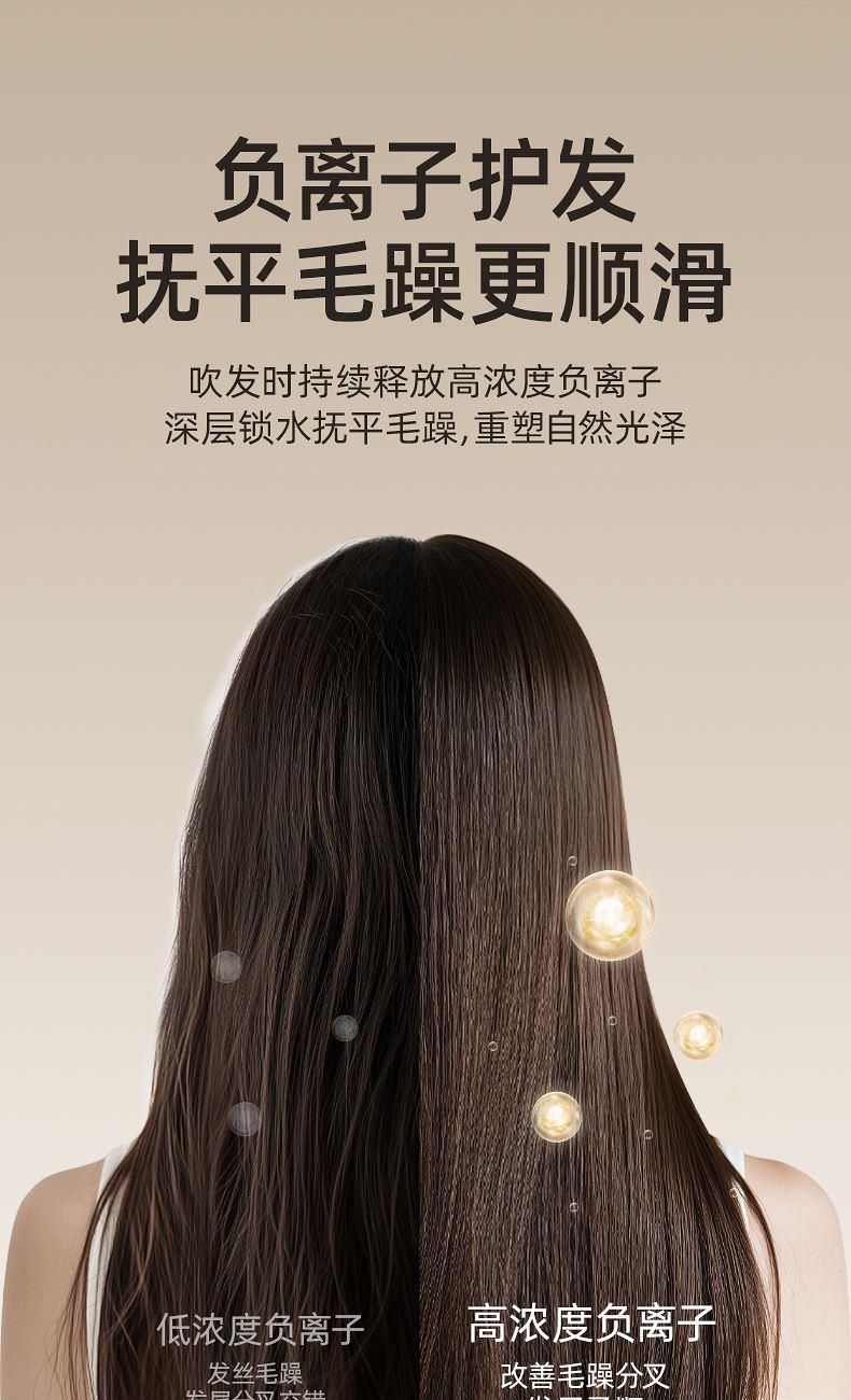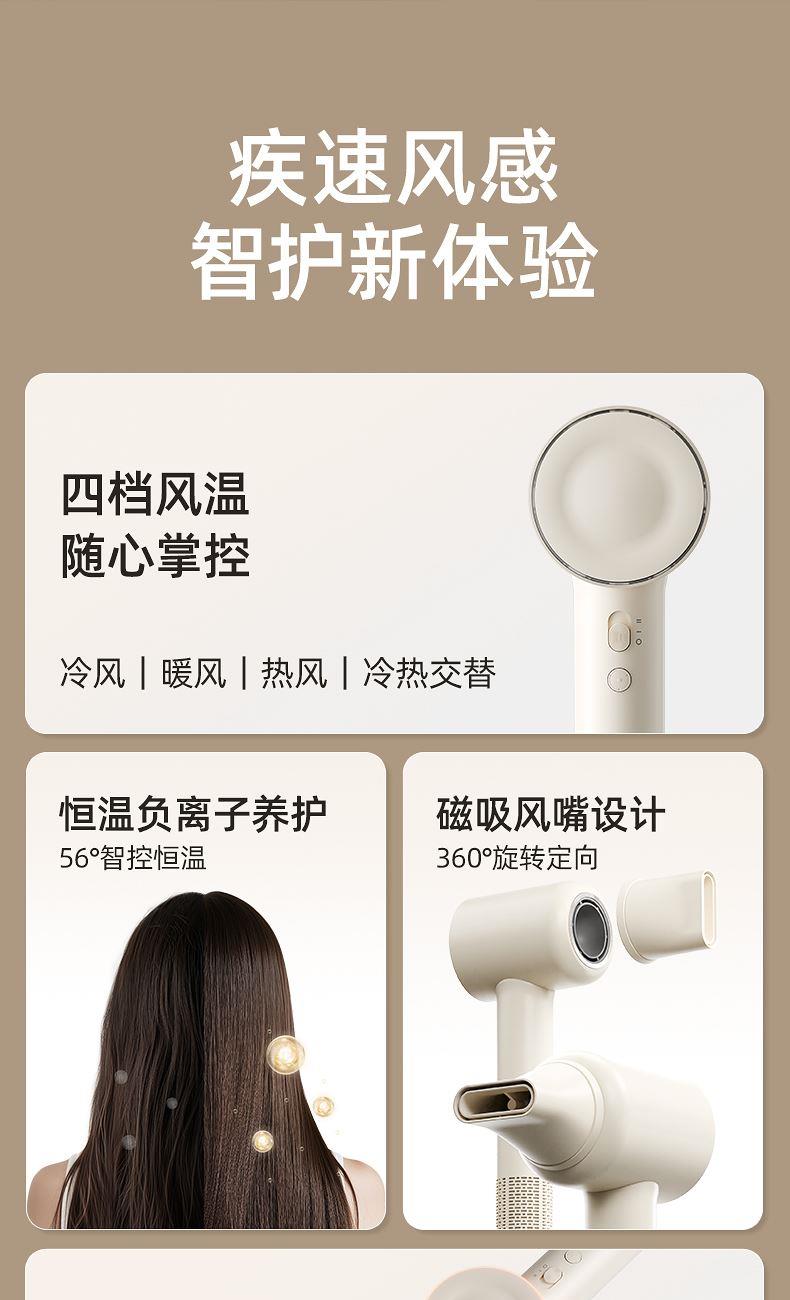 主要材质:ABS+PC 电压:220V 功率:1600W 1、恒温负离子护发,呵护头发安全 2、风嘴磁吸可拆卸设计 3、直流无刷电机,高转速可达110000转 4、双档位风速选择 5、四档功能选择,温风56℃,热风80℃