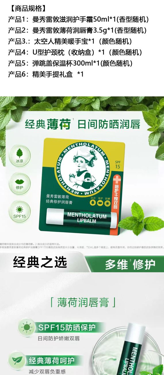 产品1:曼秀雷敦滋润护手霜50ml*1(香型随机) 产品2:曼秀雷敦薄荷润唇膏3.5g*1(香型随机) 产品3.:太空人精美暖手宝*1(颜色随机) 产品4:U型护颈枕(收纳盒)*1(颜色随机) 产品5:弹跳盖保温杯300ml*1(颜色随机) 产品6:精美手提礼盒 *1 这套产品包含一系列实用的生活用品,以满足您在日常生活中的多样化需求。 曼秀雷敦滋润护手霜和薄荷润唇膏呵护您的双手和双唇,提供持久保湿和清新口感。太空人精美暖手宝在寒冷季节为您提供温暖陪伴,而U型护颈枕则有效缓解颈部疲劳。 弹跳盖保温杯则保证了热饮的温度,精美手提礼盒则方便收纳和赠送亲朋好友。 这套产品旨在为您的生活带来便利与舒适。