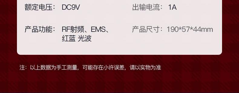 产品参数: 产品型号:CP-P6 额定电压:9V⎓ 额定功率:15W 电池容量:650mAh 产品尺寸 : 95X66X203mm(含底座) 包装尺寸:186X223X72mm 商品条码 : 6972831860228 产品毛重 : 780g 包装清单:主机x1、电源适配器x1、充电底座x1、说明书x1 核心卖点: 1、深层洁肤,打造细腻肌肤 2、营养导入,高效美容,效果翻倍 3、眼部护理,绽放“睛”彩双眸 4、深入肌肤,纵享肌肤弹润如初 5、红光嫩肤,温热护理 6、蓝光冰敷,镇定肌肤