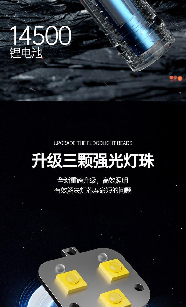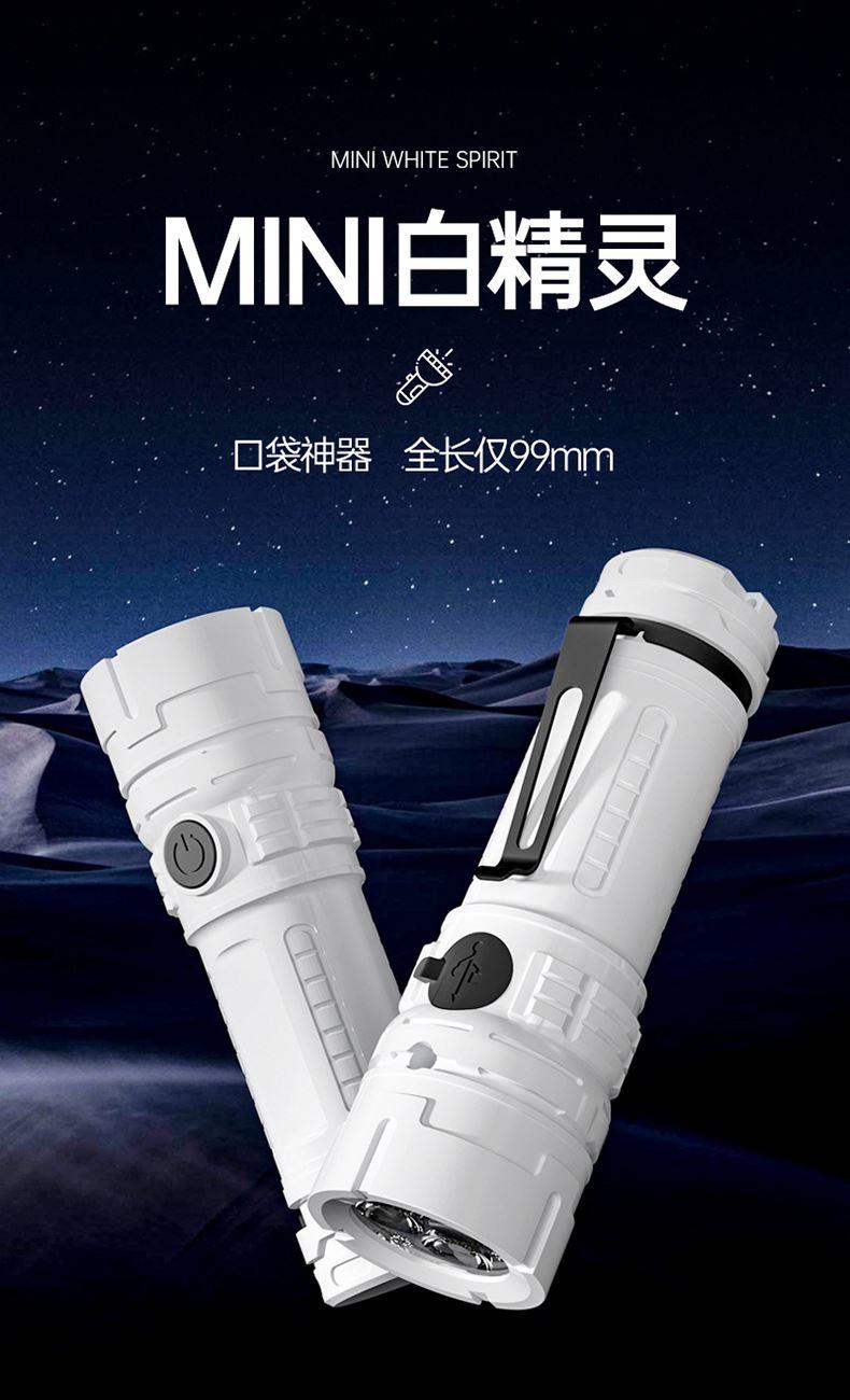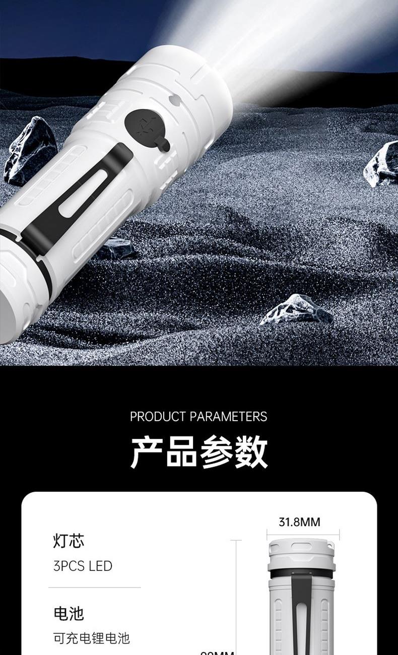 材质 ABS材质 LED灯珠 颜色 白色 尺寸 Φ32*99mm 包装尺寸:40*35*100mm 重量 38g 电池 3.7V/400MAH锂电池,TYPE-C 配件 数据线、包装盒 高亮、低亮、爆闪三挡调节 14500锂电池,TYPE-C接口充电 3PCS LED耐用灯珠照明, 迷你轻巧便携,携带方便,