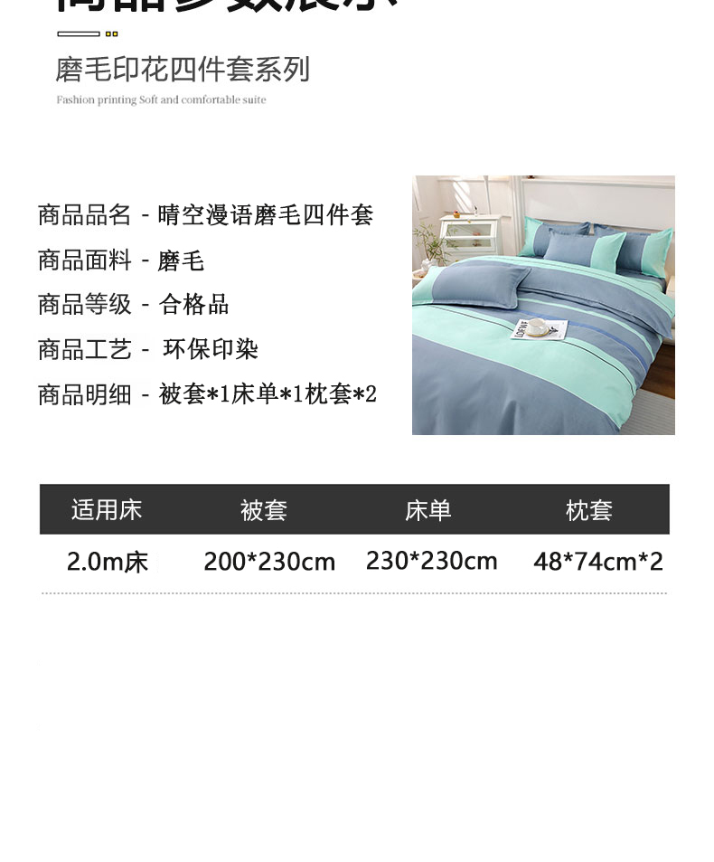 被套:200*230cm 床单:230*230cm 枕套:48*74cm*2 面料:磨毛 产品包装:精美礼盒 包装尺寸:42*33*11cm 1.磨毛面料柔软、温暖、舒适,而且磨毛产品不会 褪色、起球。 2.通过经精湛的磨毛工艺,使得手感柔软、舒适。